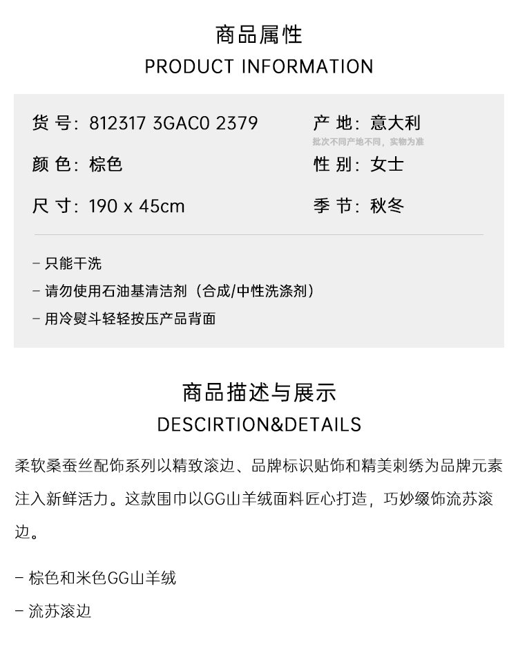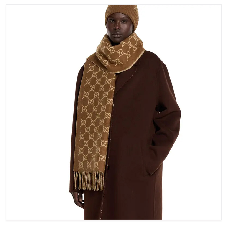 GUCCI 古驰 女士GG山羊绒围巾 棕色 812317 3GAC0 2379