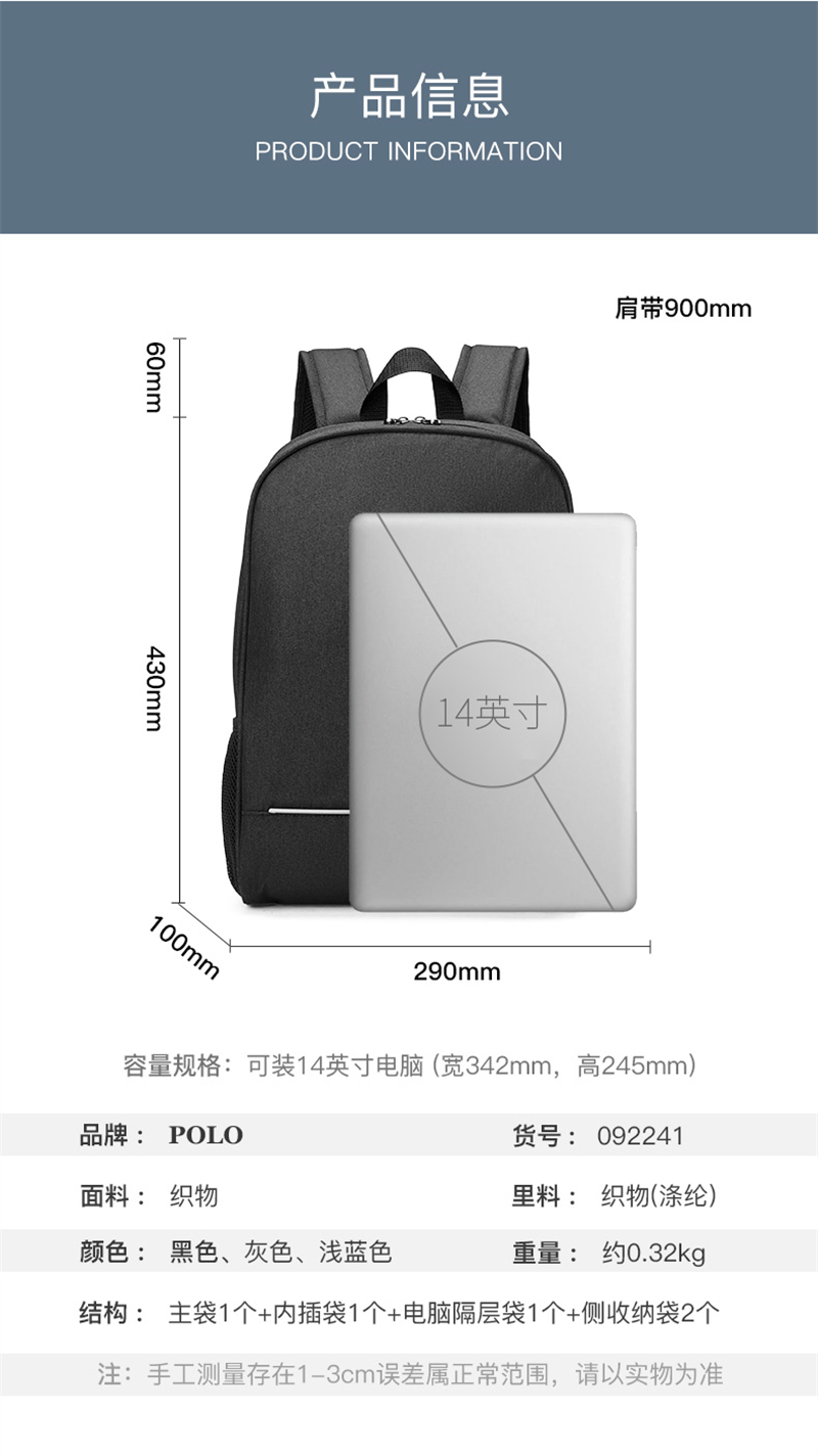 POLO 双肩包防泼水潮流男女通用背包学生书包092241