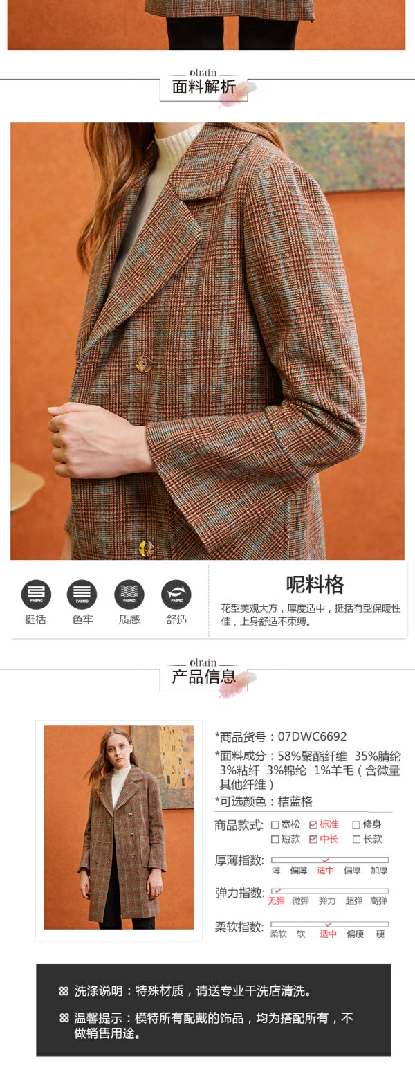 欧芮儿秋冬装 翻领喇叭袖大衣女格子毛呢外套女中长款