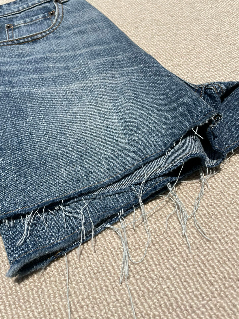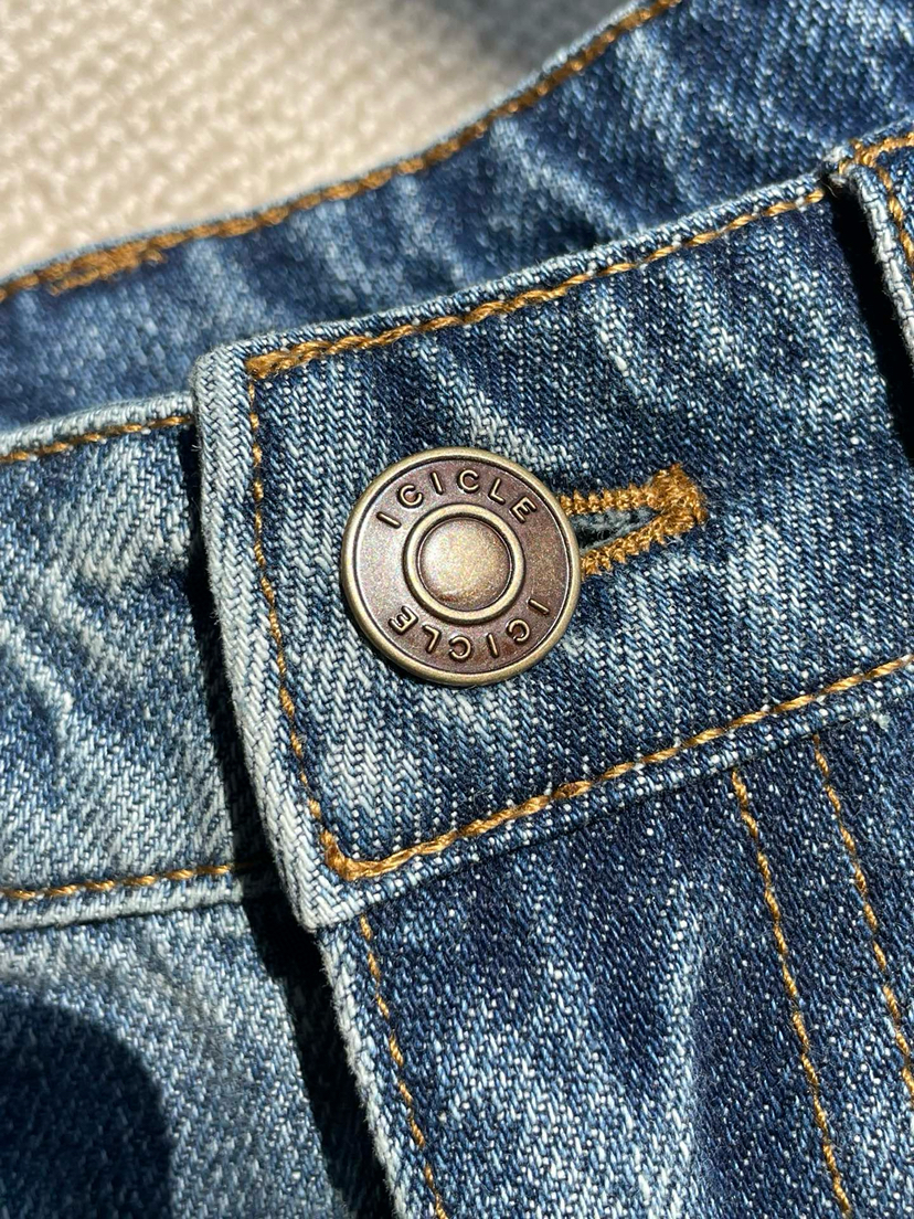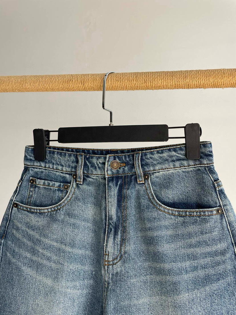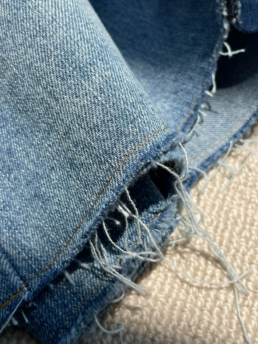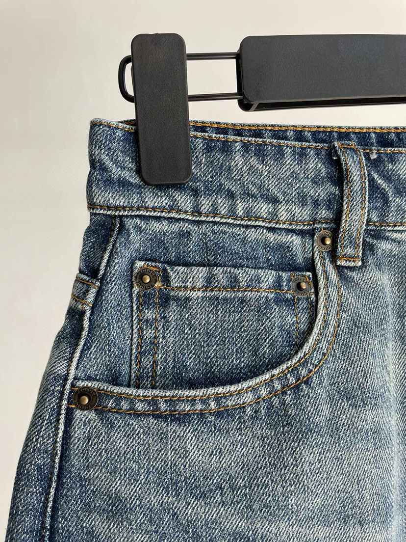 所有的纽扣铆钉,都是客供,无替换,毛边的裤腿,自然随性复古自由,增添了一份不羁的时尚态度。口袋真的好看,还有个一个小切口,这样就更显臀型,臀型更好。