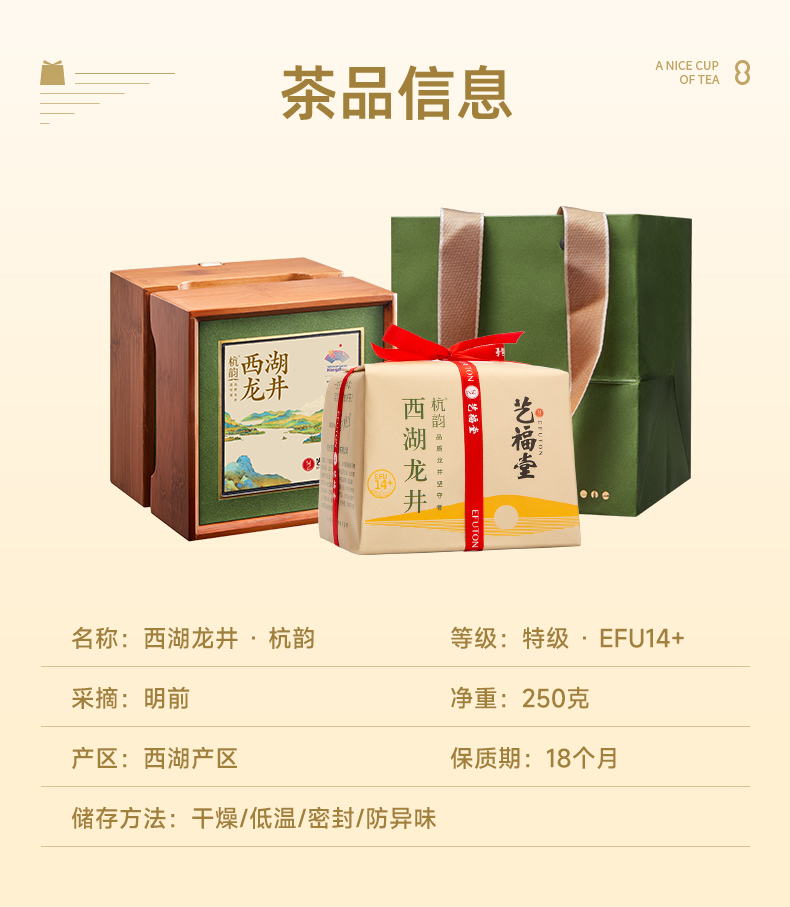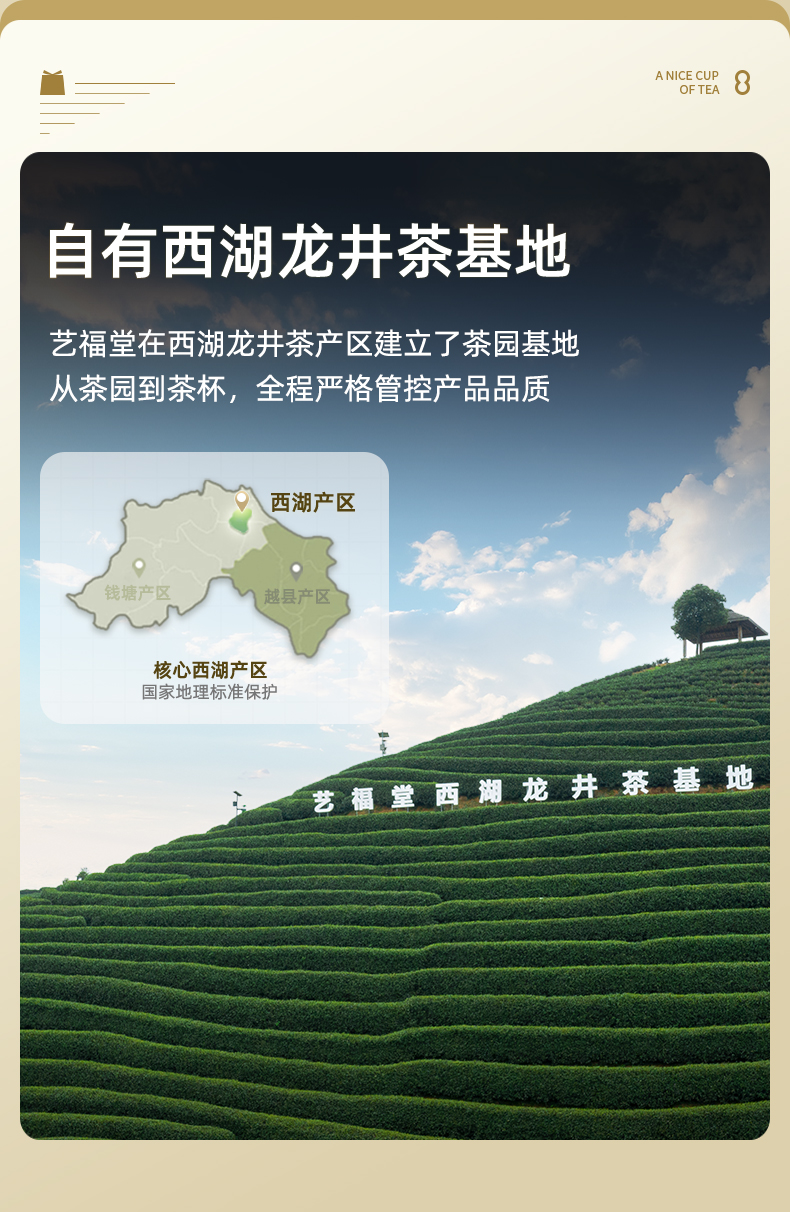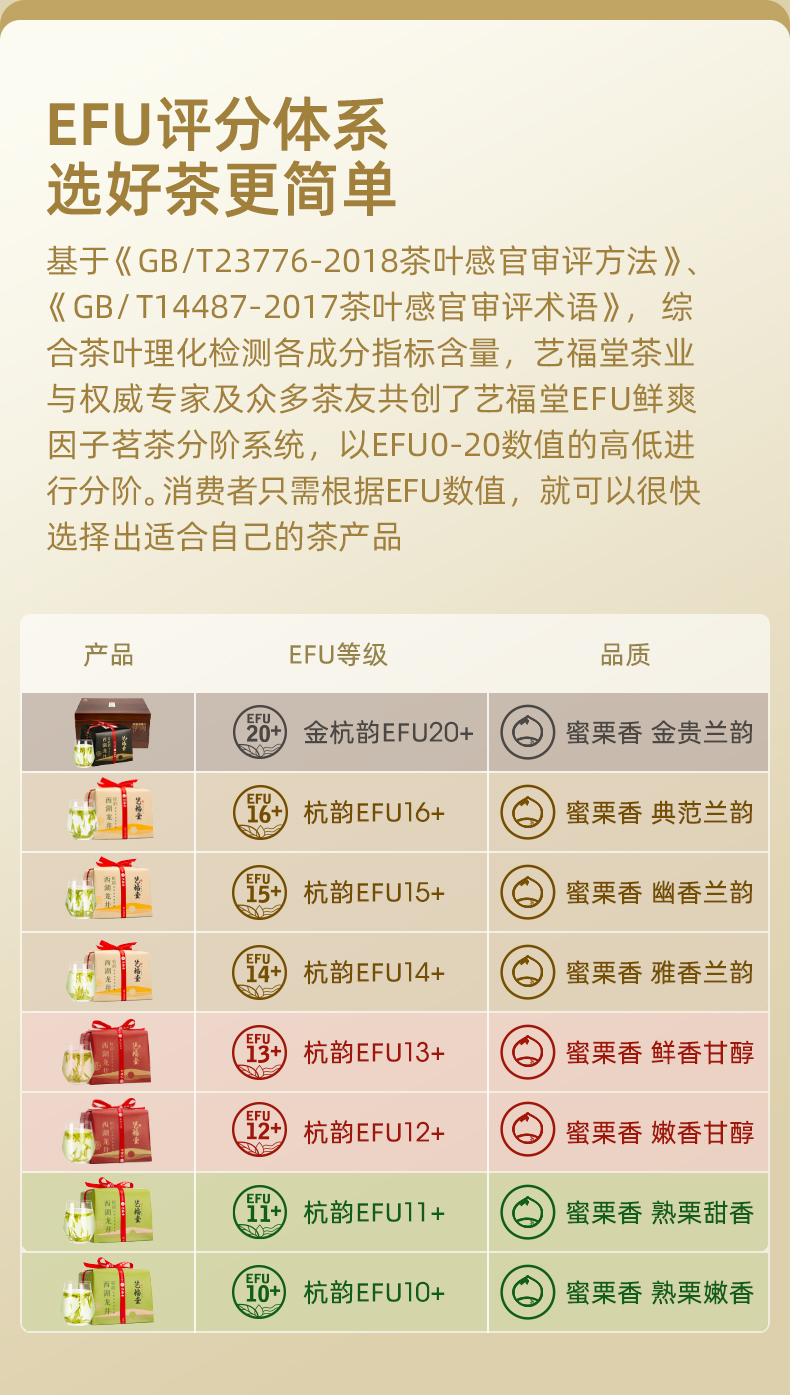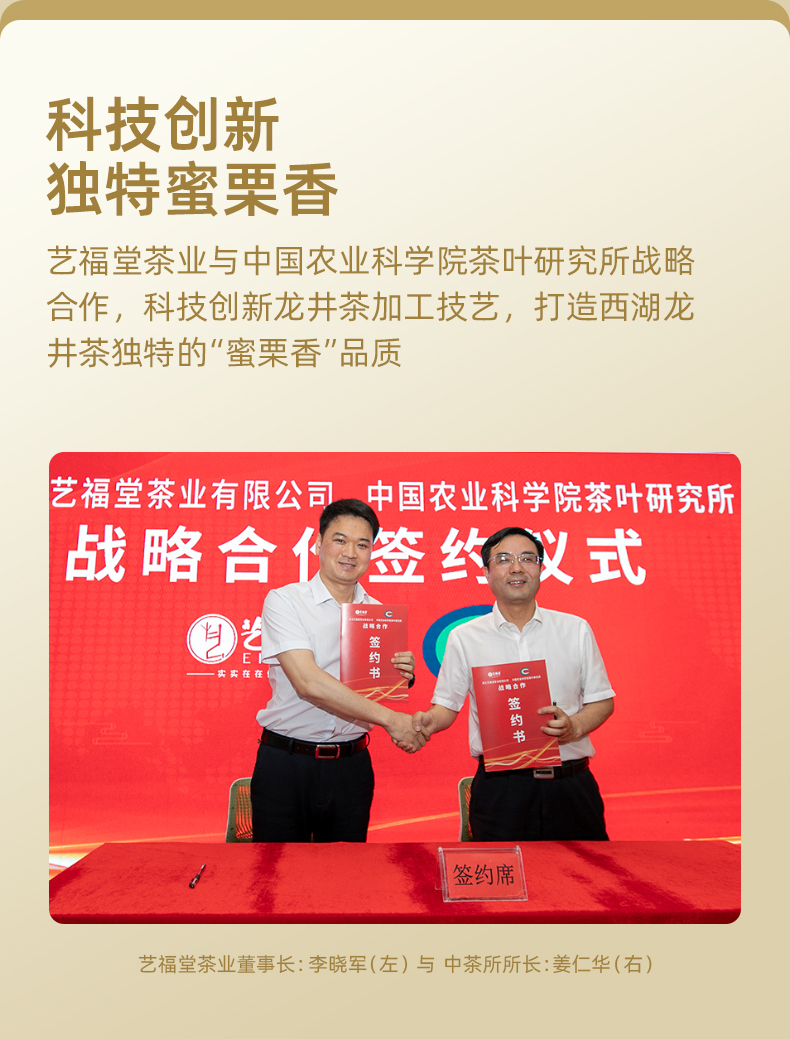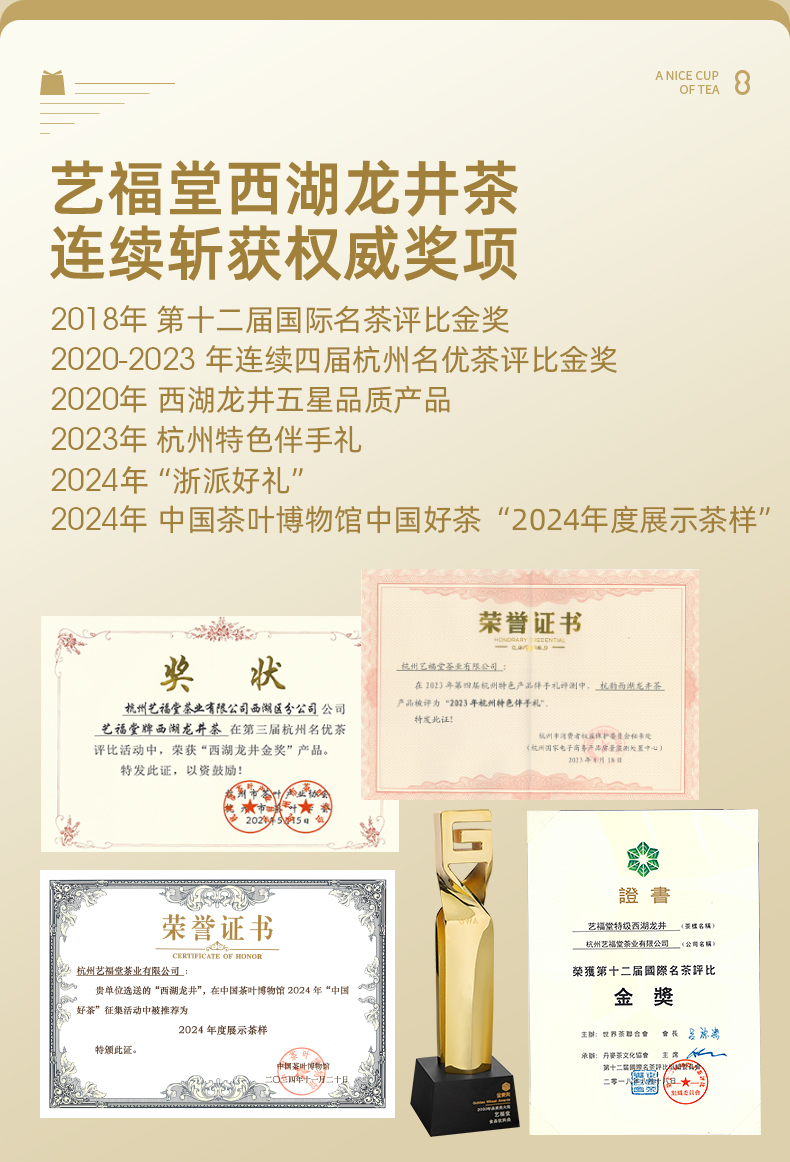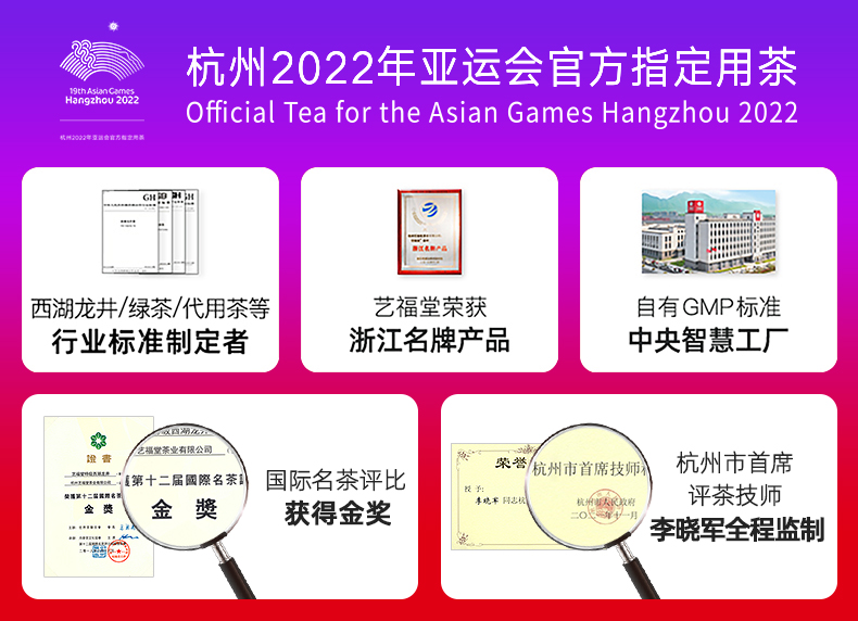 - “艺福堂茶业”创立于2008年,是一家集生产、销售、科研为一体的现代茶业企业,主打西湖龙井,兼营世界各地名优茗茶及花草茶,是中国茶行业为数不多的年销售额过5亿的品牌之一,是杭州亚运会官方指定用茶!