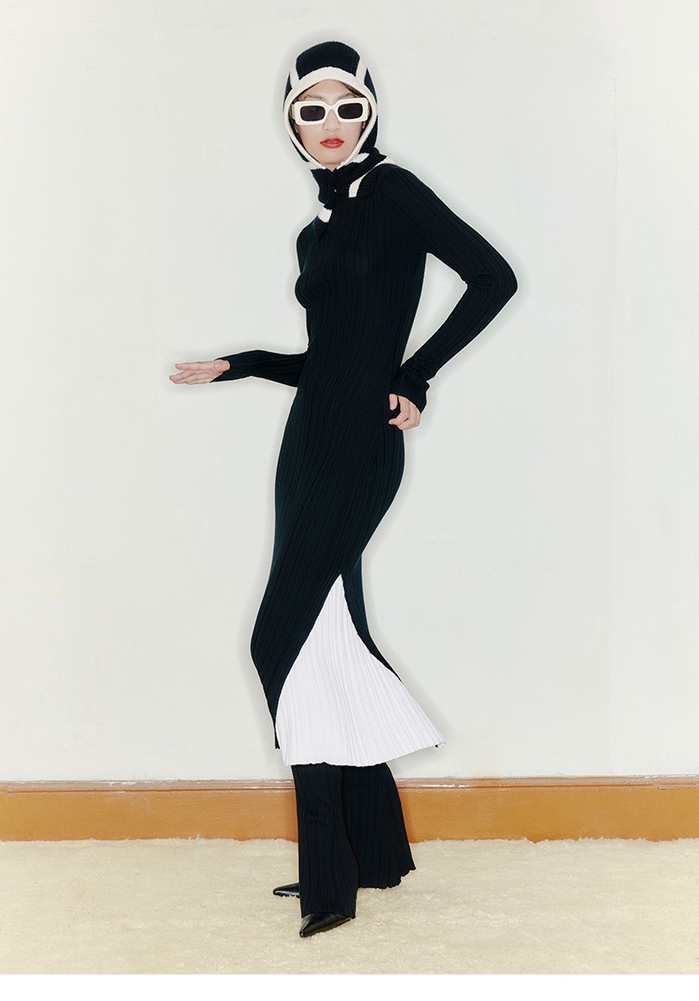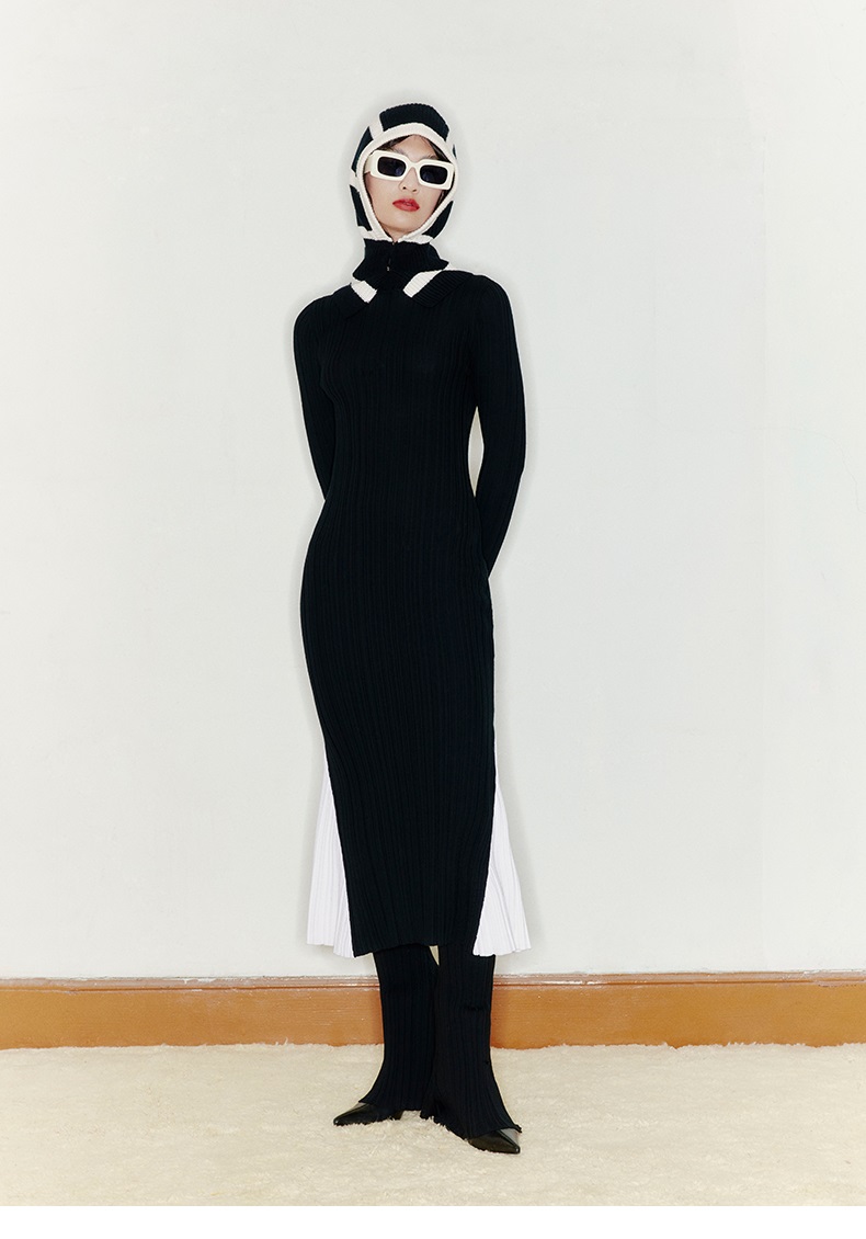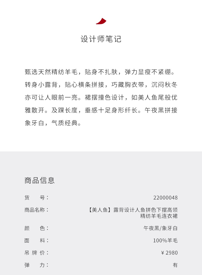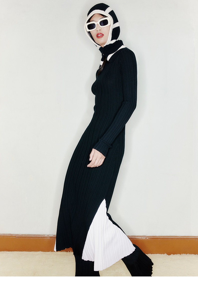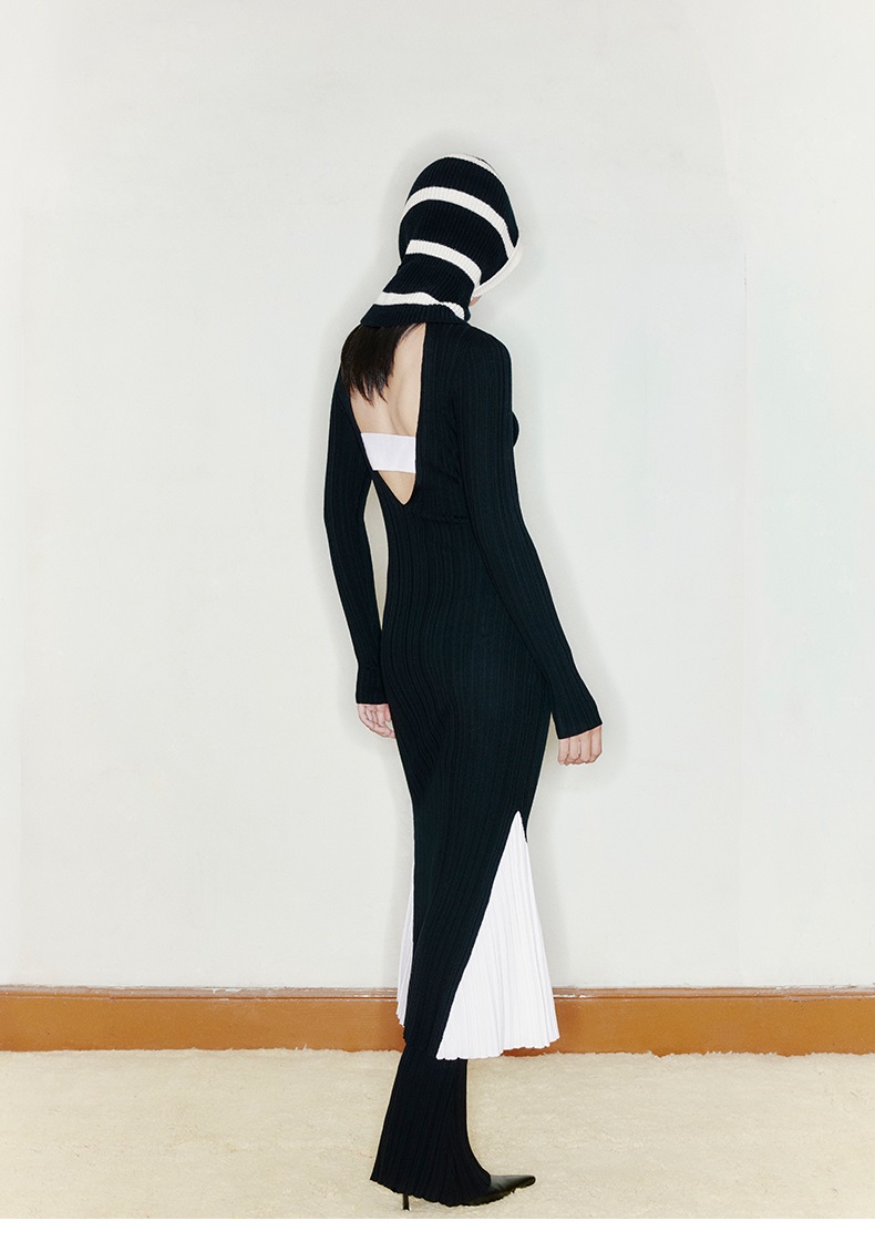 【美人鱼】露背设计人鱼拼色下摆高领精纺羊毛连衣裙/22000048