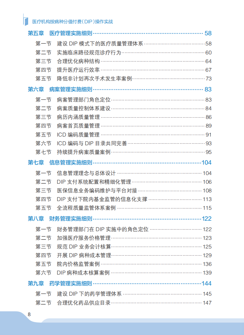 本书以医保、医疗机构高质量发展为导向,在医保DIP支付制度改革的背景下,为医院管理者提供全面、可操作性的应对策略。推动DIP在医疗机构实行不仅仅是医保管理部门的独立工作,需要医务、病案、财务、药学、医用耗材、信息及临床业务科室协同配合,因此本书提出了DIP付费医疗机构内部多学科团队模式,涵盖医保、医疗、病案、财务、药学、医用耗材、信息及临床科室管理的措施及实践案例,为医院应对DIP支付改革提供了系统性方案。