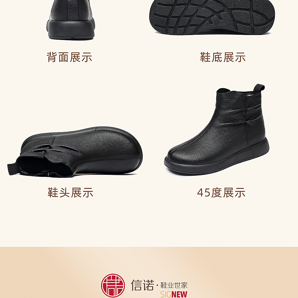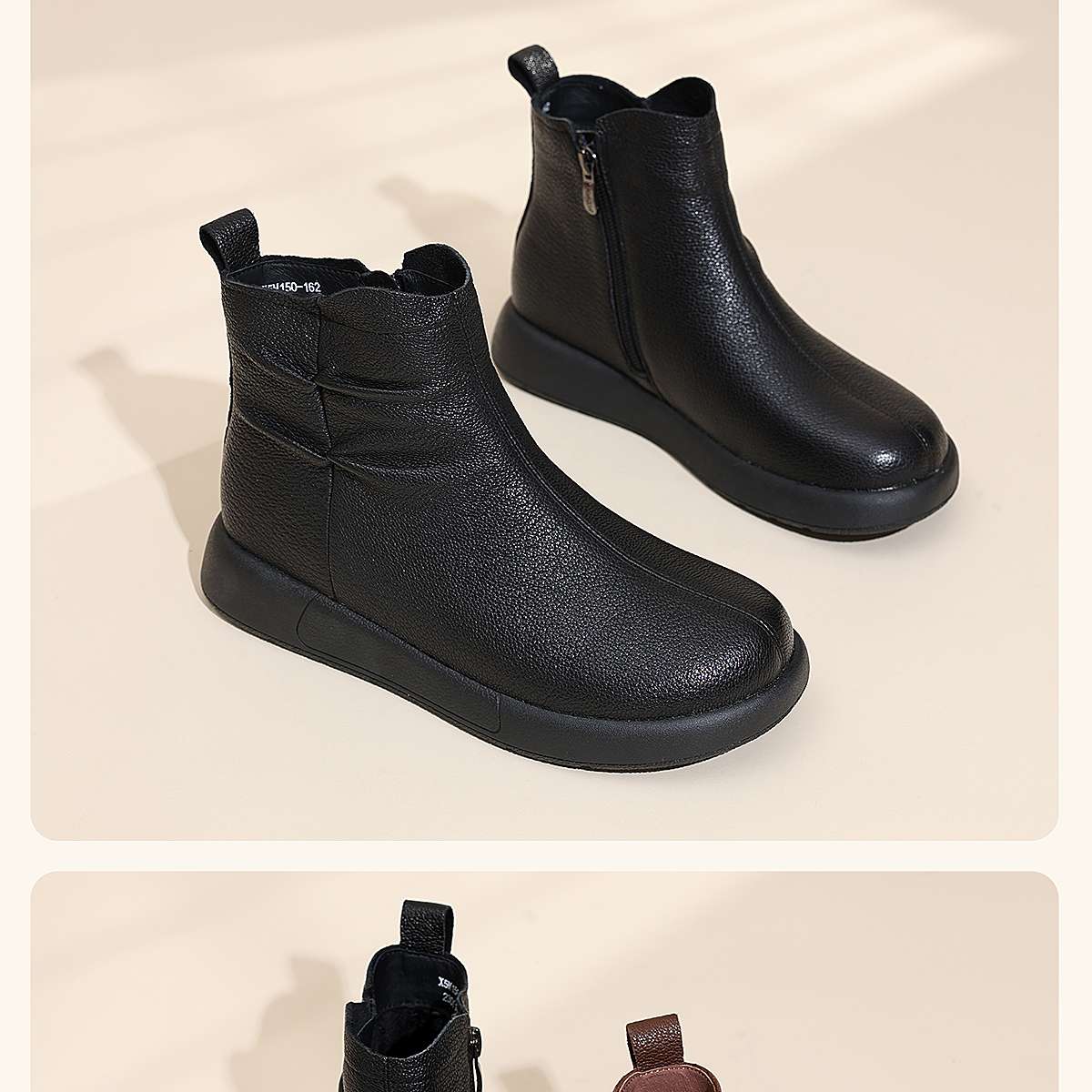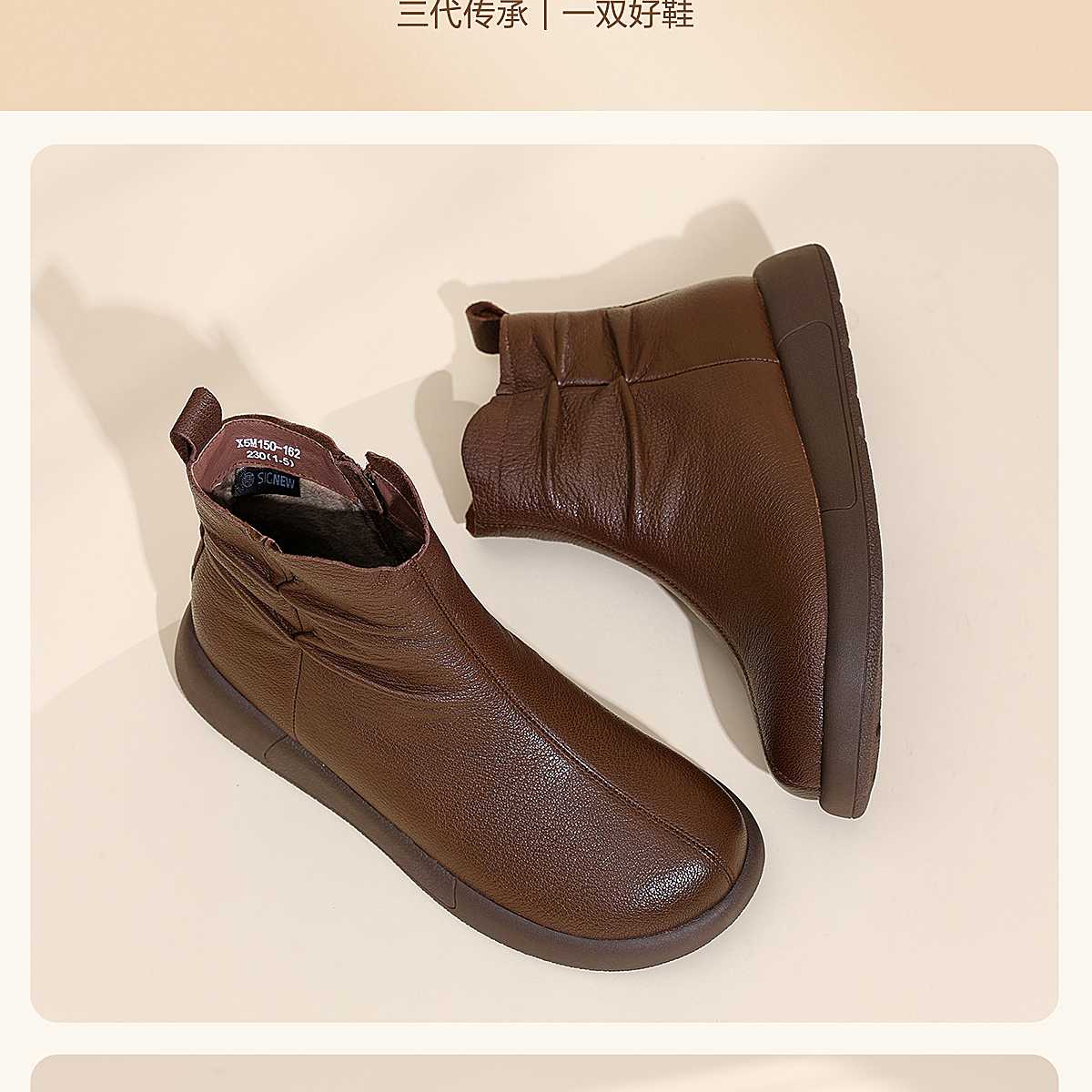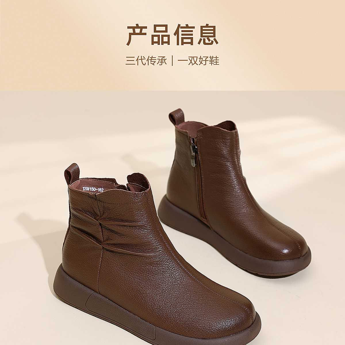 真皮短靴女平底舒适时装靴棕色褶皱设计妈妈鞋软底靴子5M203-8TD