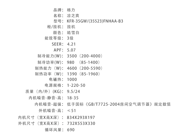 格力·凉之爽变频冷暖1.5匹3级能效壁挂机空调 KFR-35GW/(35523)FNhAa-B3