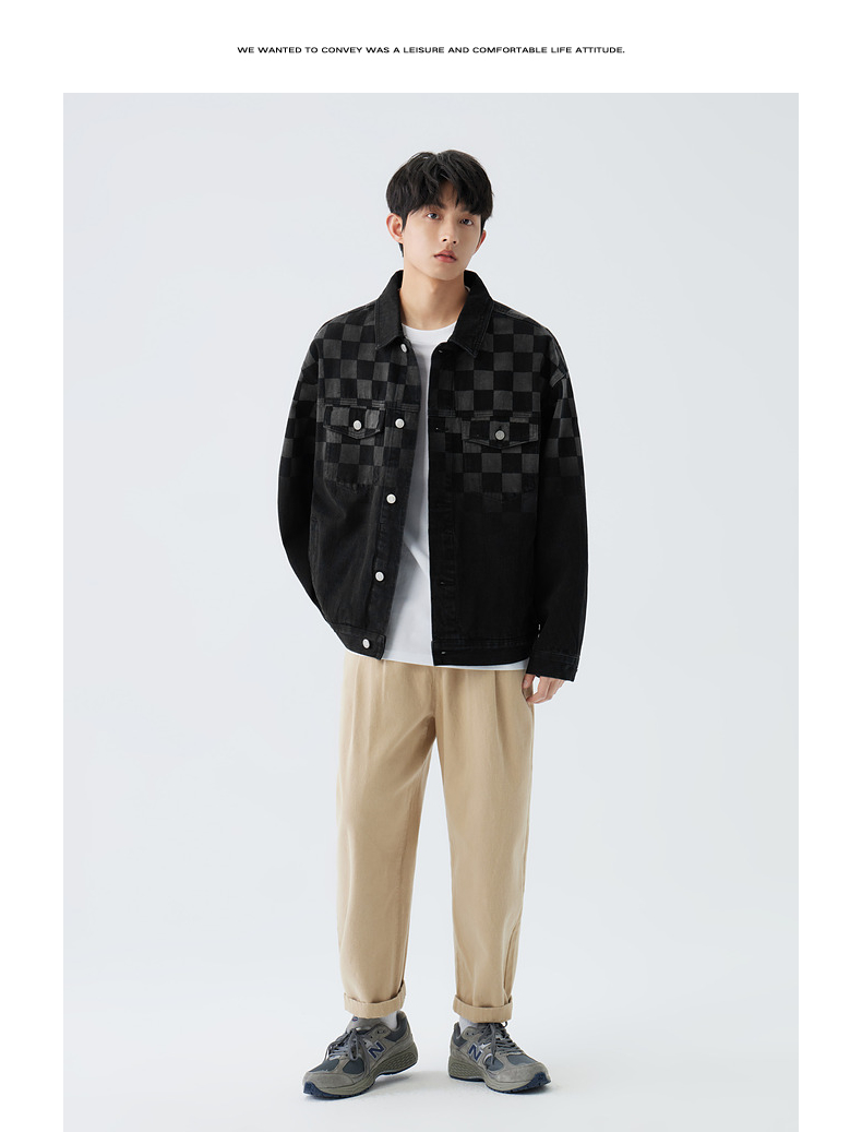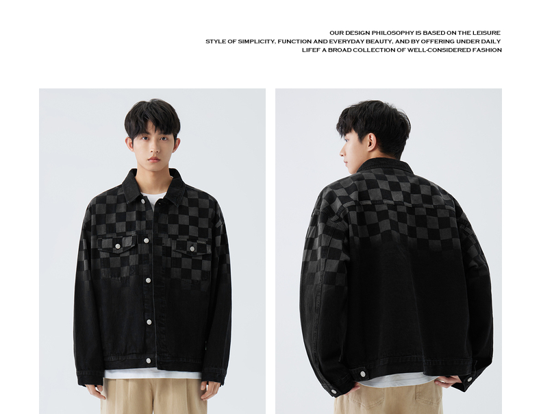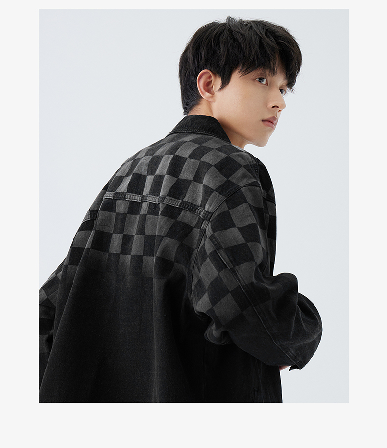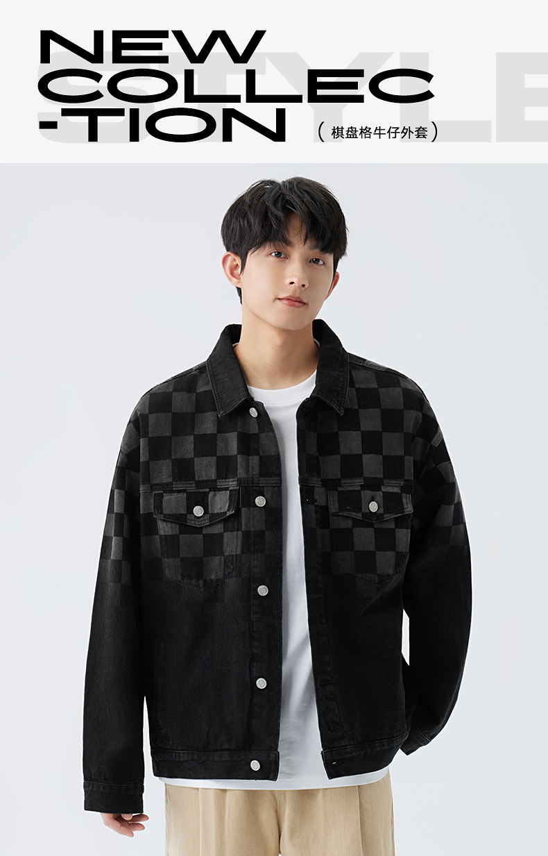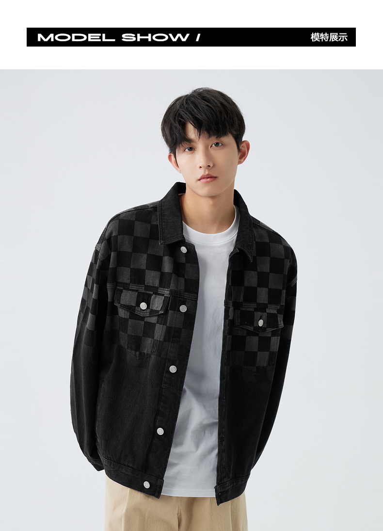 gxgjeans男装春季黑色翻领夹克外套 棋盘格牛仔夹克外套男情侣装JED1E805803