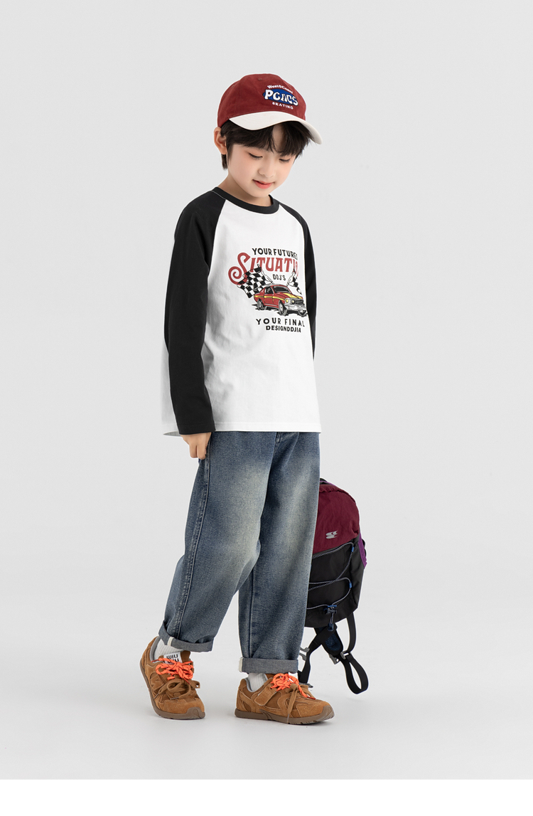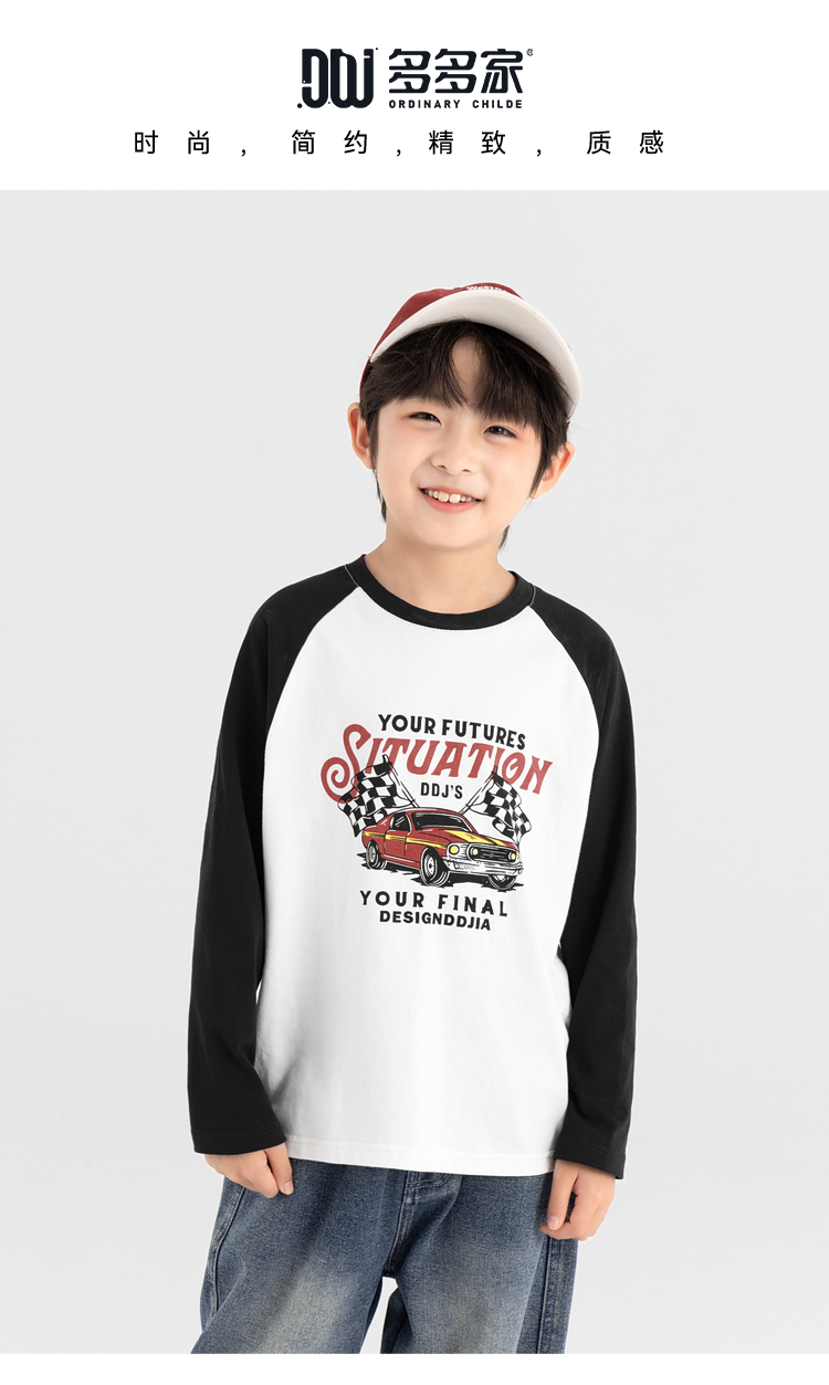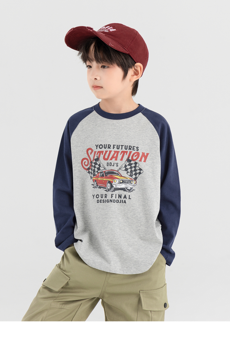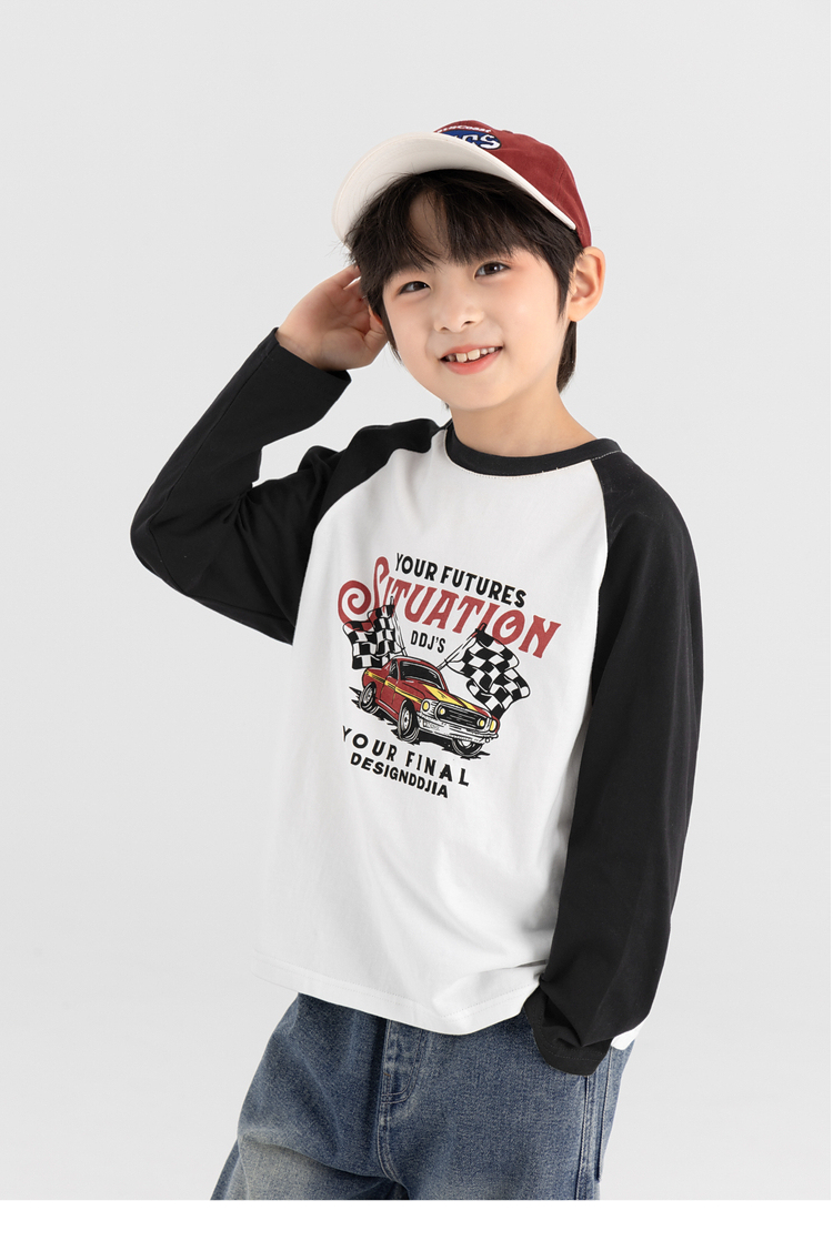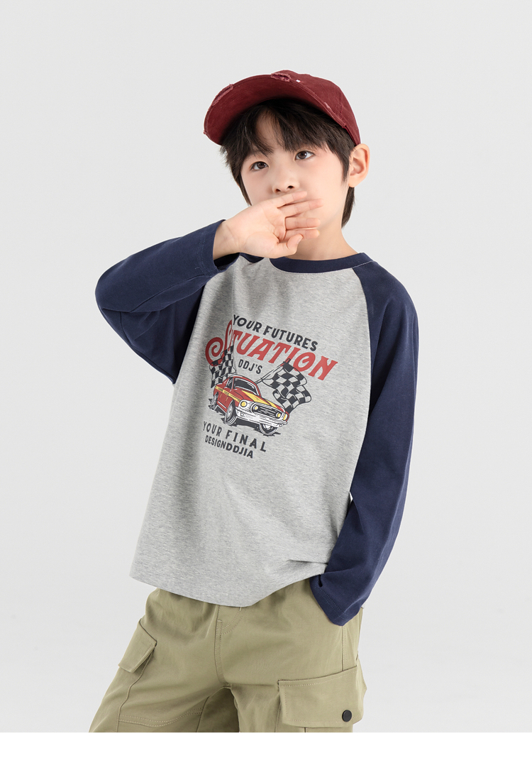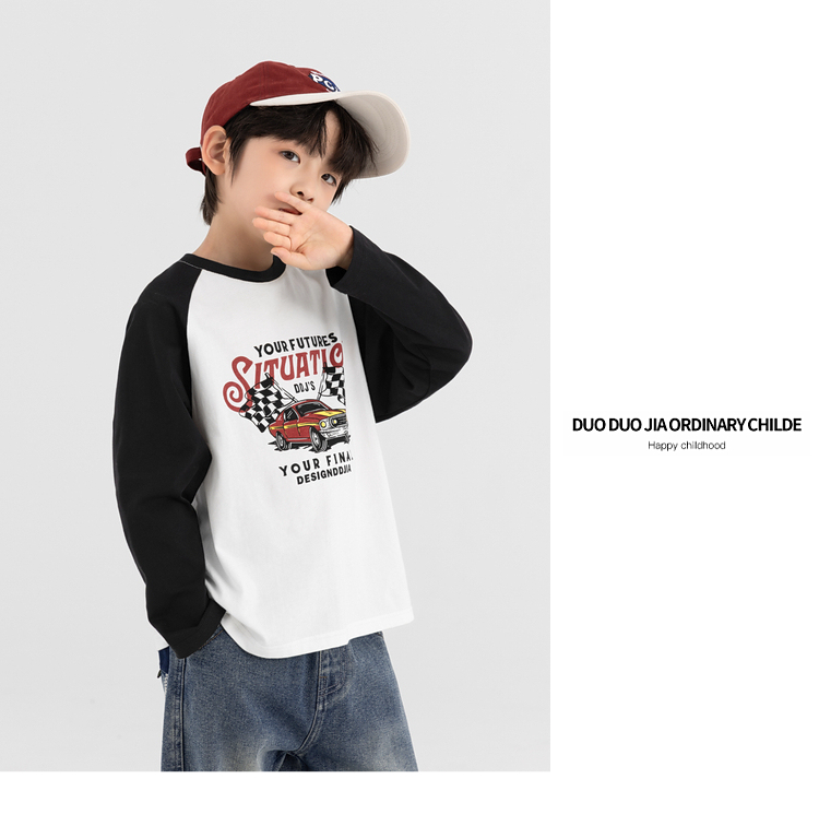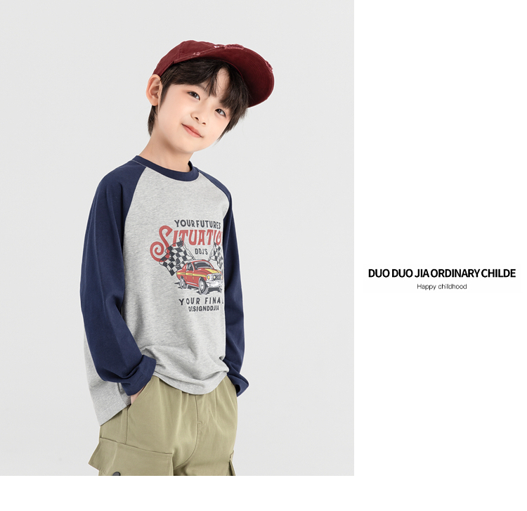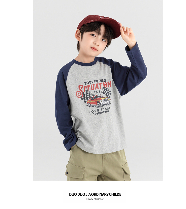 【团购价29.9】多多家男童T恤长袖纯棉2025新款春秋款儿童赛车印花男孩插肩上衣11054