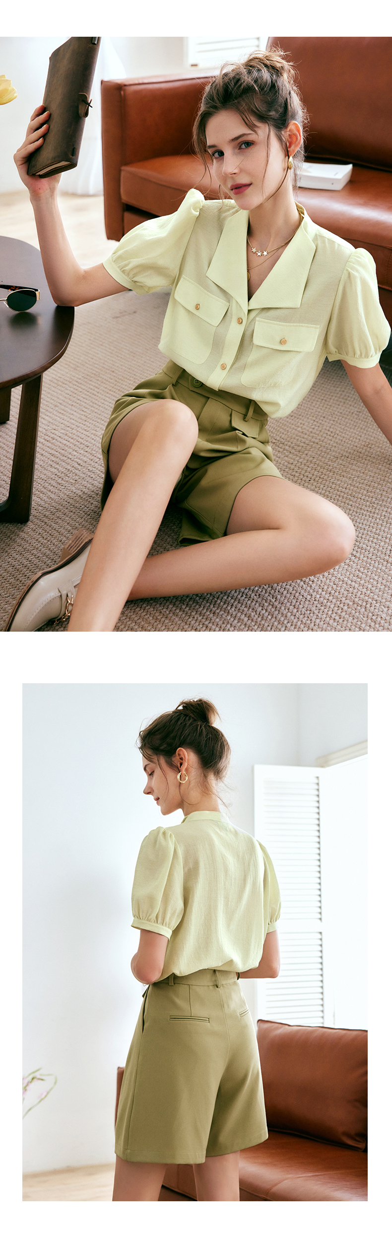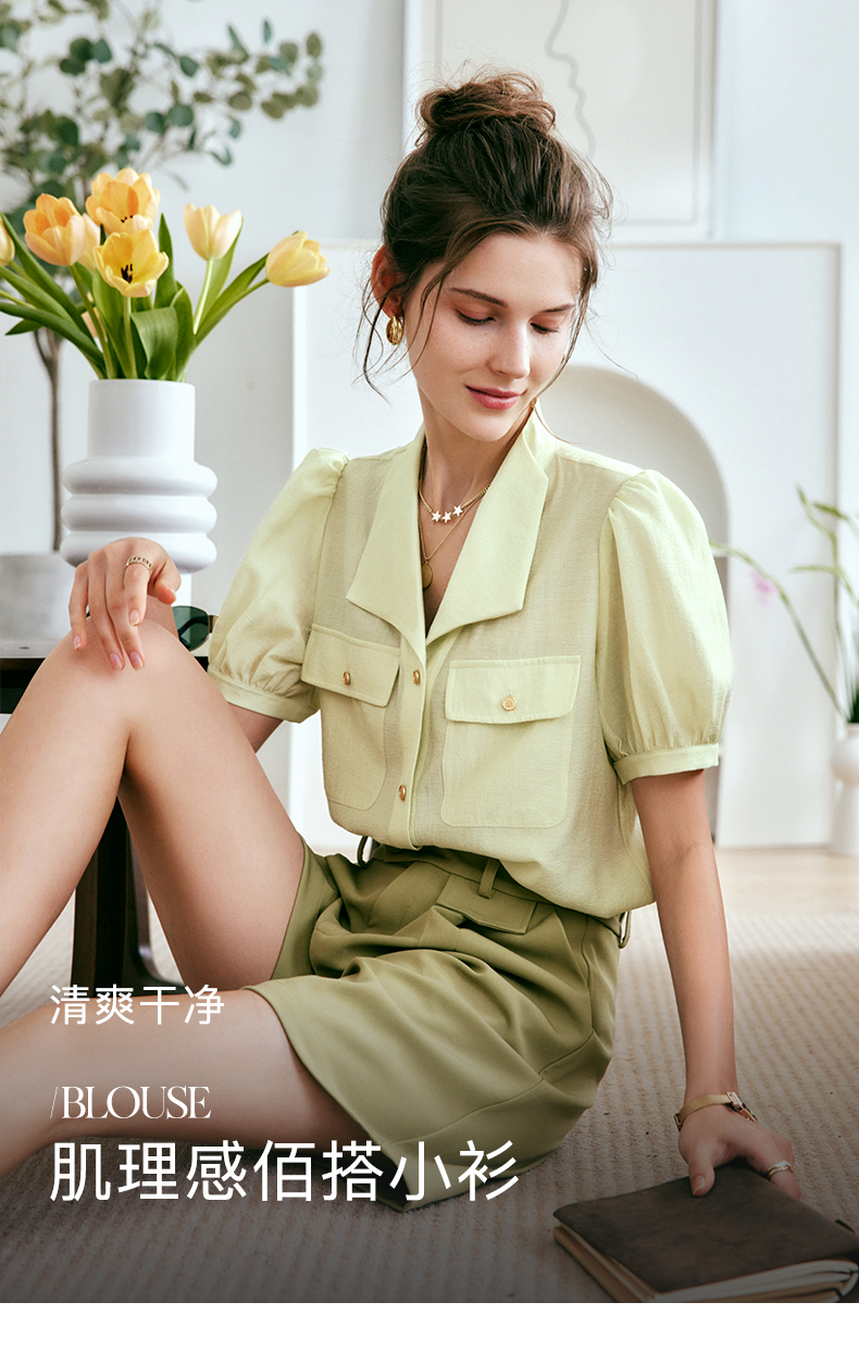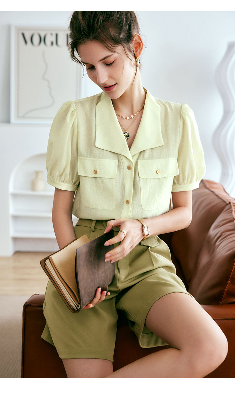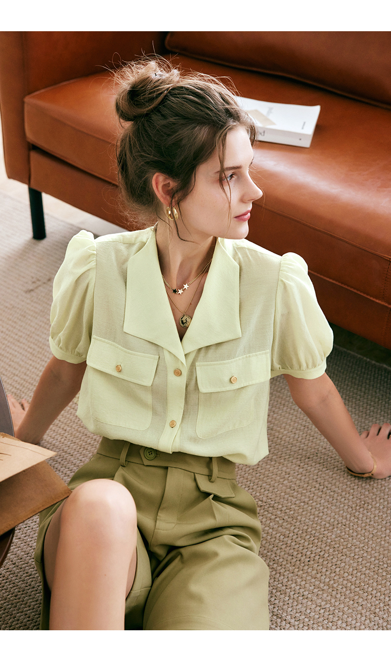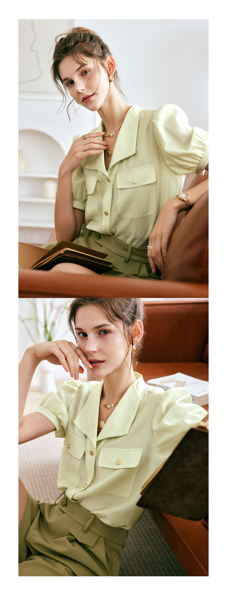 欧芮儿OLrain法式翻领衬衫女夏季2022新款时尚肌理感泡泡袖小衫