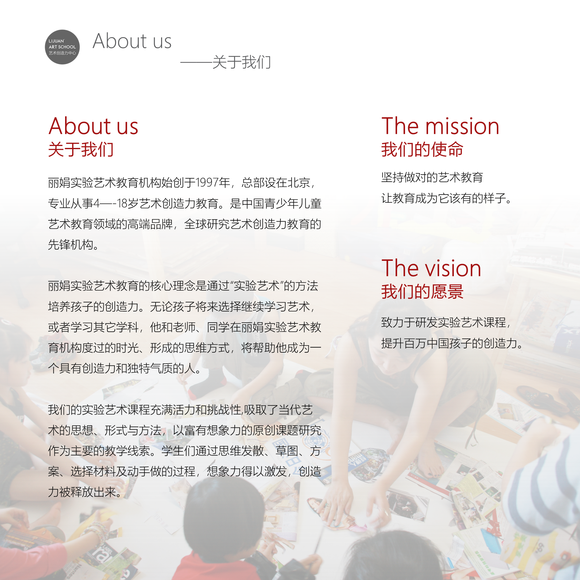 致力于通过艺术教育逐步提升孩子们的集体自由力、独立探索精神、多元思维习惯、计划与方案的推进方法、创造的动手实现能力。