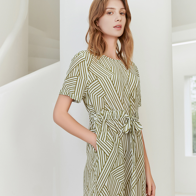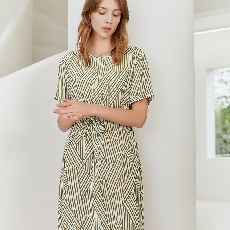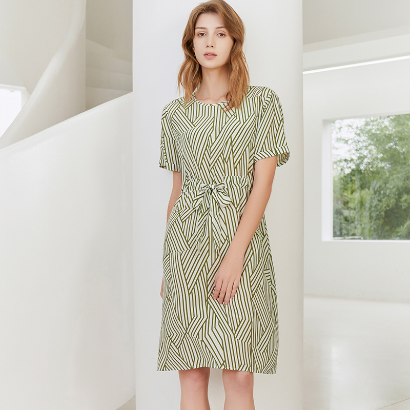【100%桑蚕丝连衣裙】23年春夏新品女士中长款真丝连衣裙时尚条纹系带裙子