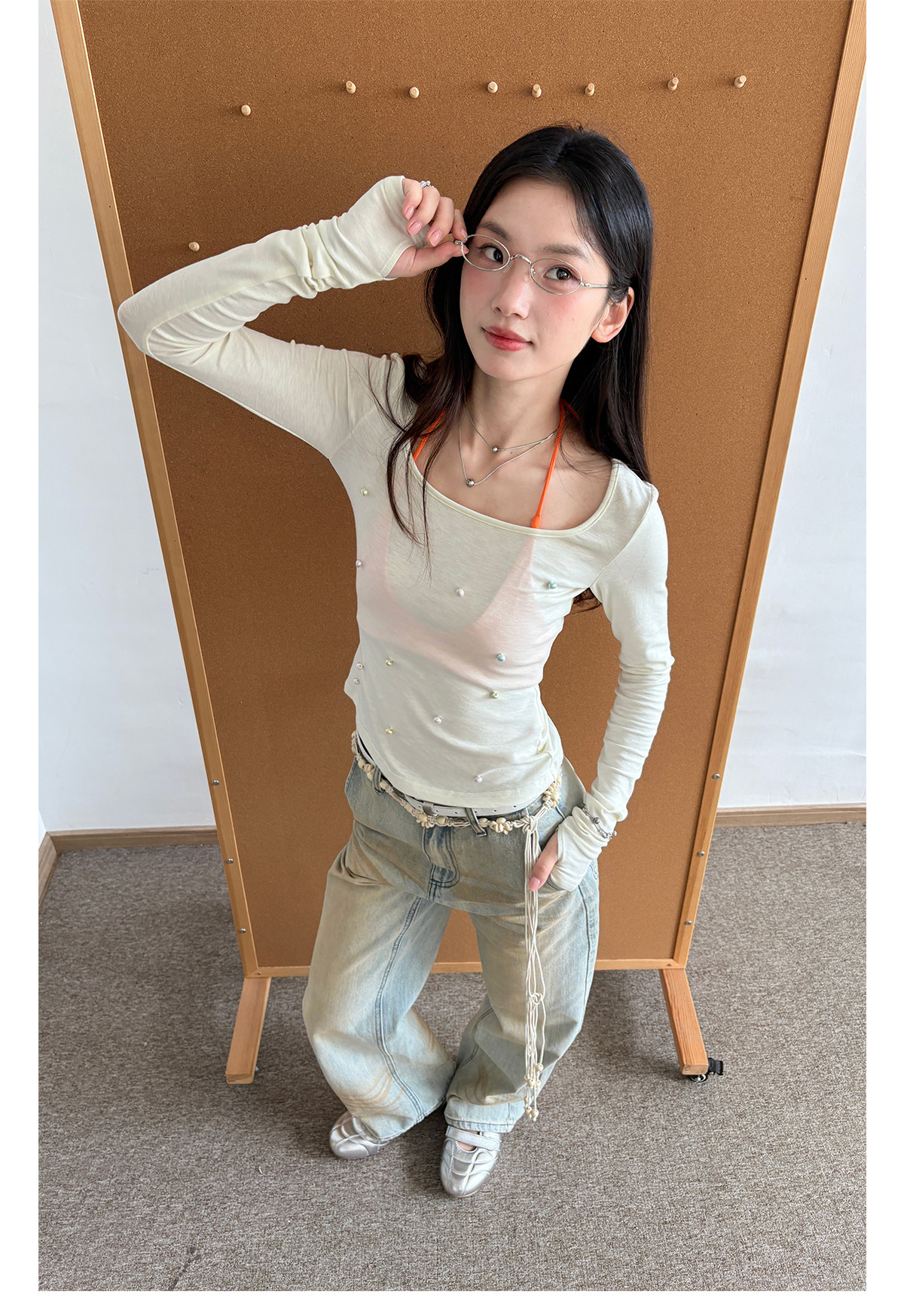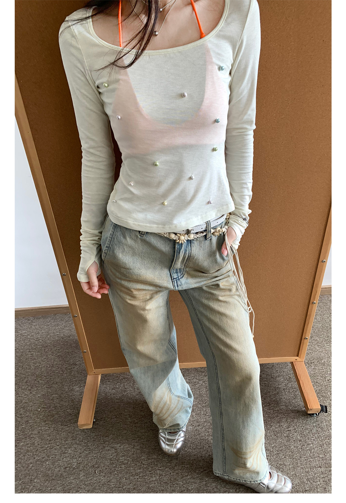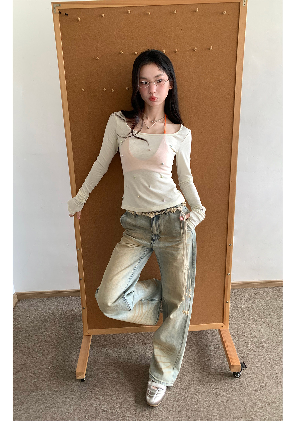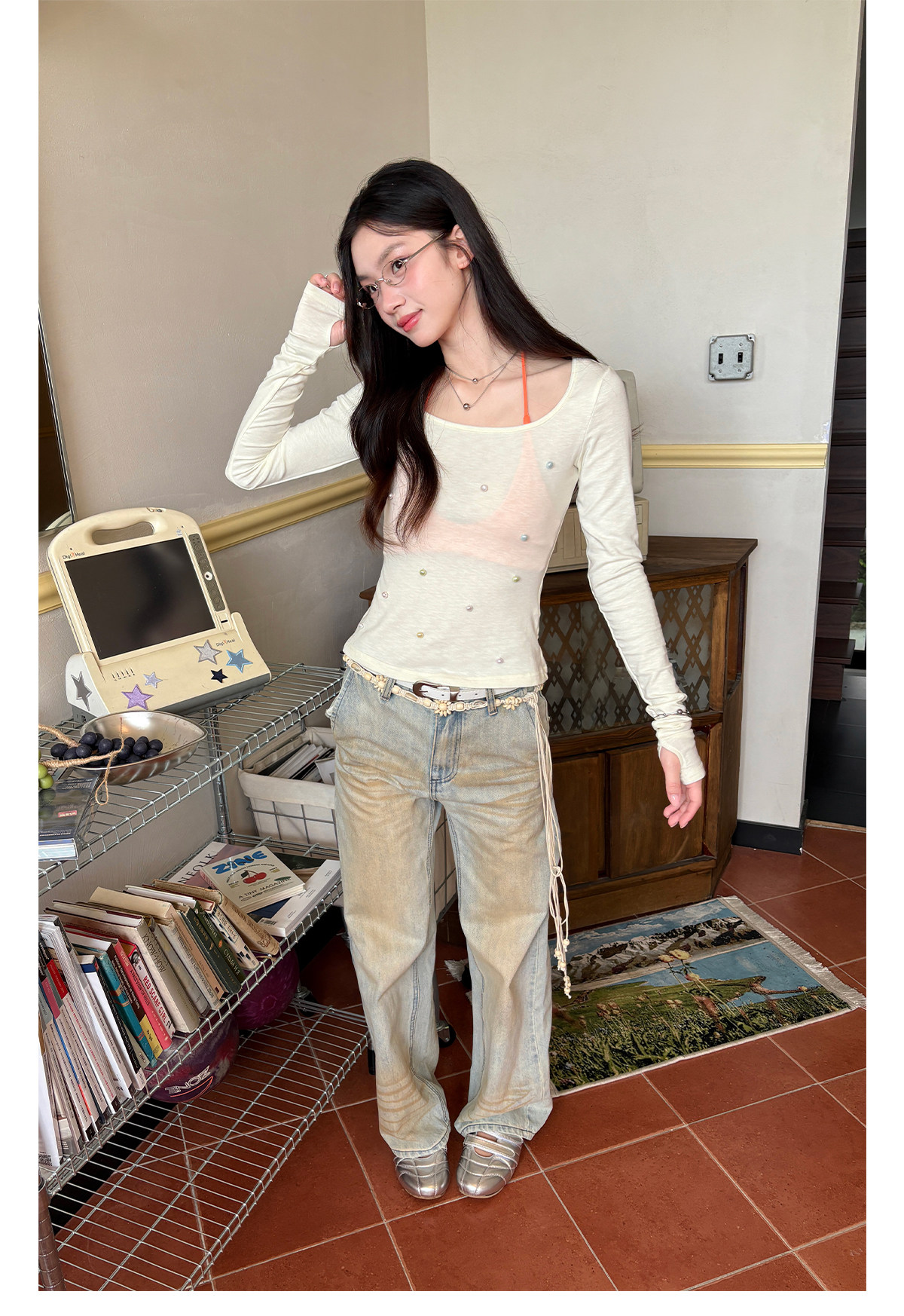 FTT FlyTheTruth『繁星点点』重工钉珠长袖T恤女夏季薄款透气罩衫