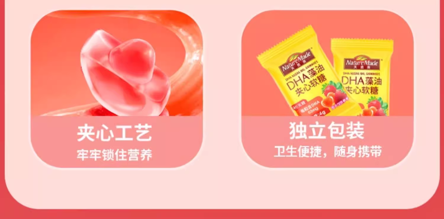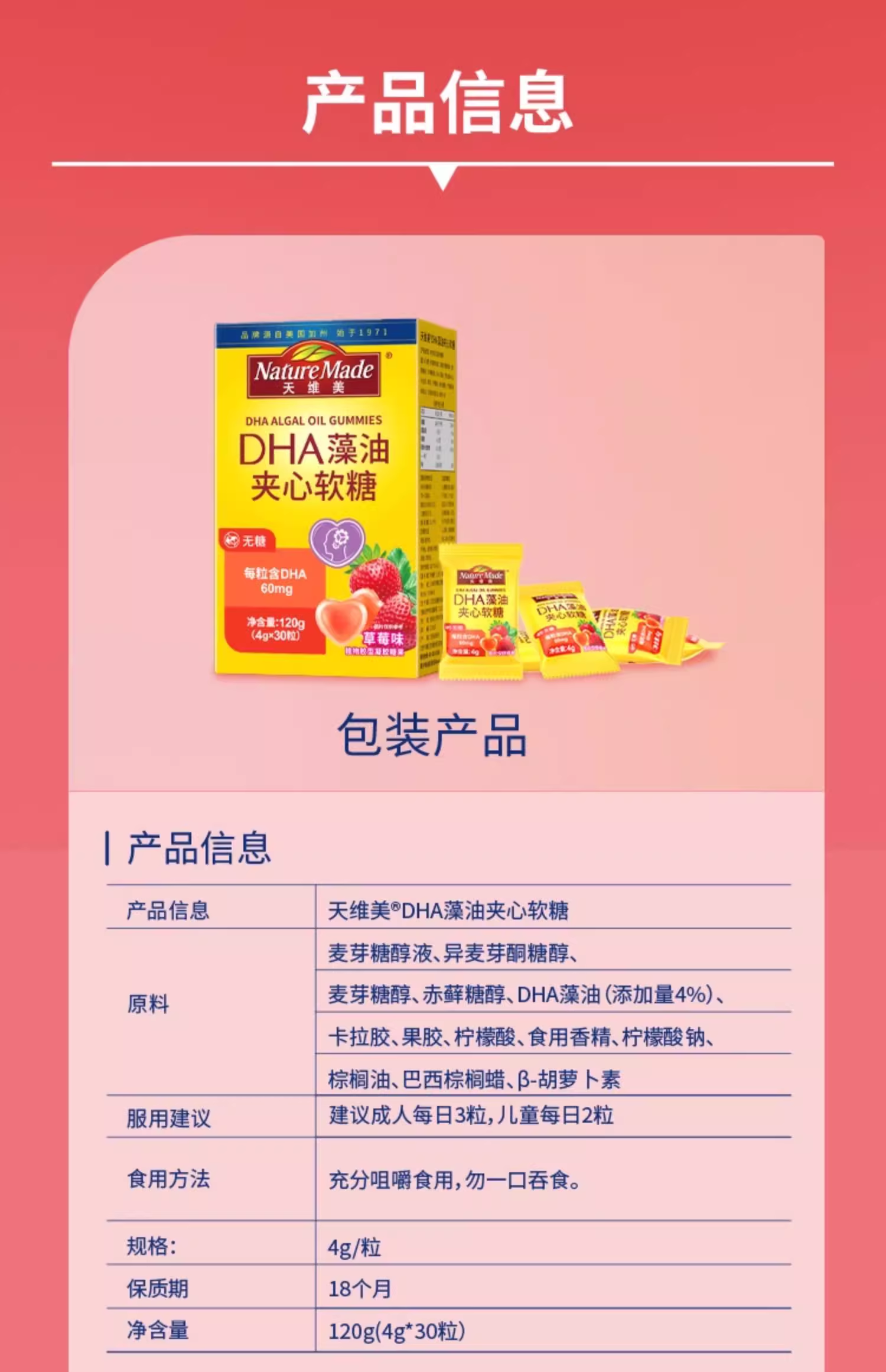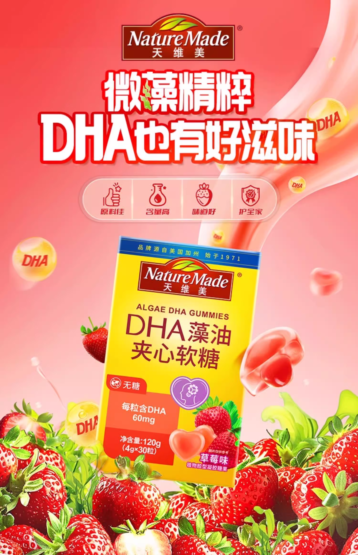 【国内版】NatureMade天维美®DHA藻油夹心软糖120g(30粒)草莓味 益智明眸