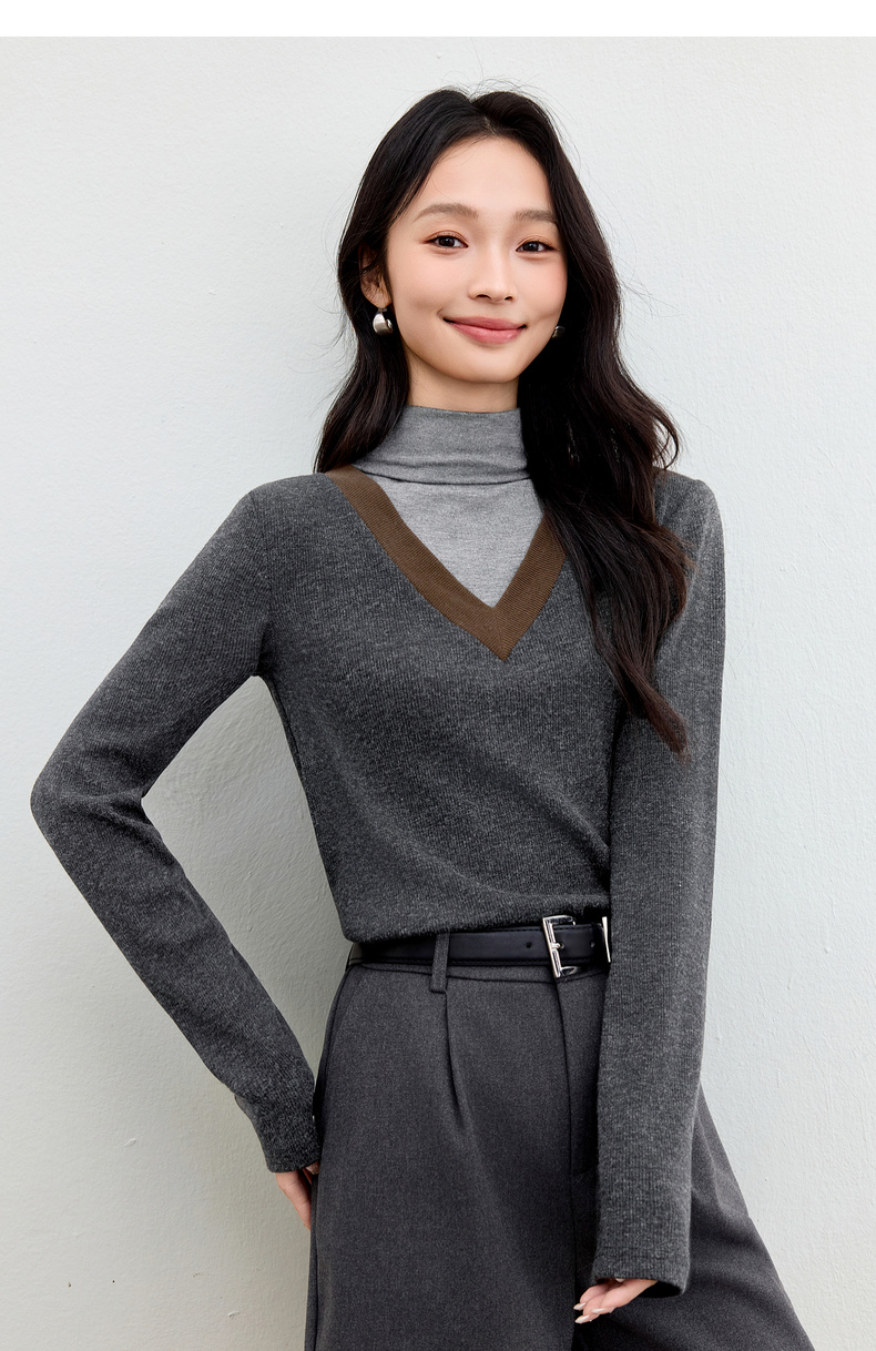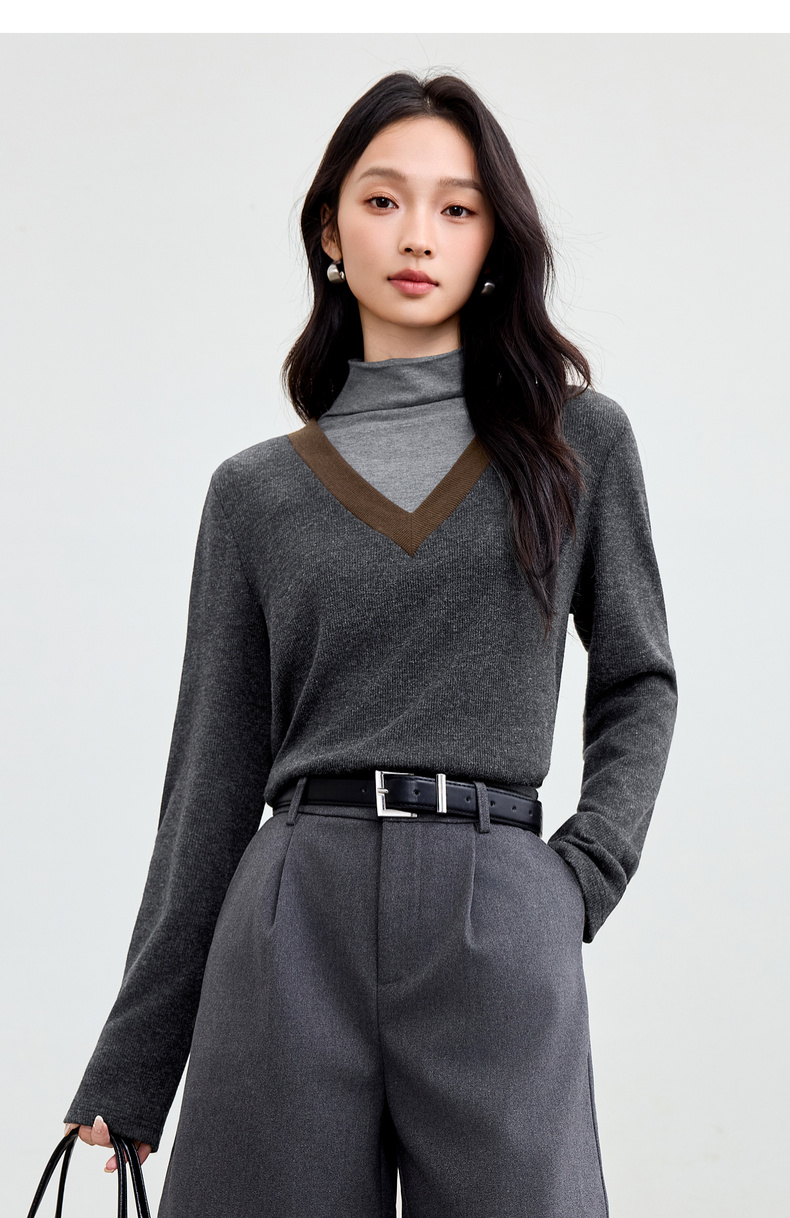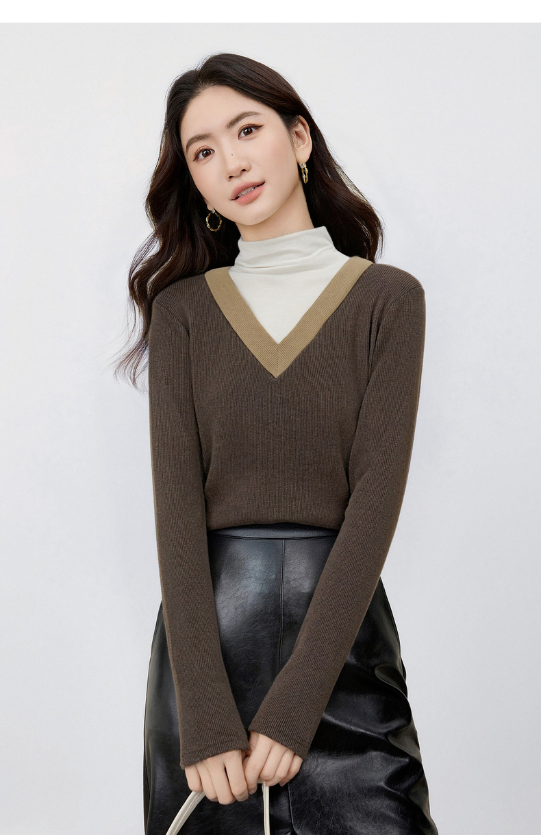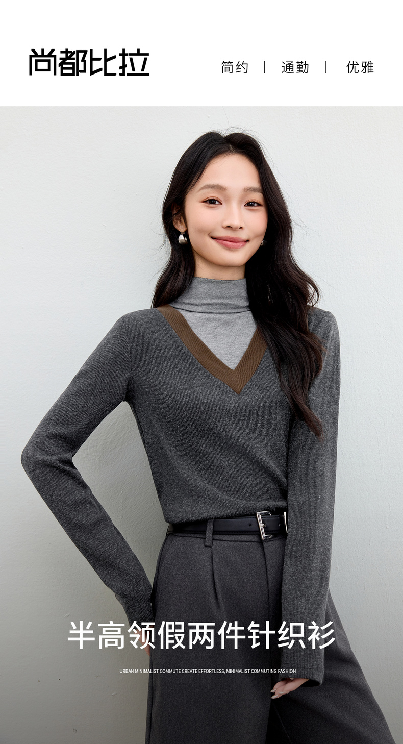 【内购】【假两件】通勤设计感撞色拼接半高领弹力针织衫-153H58653