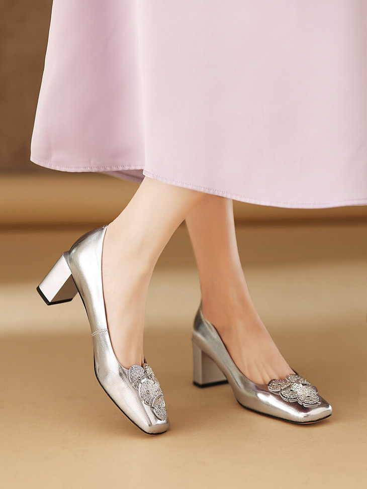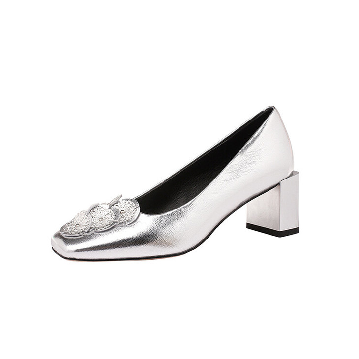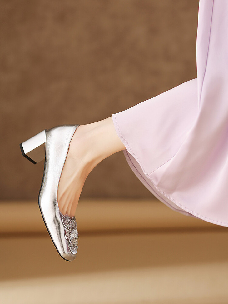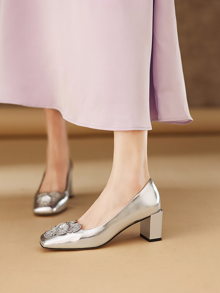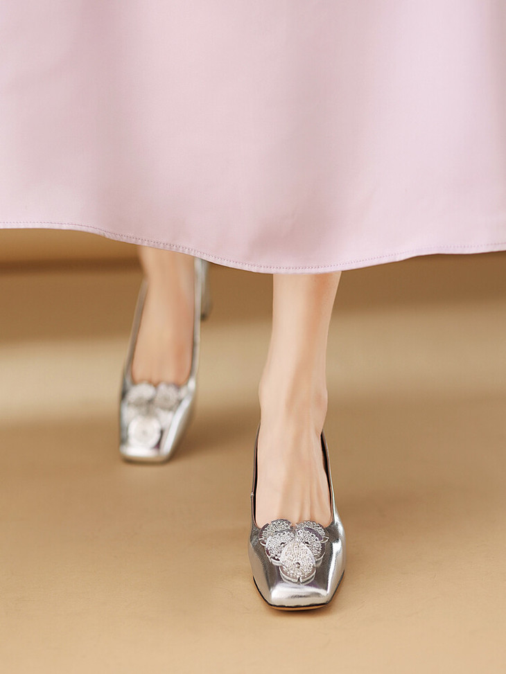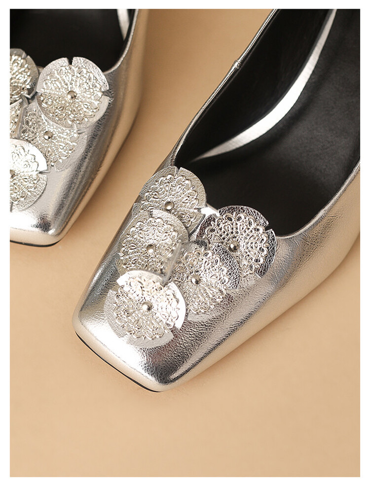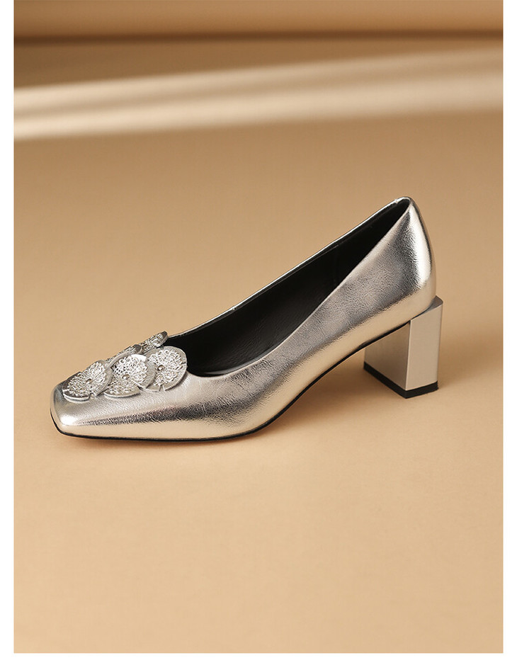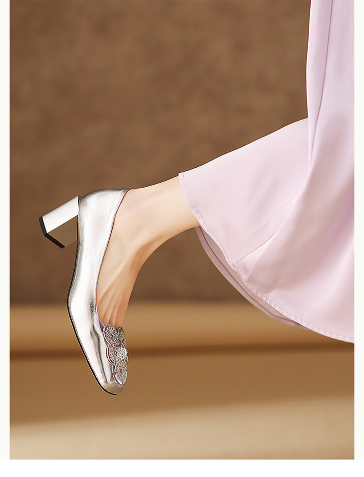 【预售5天】粗跟银色方头花朵,气质高跟单鞋QQJFG&JZ-1181F