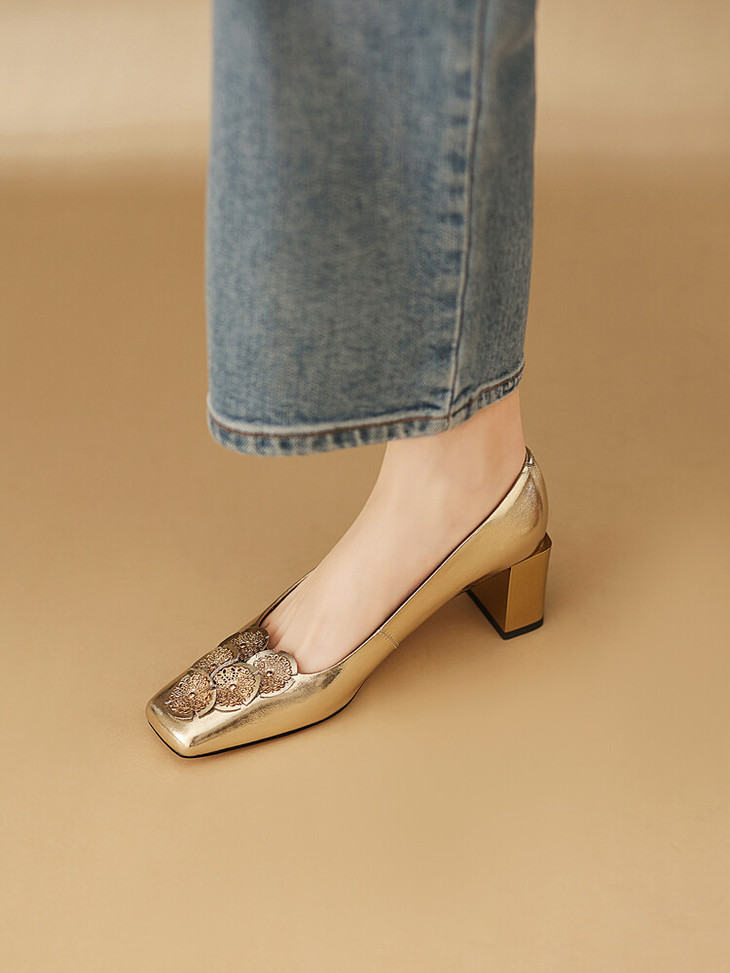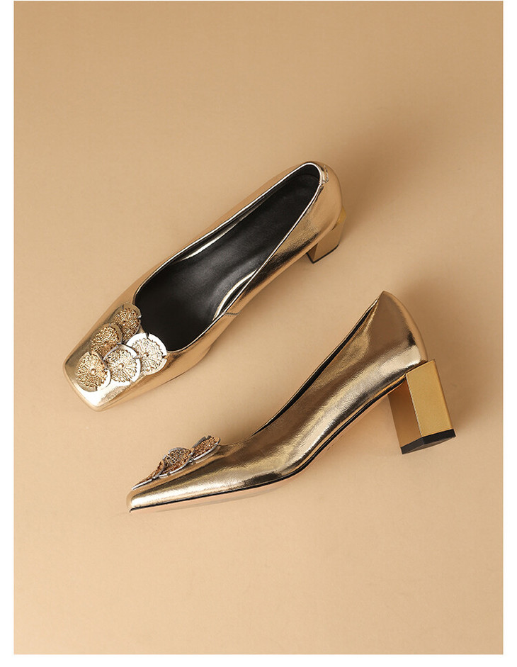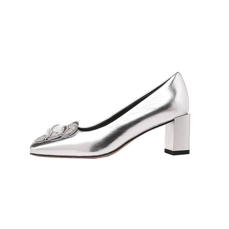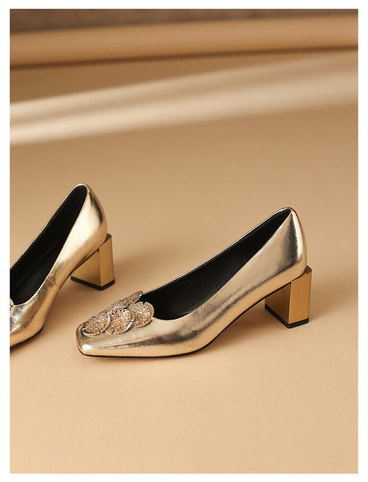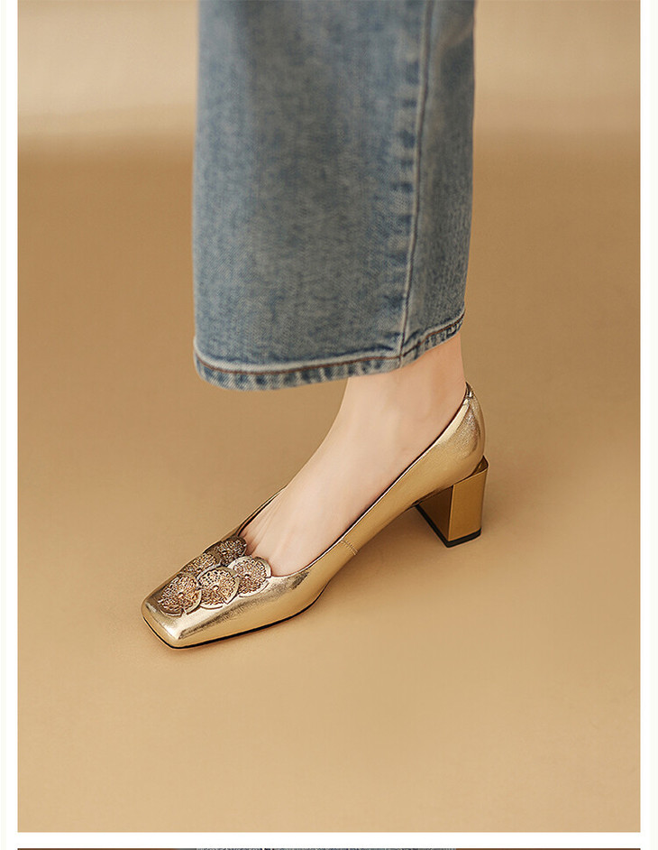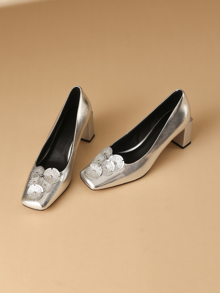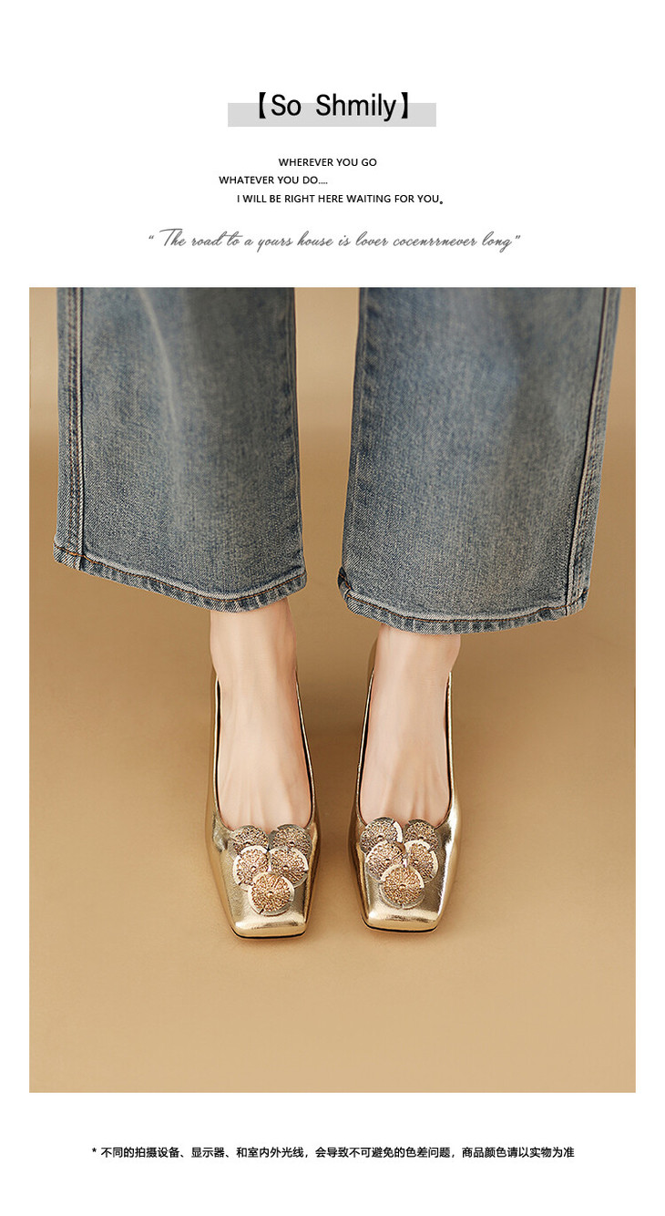 【预售5天】粗跟银色方头花朵,气质高跟单鞋QQJFG&JZ-1181F
