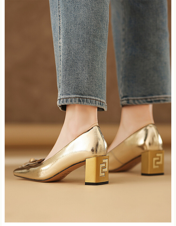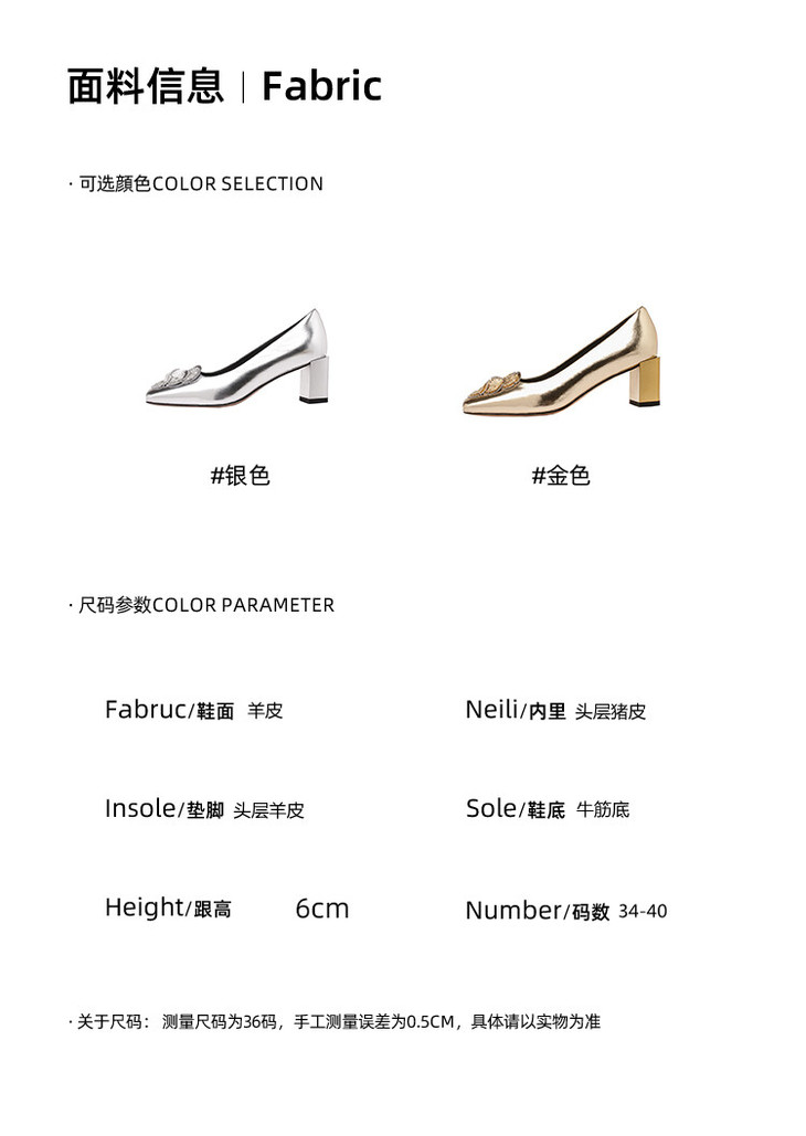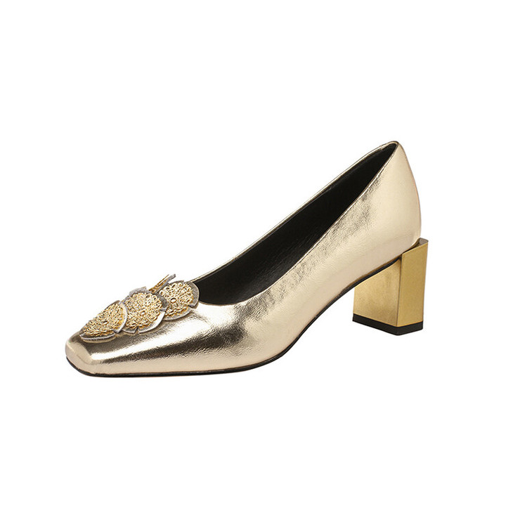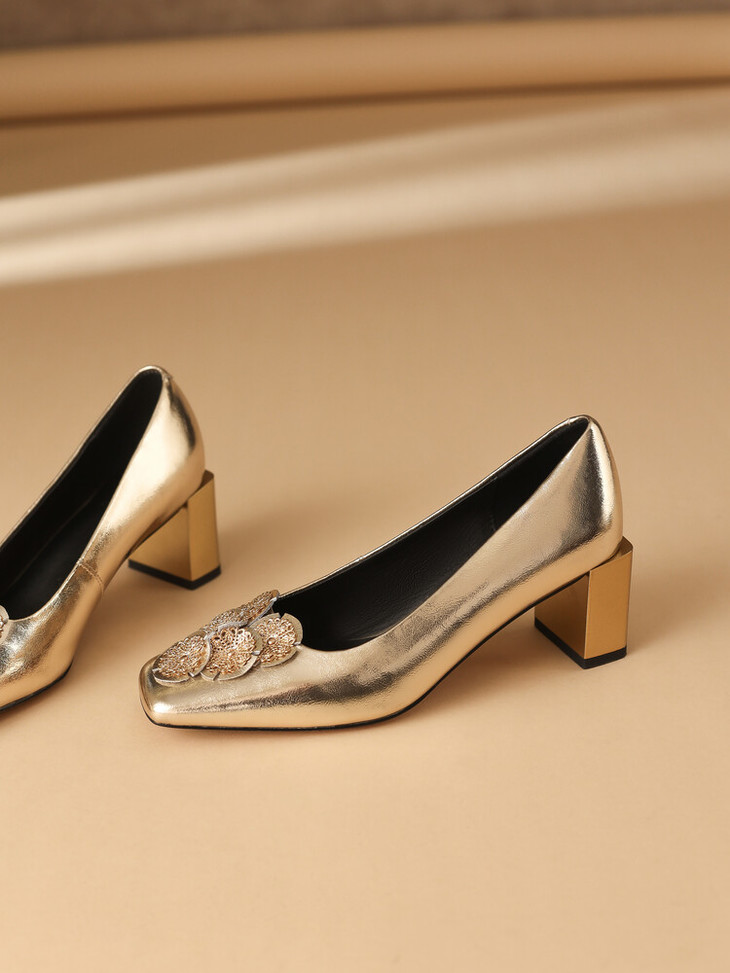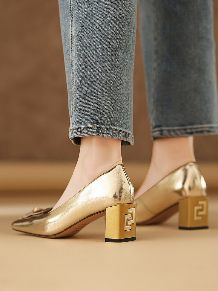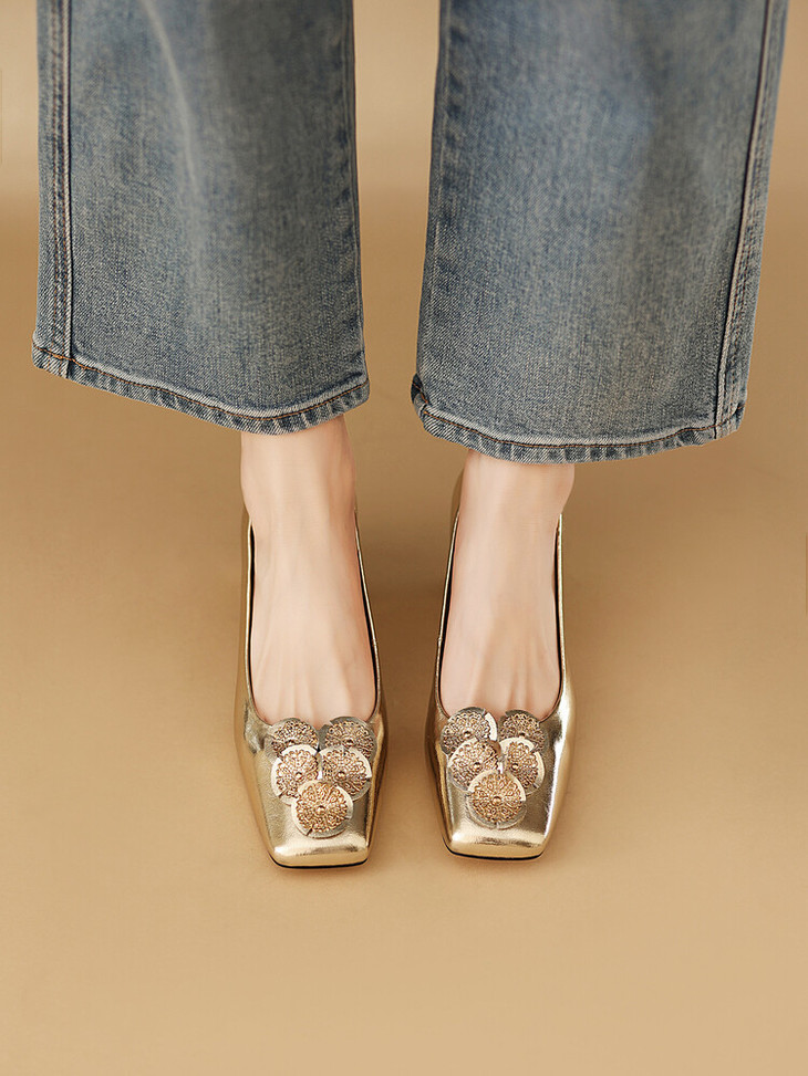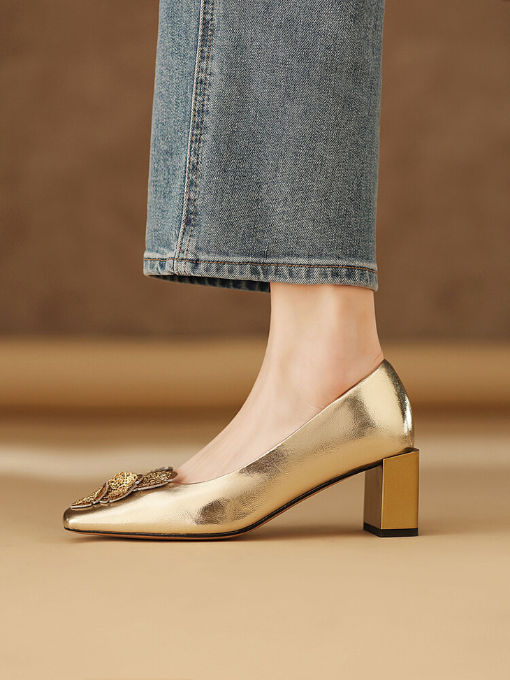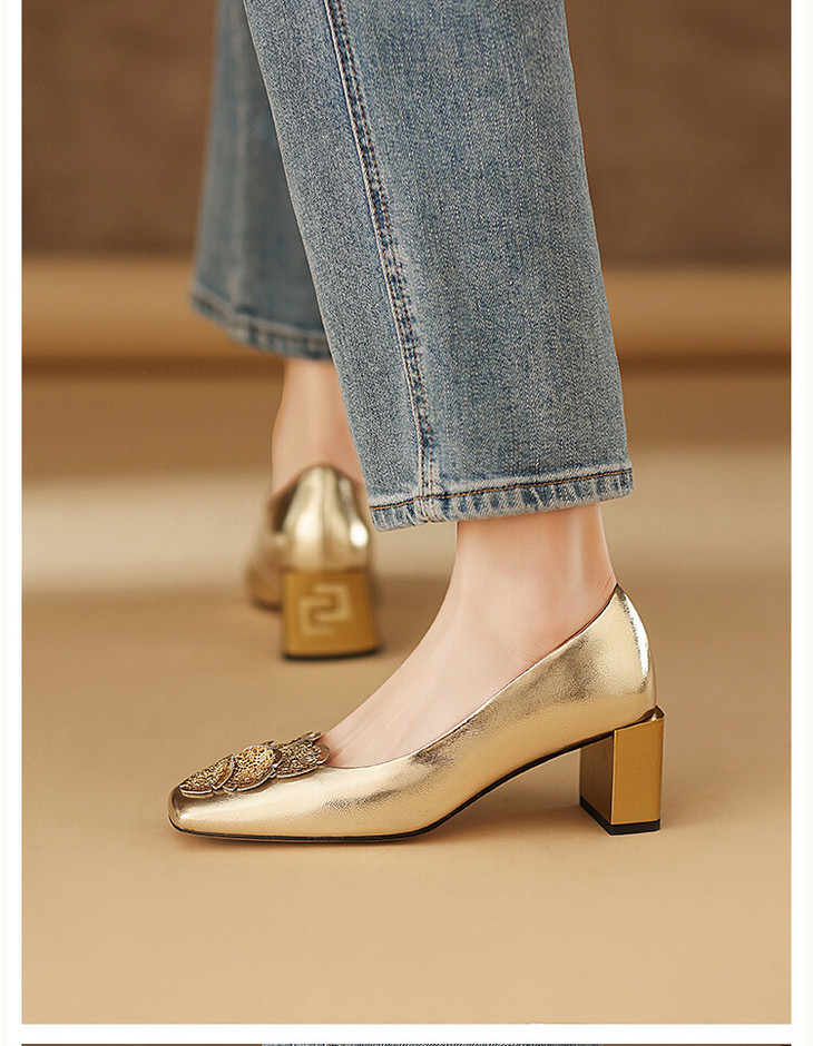 【预售5天】粗跟银色方头花朵,气质高跟单鞋QQJFG&JZ-1181F