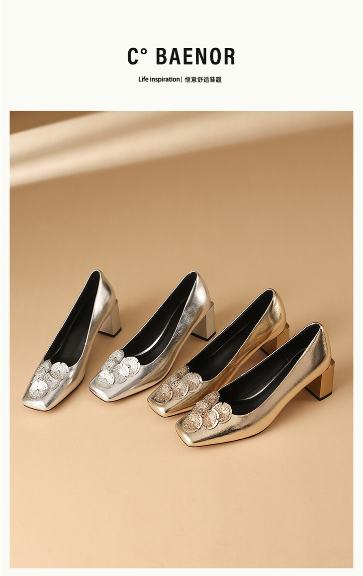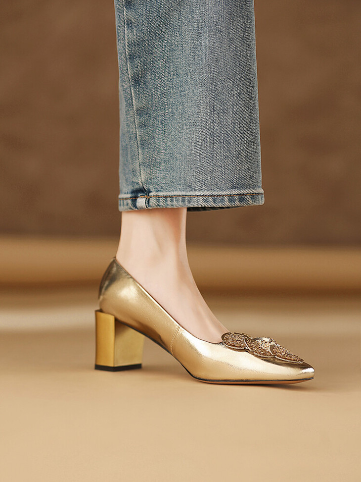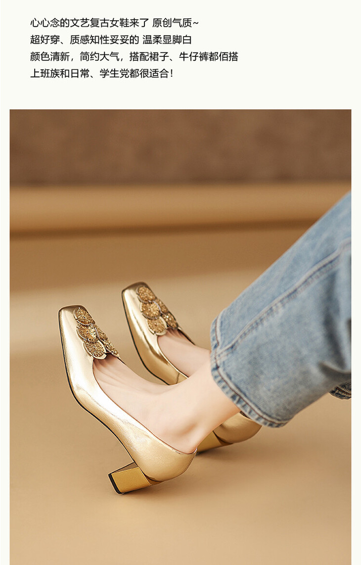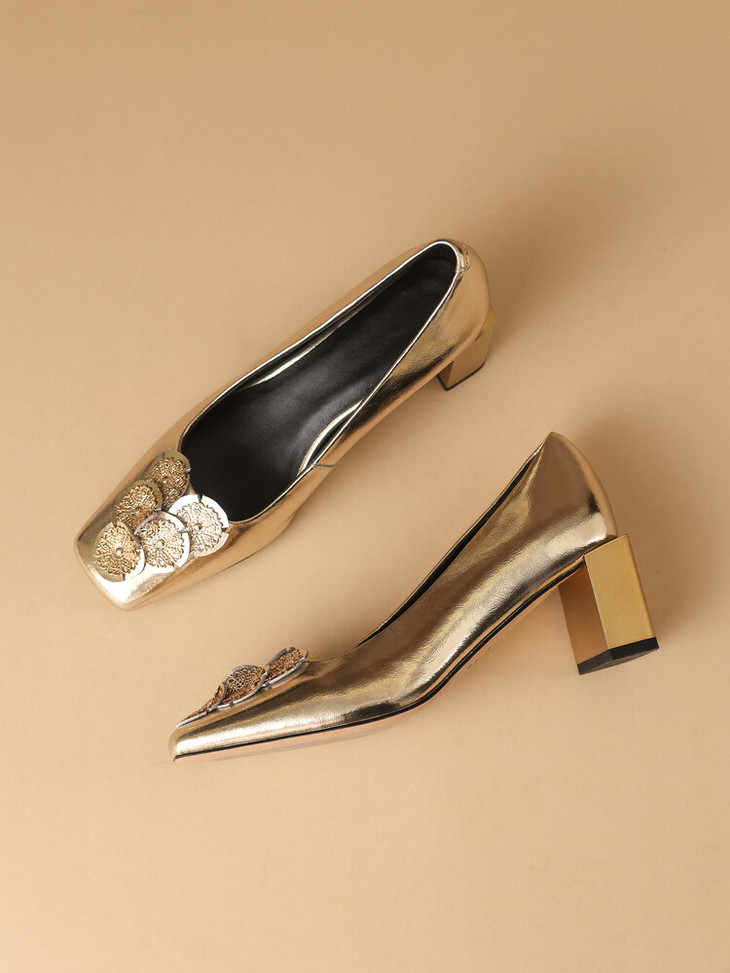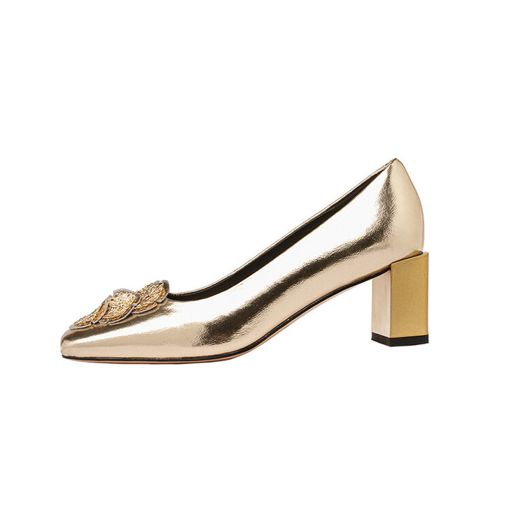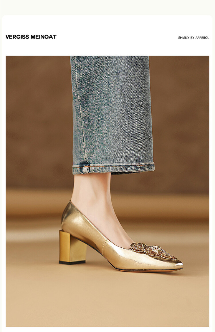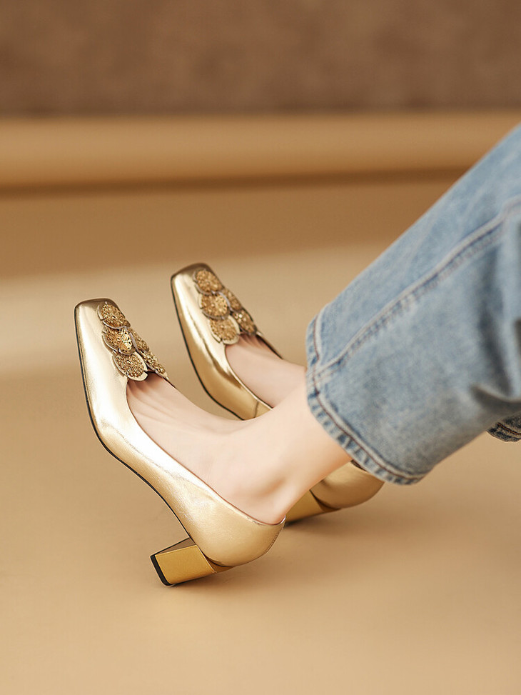 【预售5天】粗跟银色方头花朵,气质高跟单鞋QQJFG&JZ-1181F