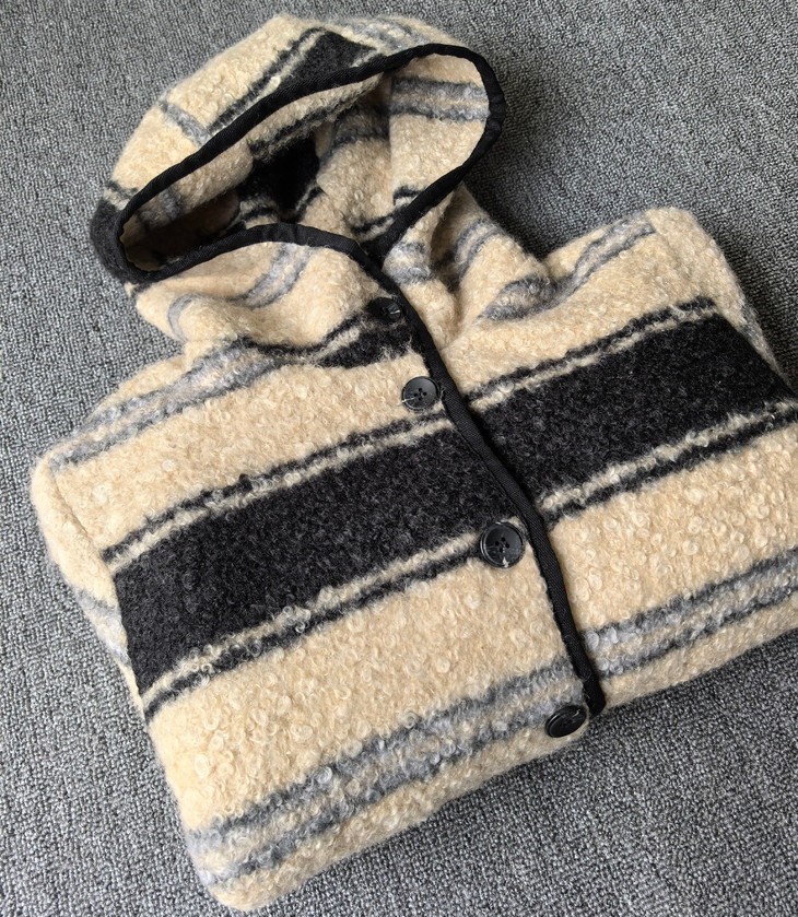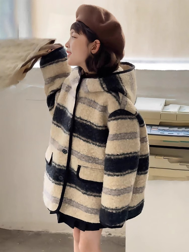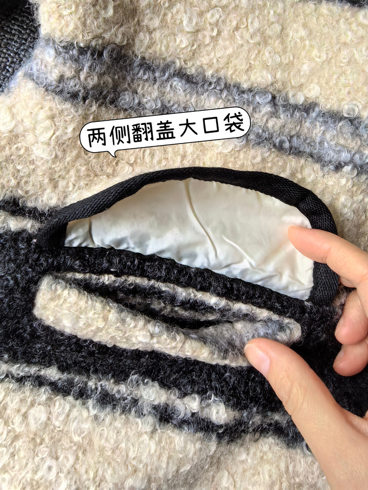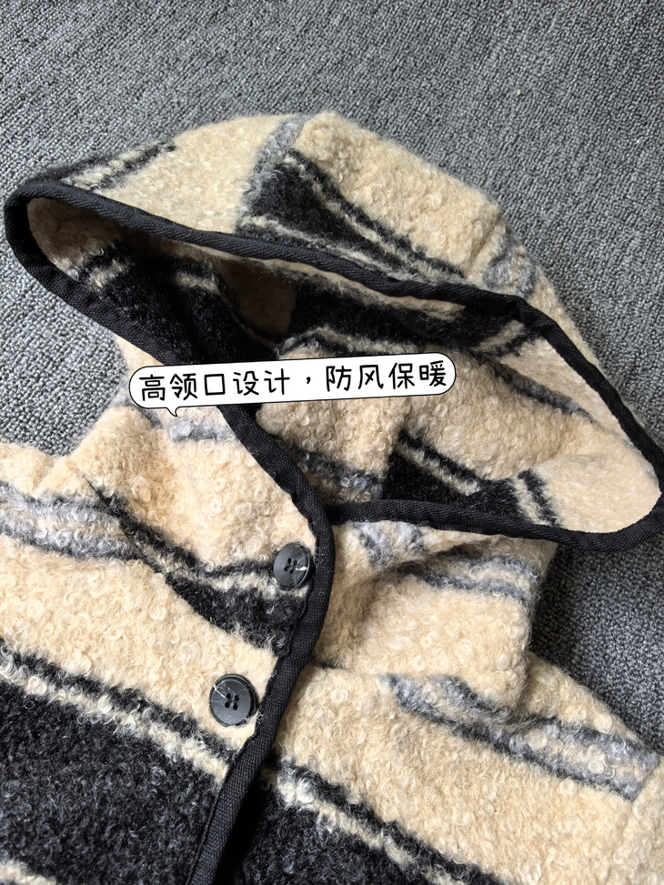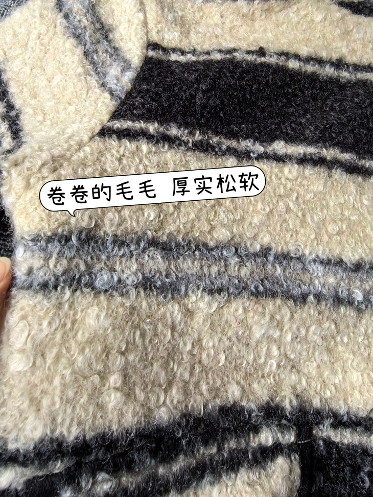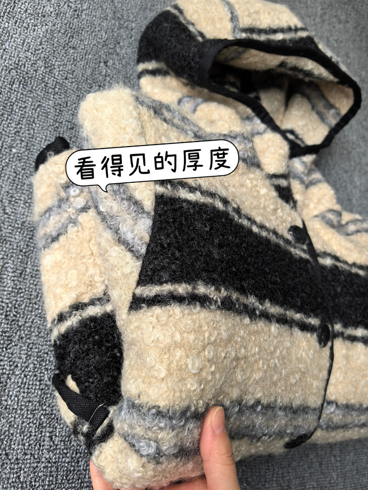 羊羔毛的温暖属性wan美解锁冬日保暖穿搭 这款特意做的是连帽的版型,上身提升保暖性,造型十足 衣身下来整体是H型的,上身立体有型,不会显得松垮臃肿 我们在两侧做了圆角贴袋,增添俏皮氛围又能满足实用需求 以及在袖口、口袋边缘和门襟做了整圈全包边,一整个细节拉满 我们选用的圈圈毛面料手感软糯,蓬松厚实,穿起来舒适无比 毛色款式是做的条纹设计,经典耐看又减龄 入冬穿上这件外套,就能轻松唤醒冬日元气啦