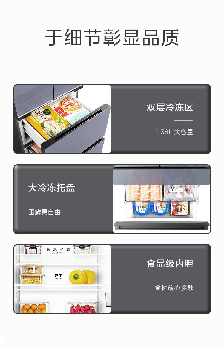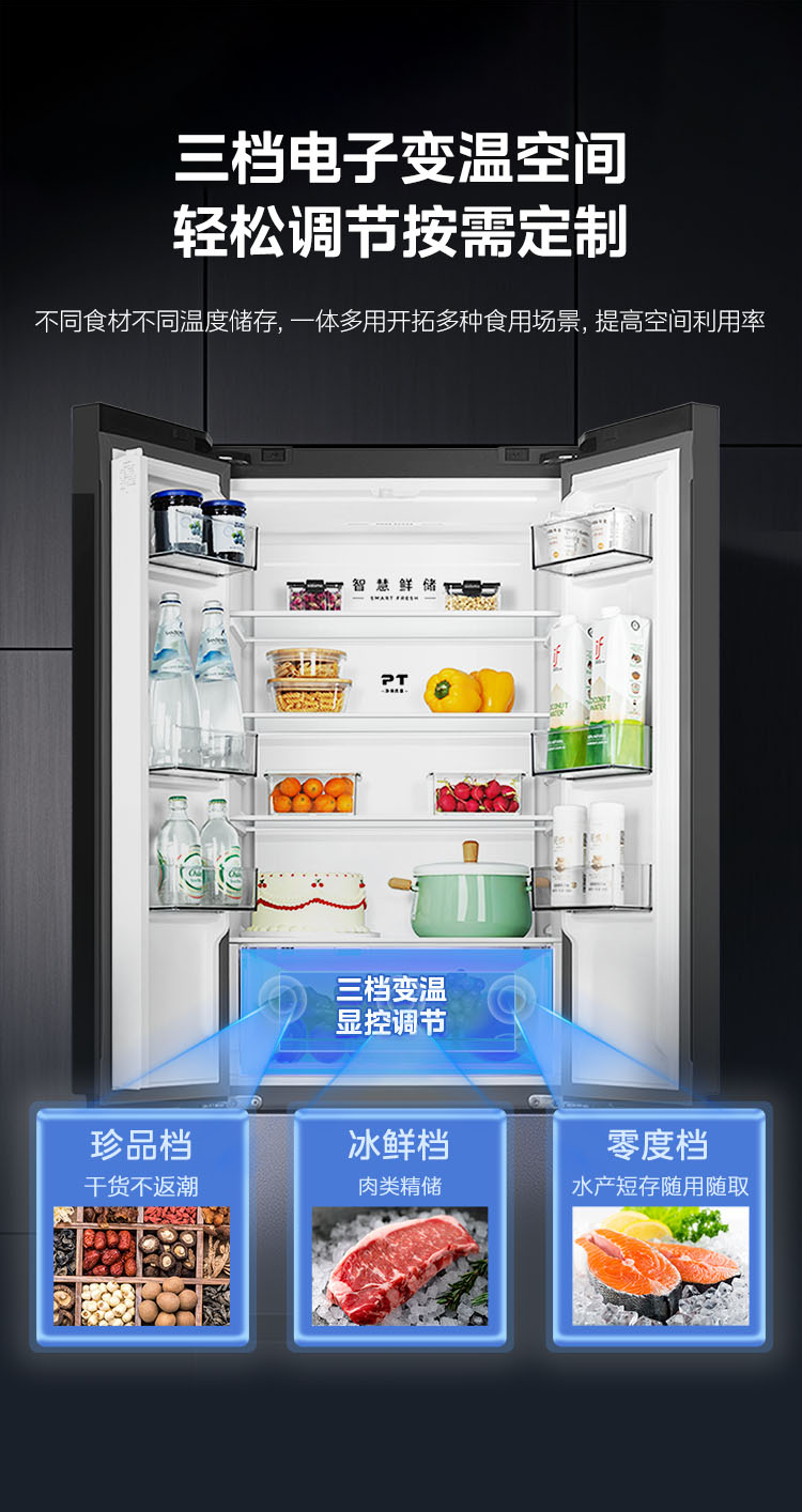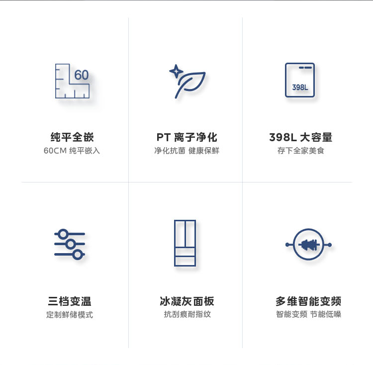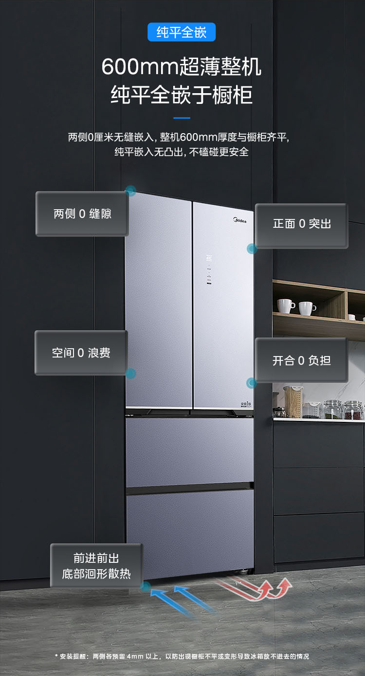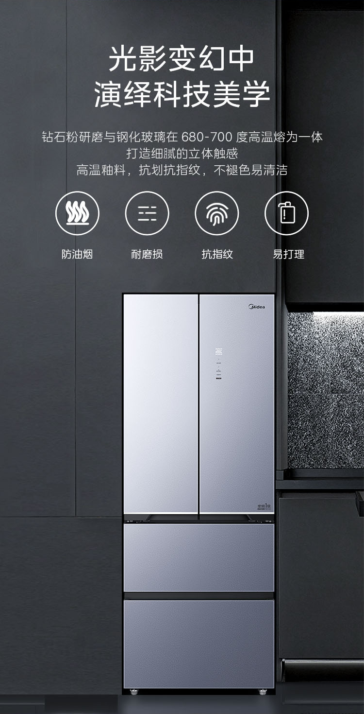美的冰箱BCD-398WUFGPM冰凝灰 纯平全嵌,60CM超薄整机;全空间PT离子净化,守护食材新鲜;三档变温空间,提供多种分储;