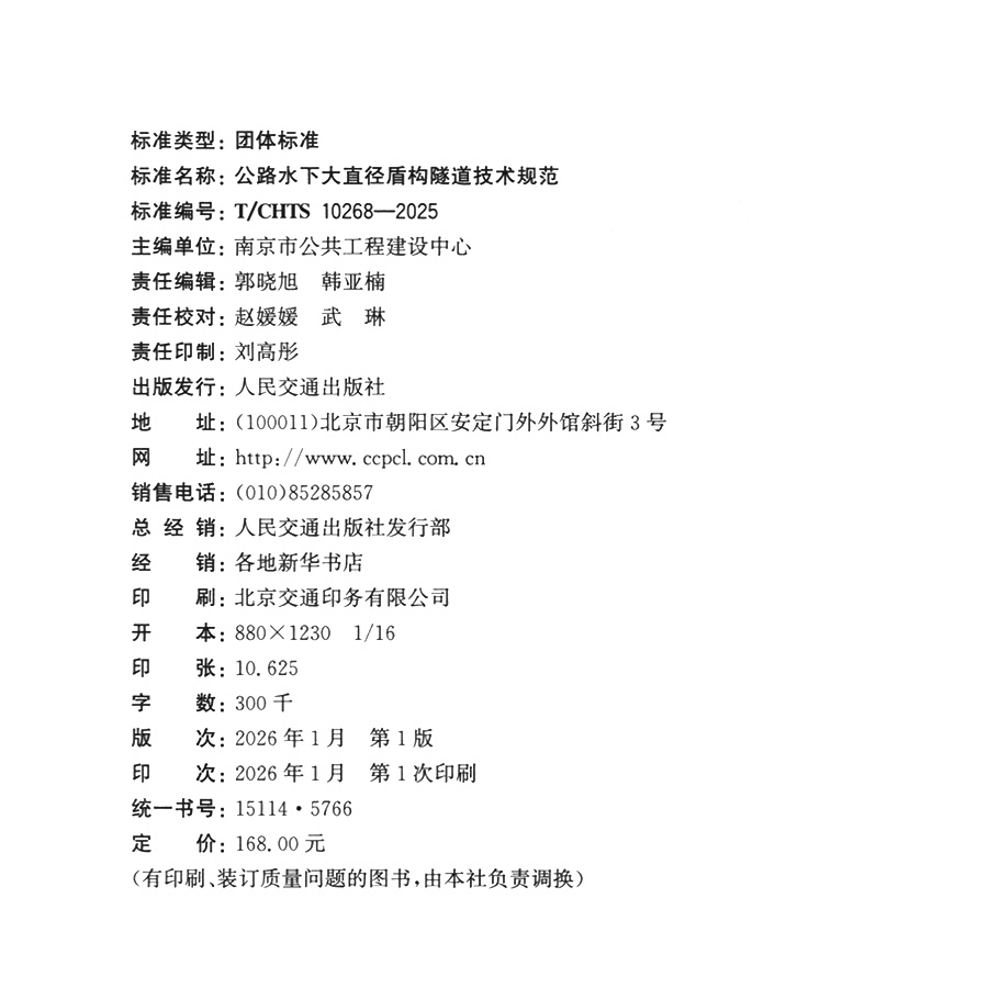 书名:公路水下大直径盾构隧道技术规范(T/CHTS 10268—2025)