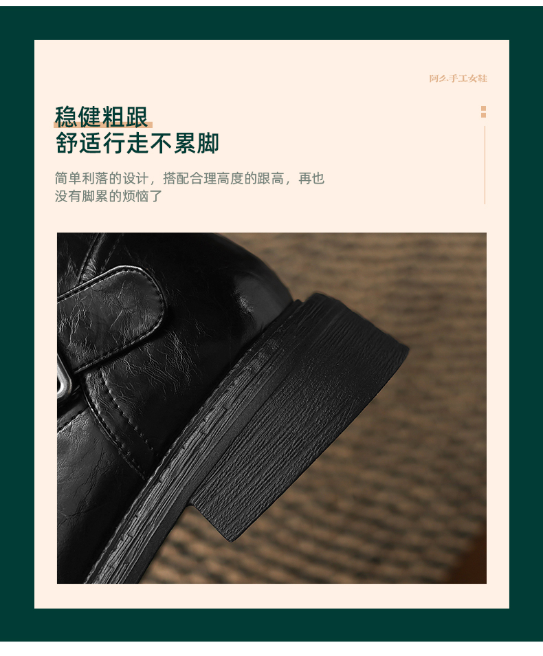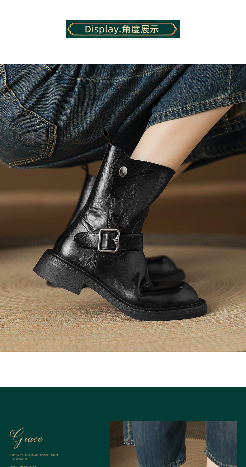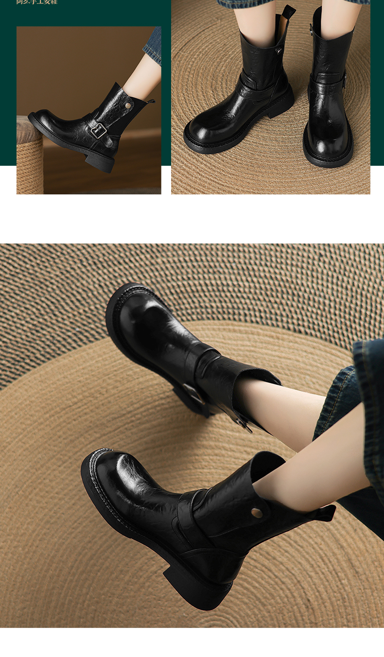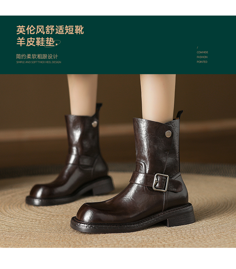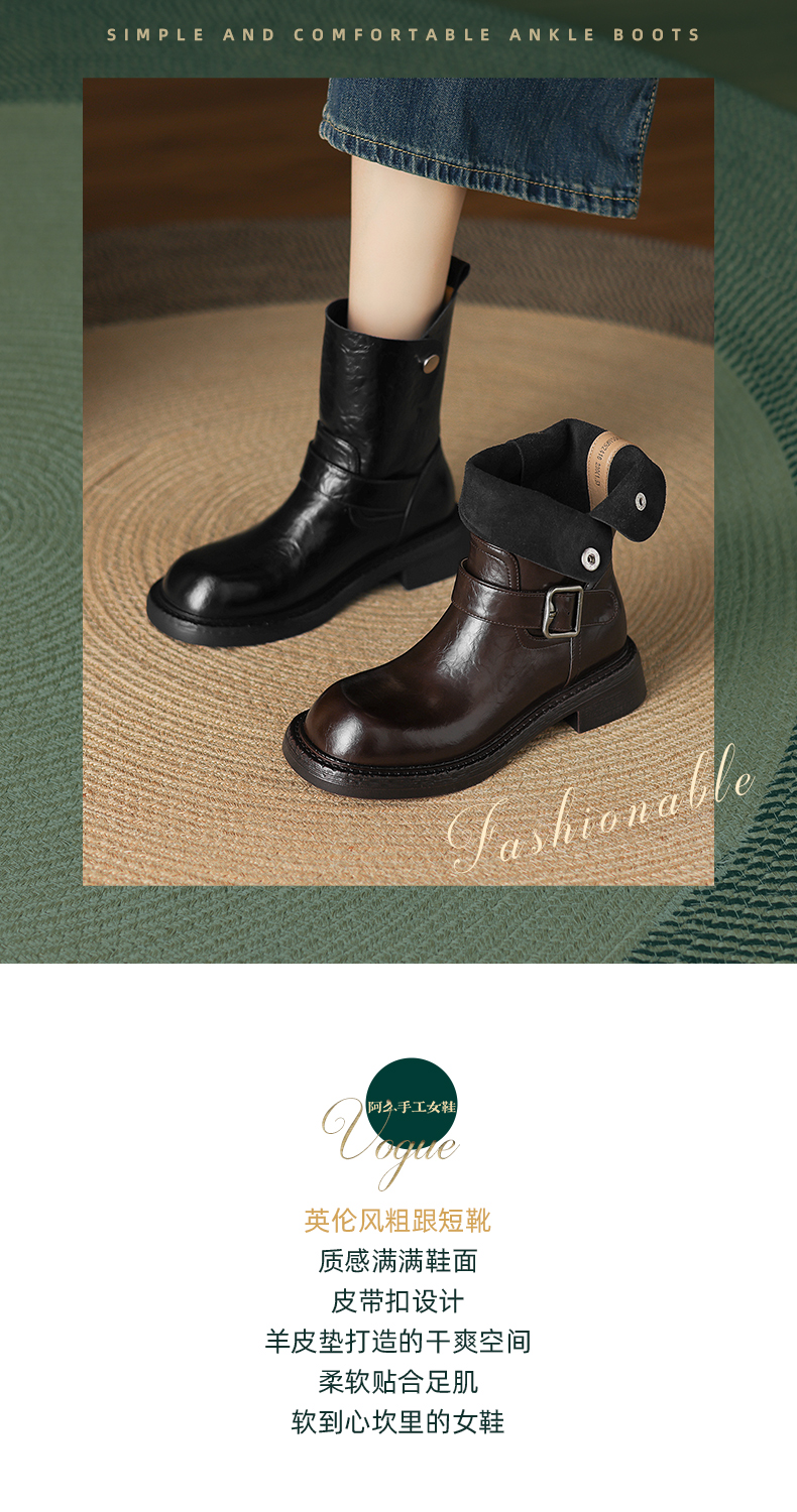 阿么手工女鞋皮带扣欧美风机车靴高级感复古真皮百搭短靴秋冬4CM