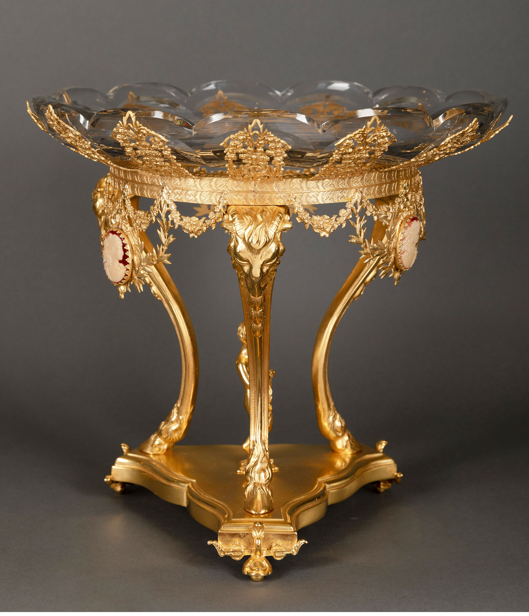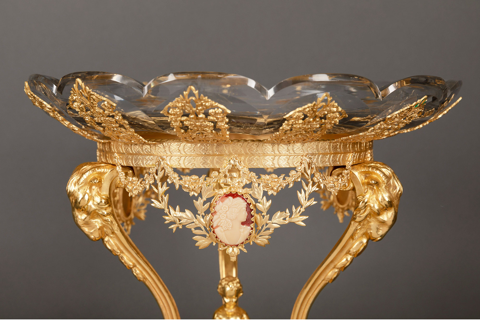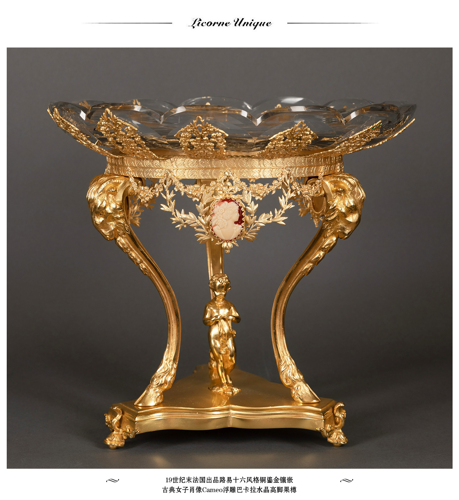 独角鹿西洋古董铜鎏金镶古典女子Cameo浮雕巴卡拉水晶高脚果樽