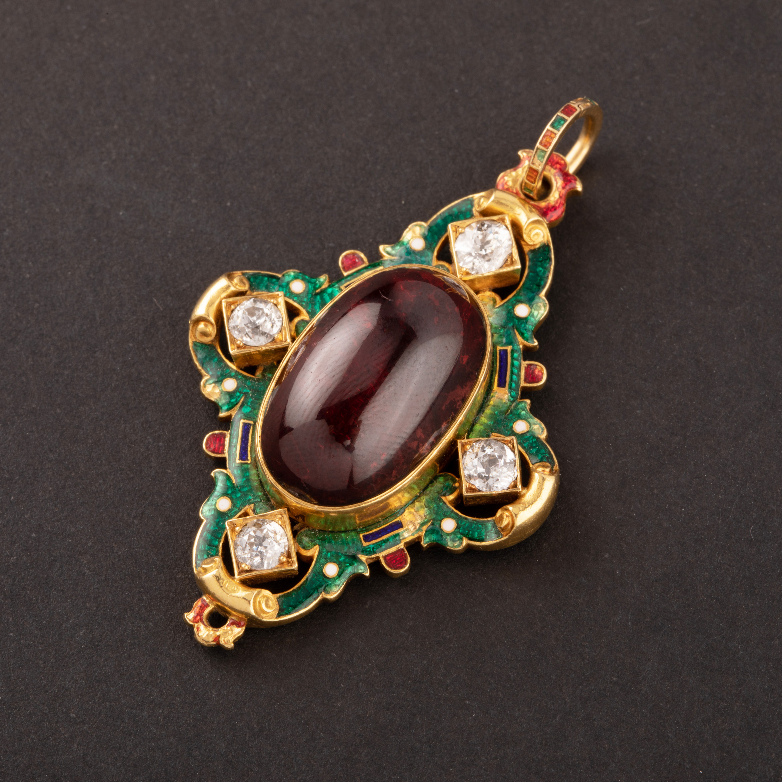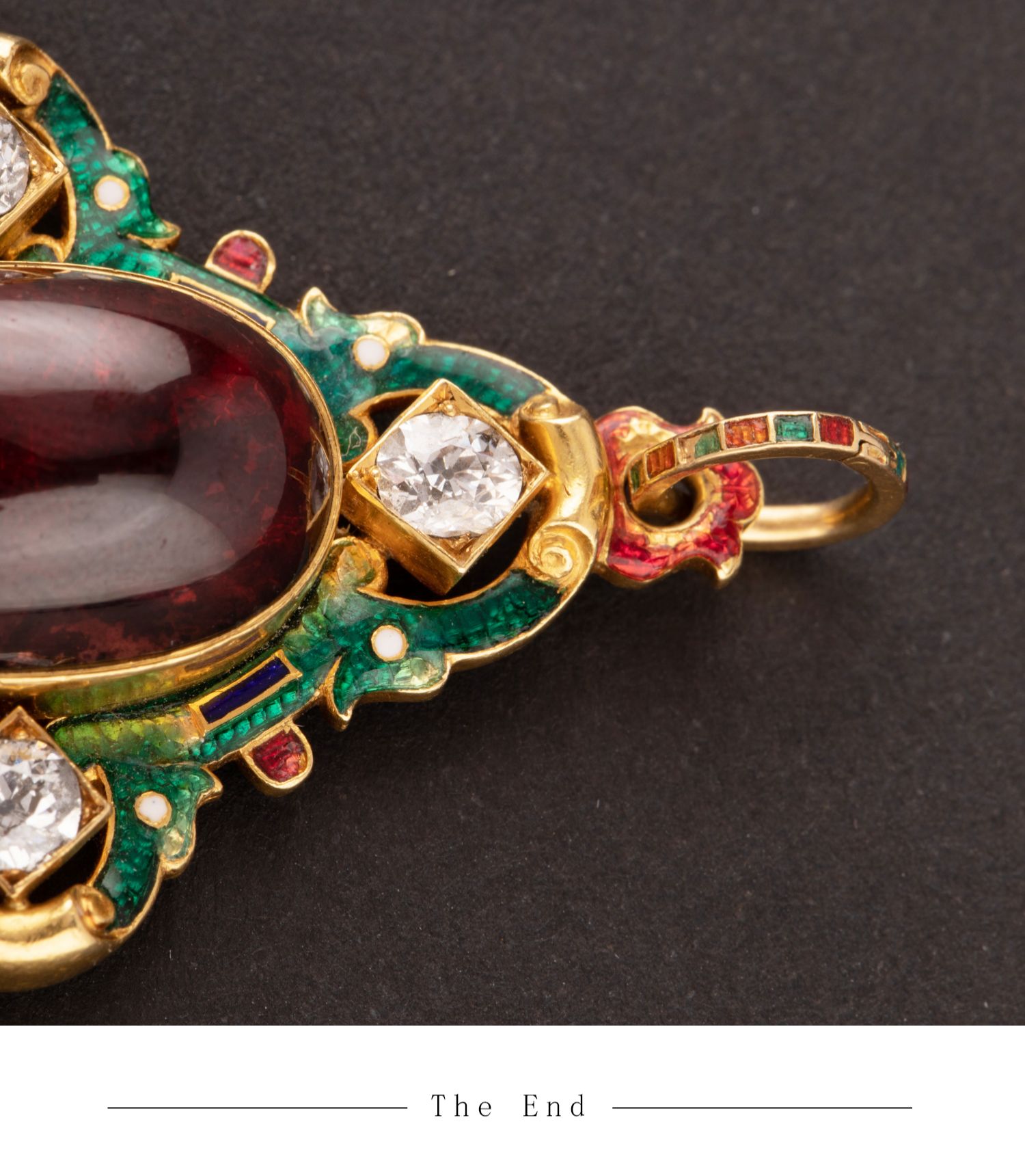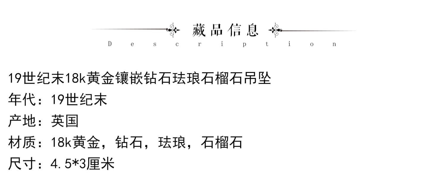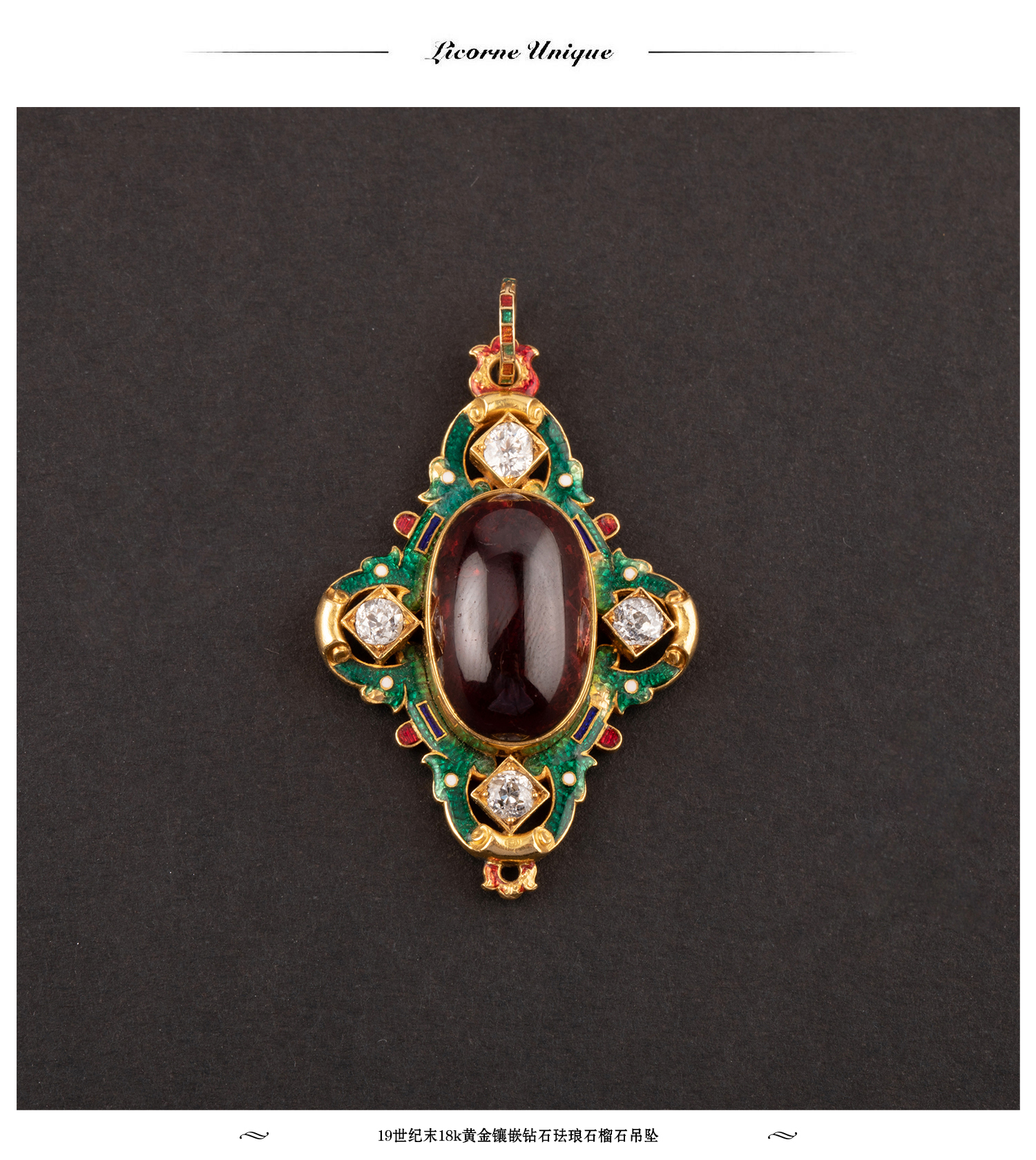 独角鹿西洋古董珠宝首饰19世纪末18k黄金镶嵌钻石珐琅石榴石吊坠