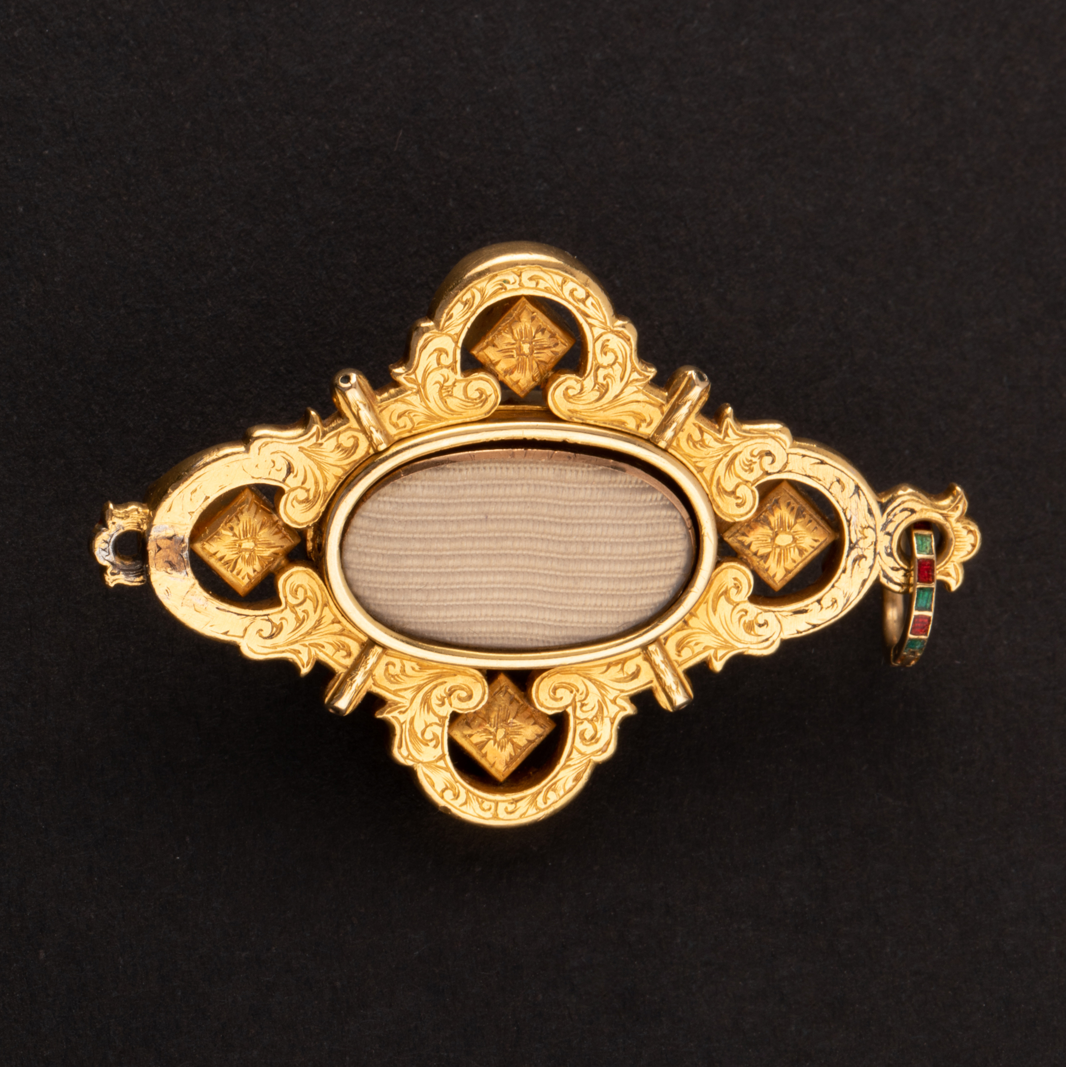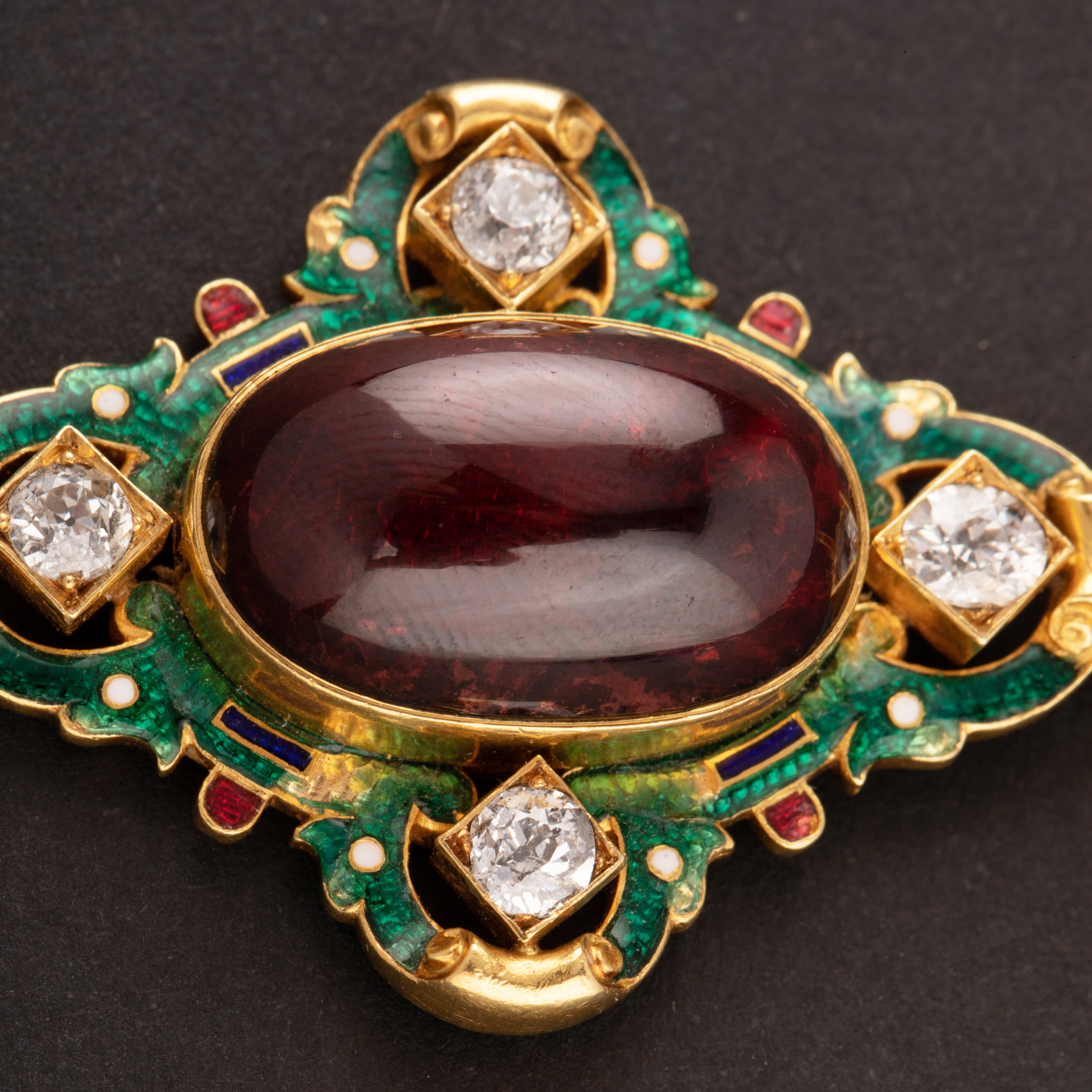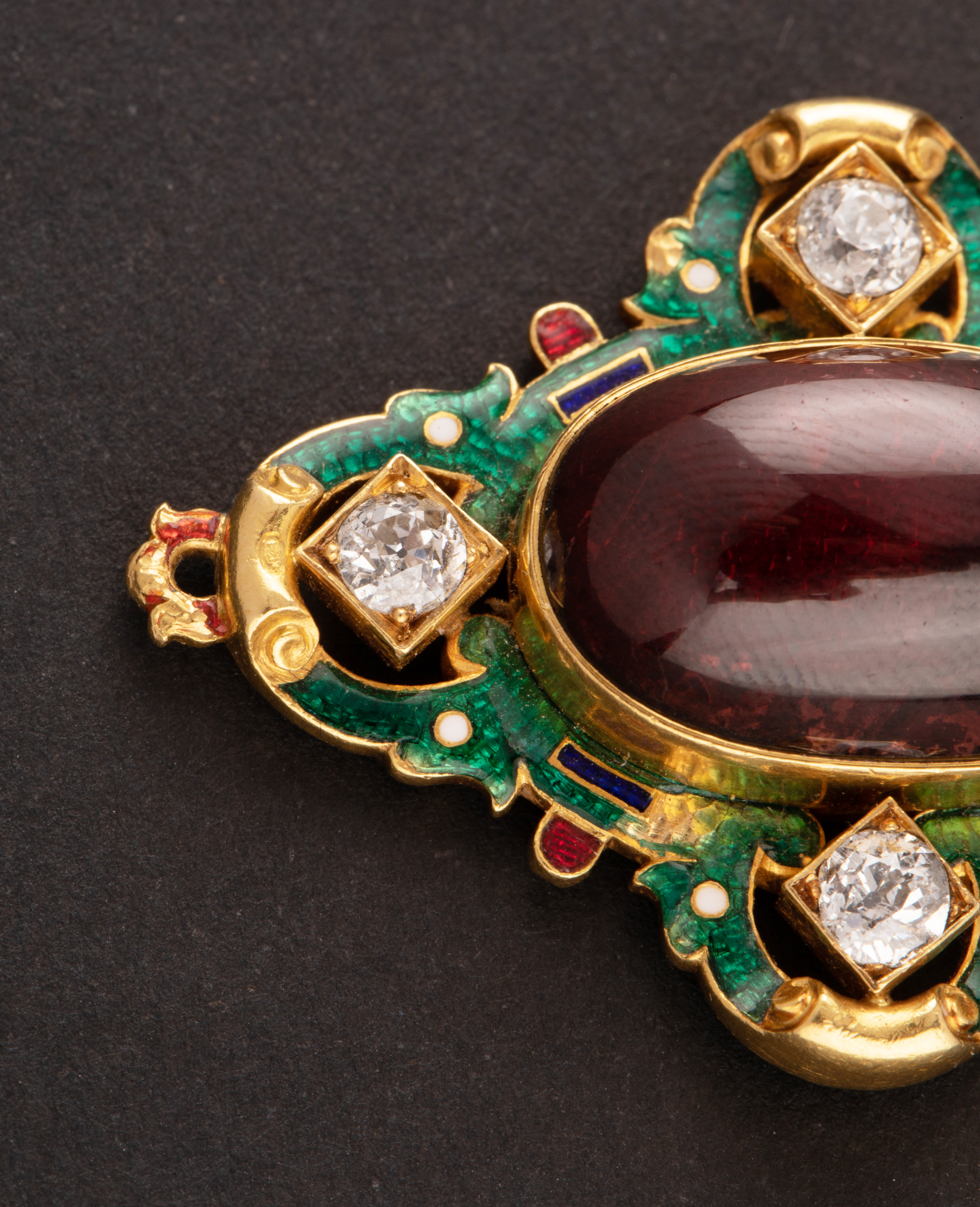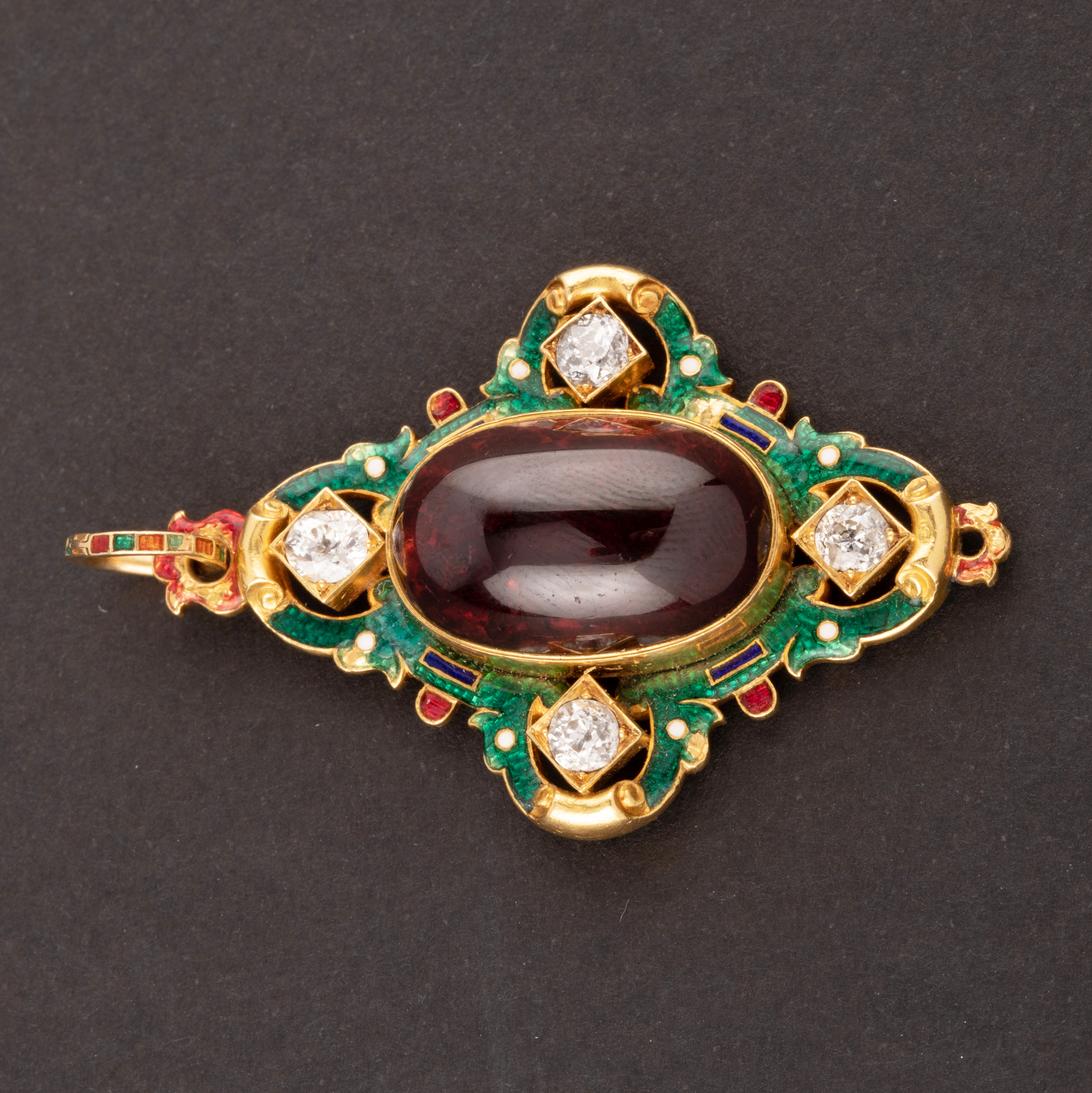 独角鹿西洋古董珠宝首饰19世纪末18k黄金镶嵌钻石珐琅石榴石吊坠