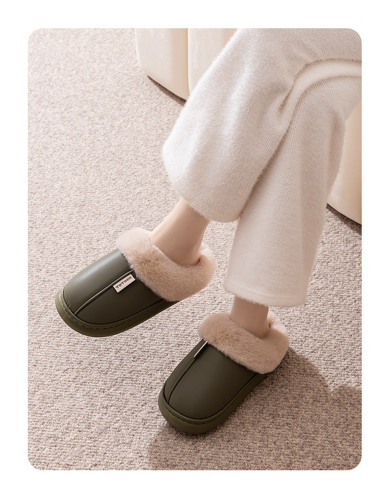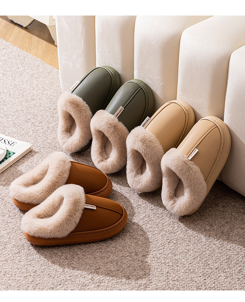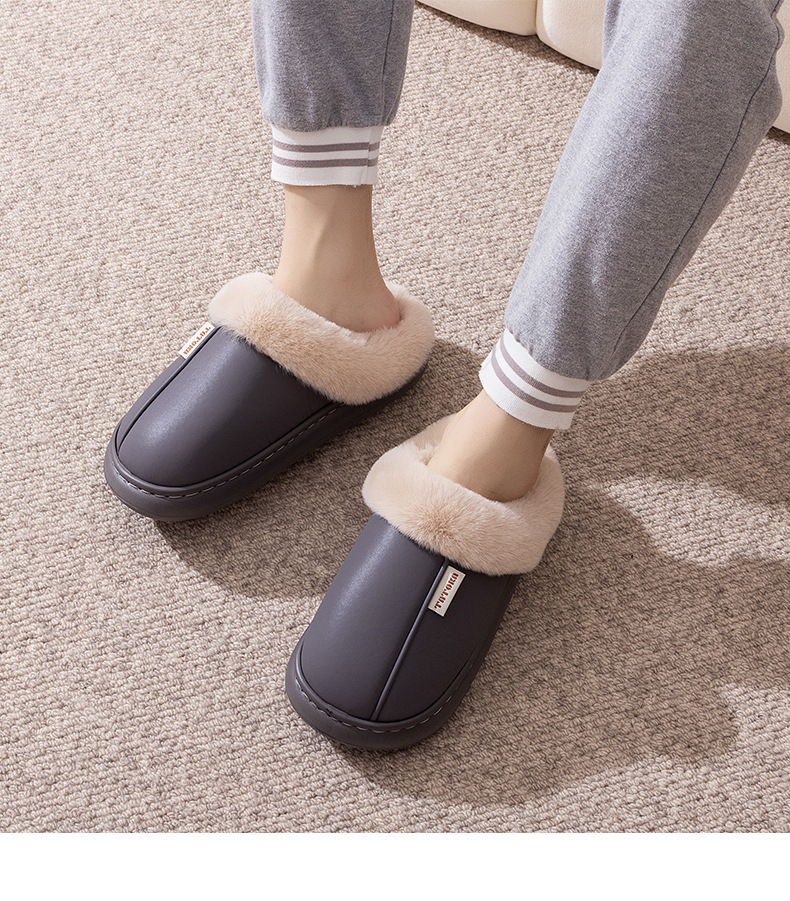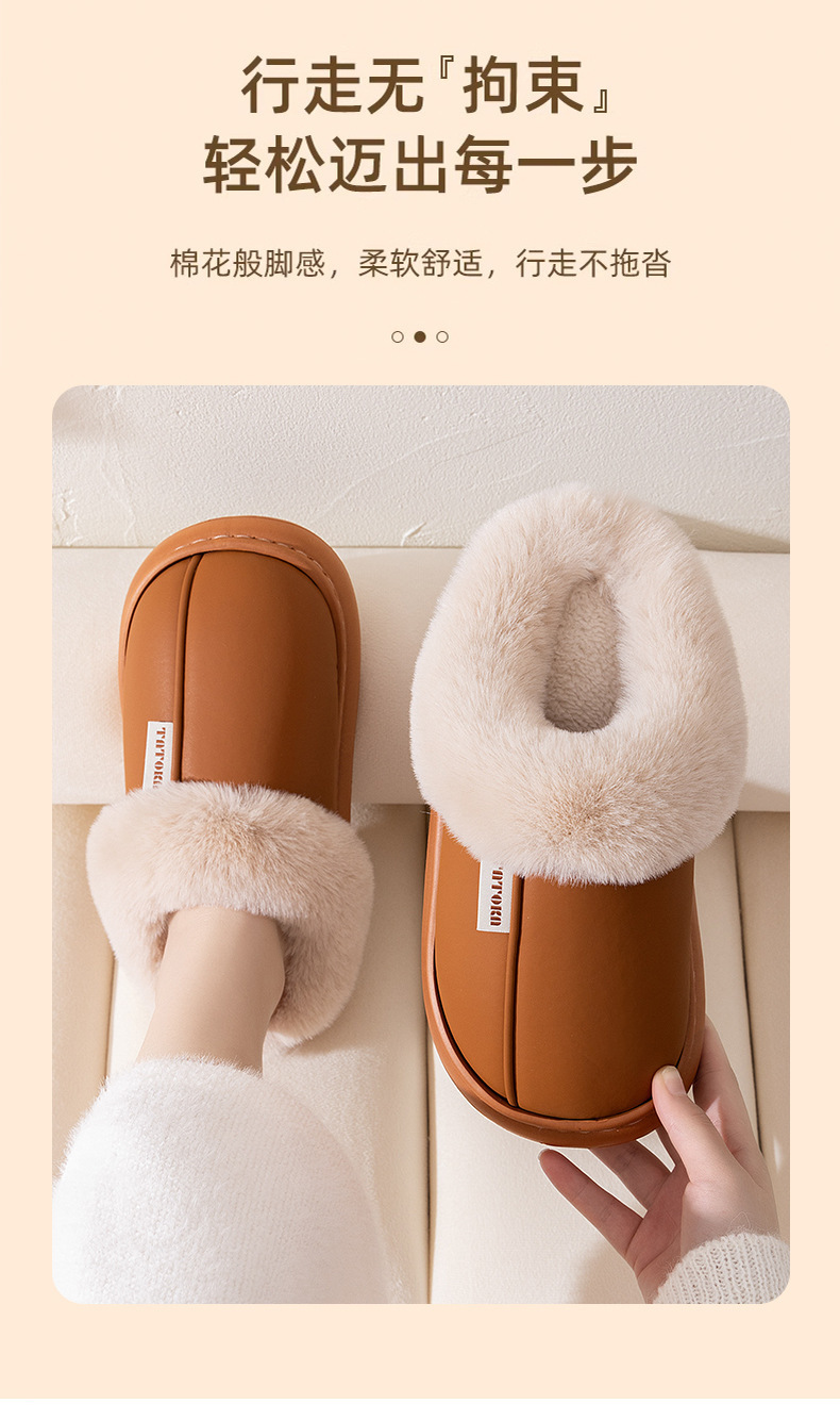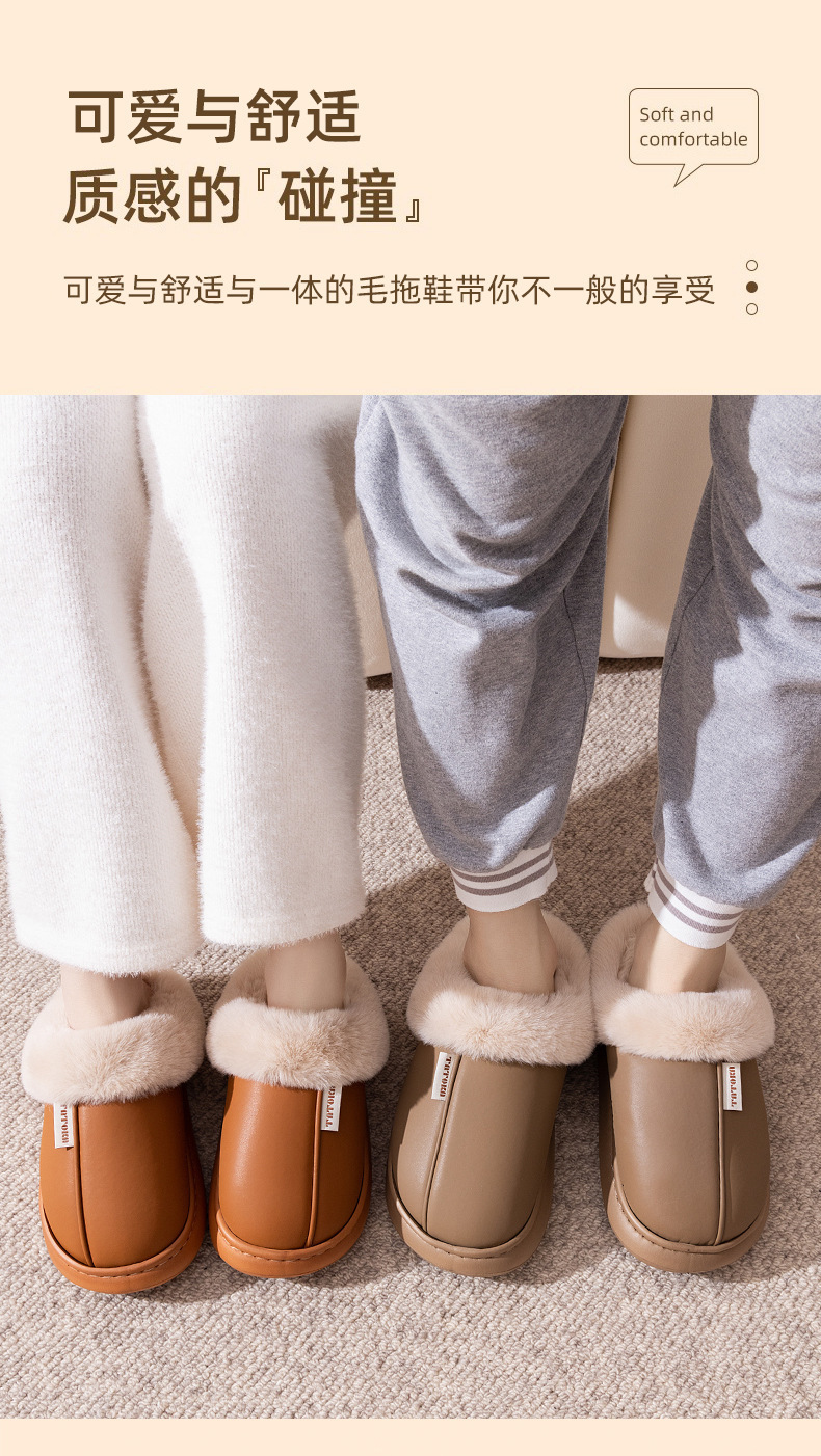「PU防水鞋面!EVA厚底」2024新款棉拖鞋 女生秋冬季pu皮防水保暖加绒简约情侣居家毛绒拖鞋