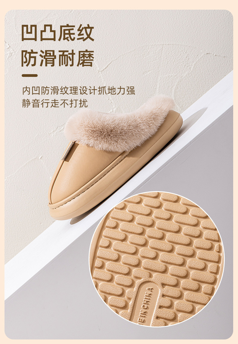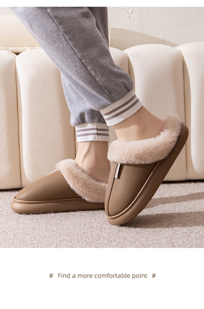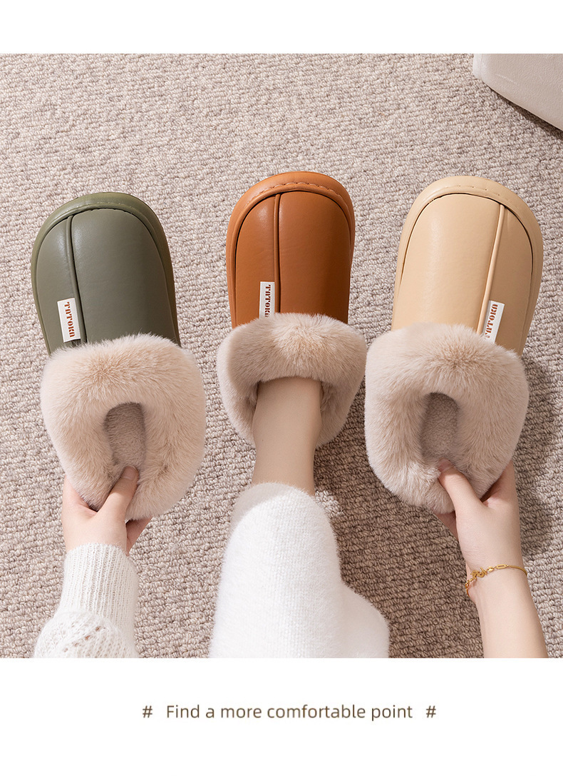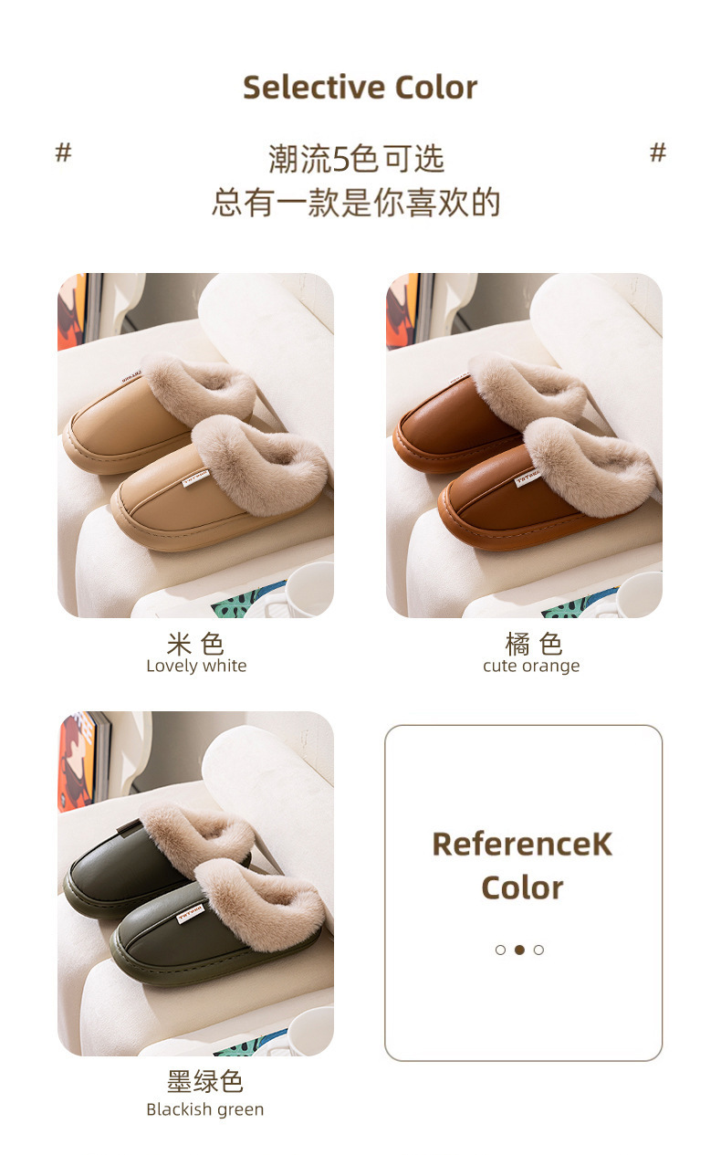 「PU防水鞋面!EVA厚底」2024新款棉拖鞋 女生秋冬季pu皮防水保暖加绒简约情侣居家毛绒拖鞋