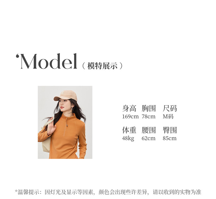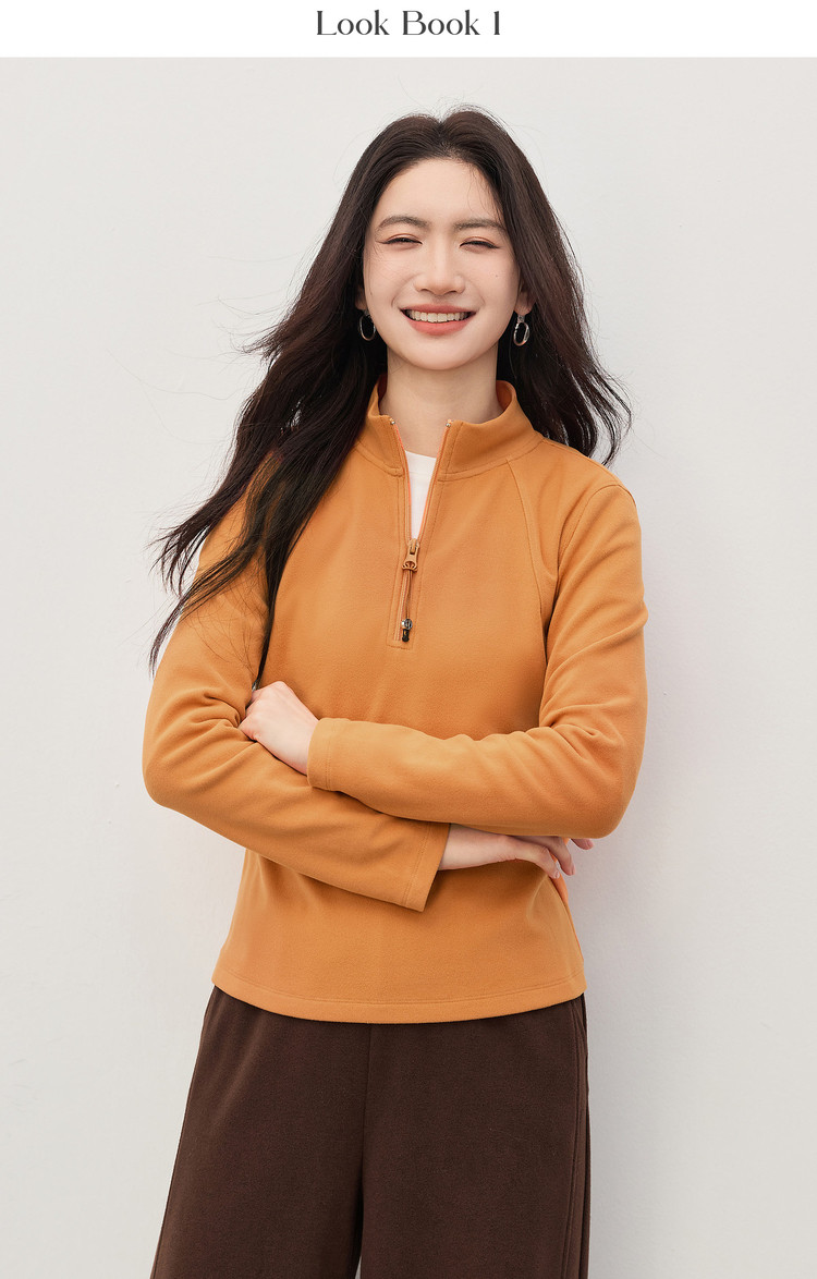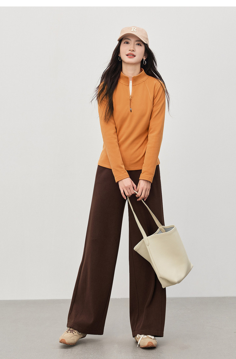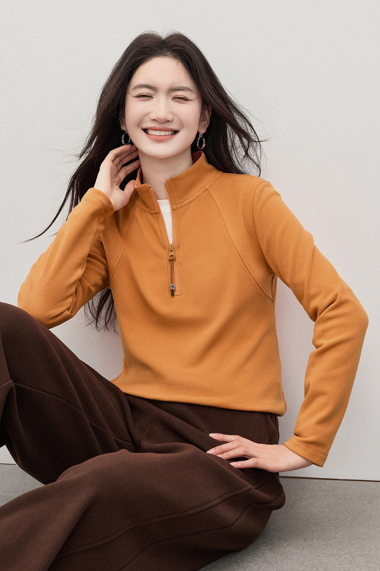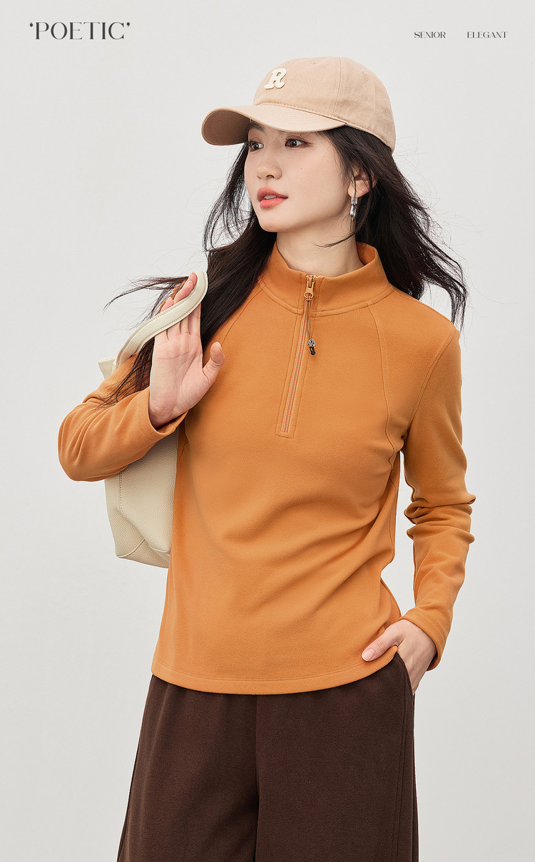 【1/21新品】熙世界橘色半拉链立领T恤打底衫女秋冬高级感户外风运动长袖上衣