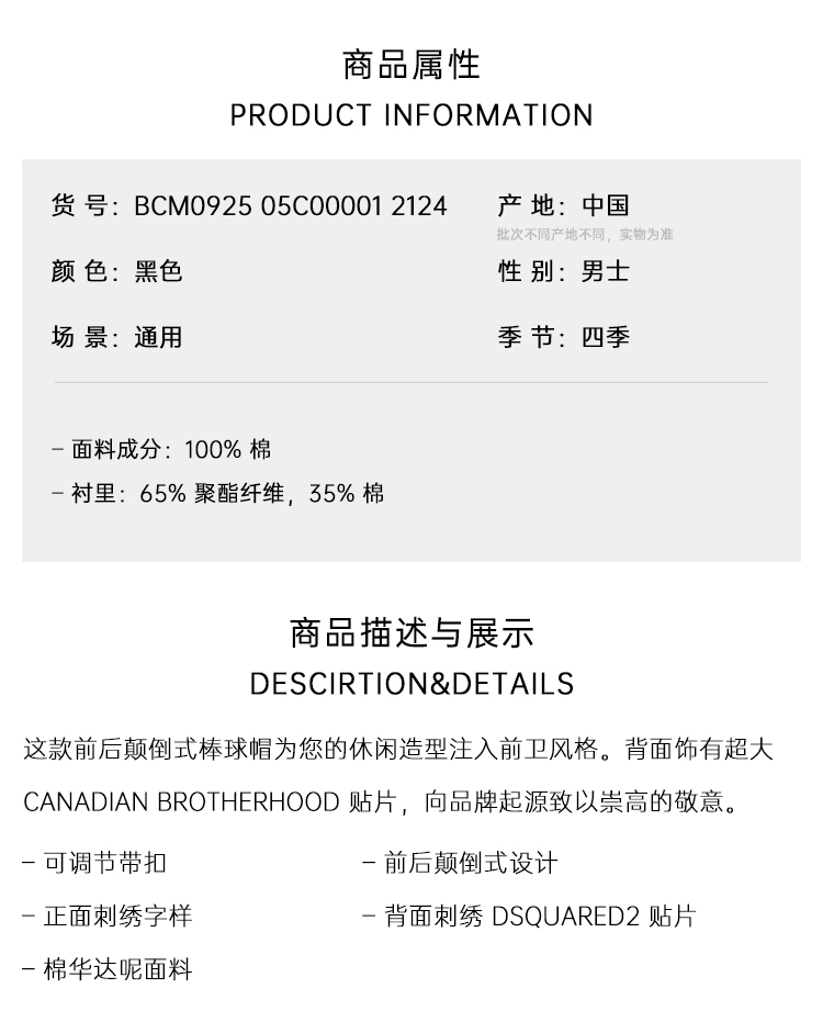 DSQUARED2 男士加拿大徽章棒球帽 黑色 BCM0925 05C00001 2124