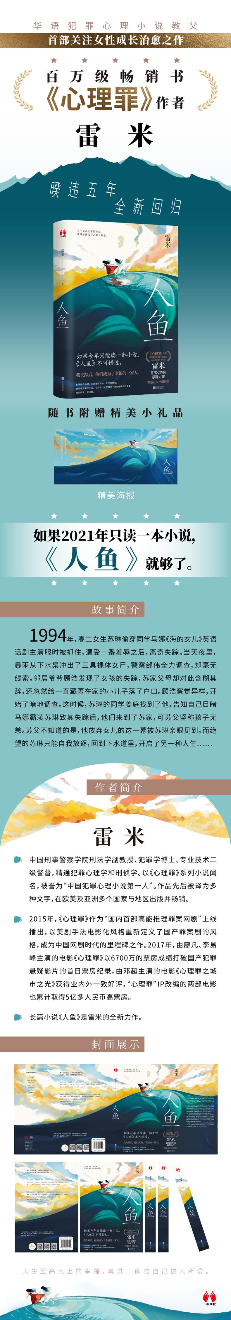 《人鱼》是一部长篇小说。作品以两个女高中生为主人公,从受害者与目击者视角,讲述了上世纪90年代几个平凡家庭的善恶与悲喜。爸爸用我做了利益交换,筹码是我的消失,妈妈哭泣过,最终沉默了。反正我们之间除了血缘关系,什么都没有。反正只要有弟弟,他们就是幸福的一家人了。我并不觉得愤怒,只打算像个蛆虫一样平凡地活下去。……此时此刻,我坐在下水道里写下这些,内心始终有一种奇怪的感觉。似乎我过去、现在、将来一直都属于这里。我身上的某种牵绊——与头顶那个世界联结的——已经被割断了。在我的生活中始终出现的减号,终于到了尽头,划上了等号。在等号的后面,我看到了“零”。1994年,我的人生要重新开始了。