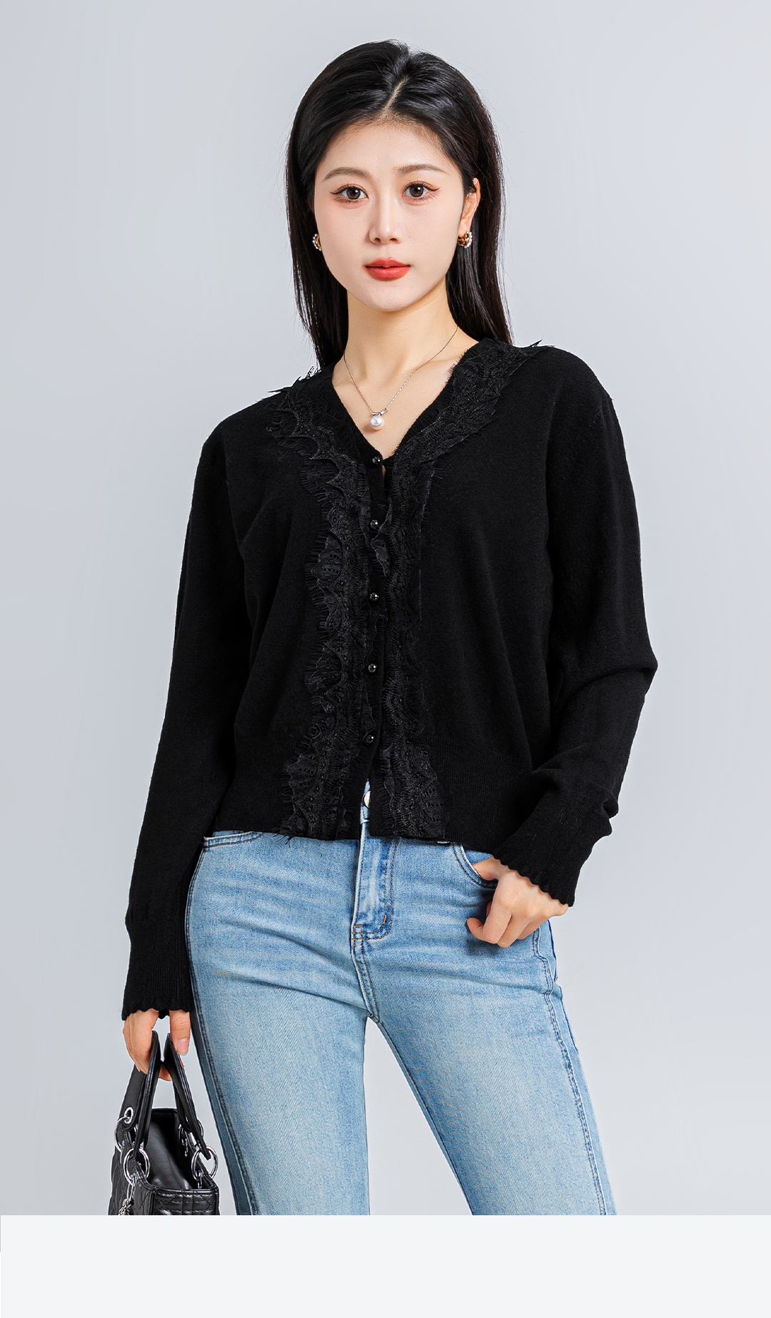 春上新蕾丝拼接V领秋冬新款软糯亲肤毛衣1261017