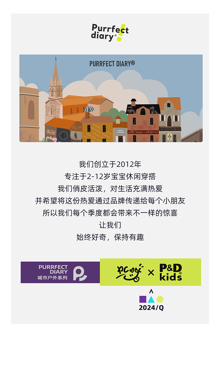 Purrfect-Diary专注于贴近自然随性的穿着概念,轻奢平价的童装文化传播,在产品设计上更加注重婴童穿着的舒适性、安全性、更出众的国际化品牌,将欧美的育婴文化在中国进行深入的传播与推广。