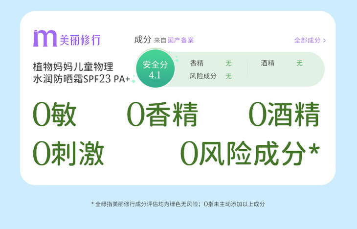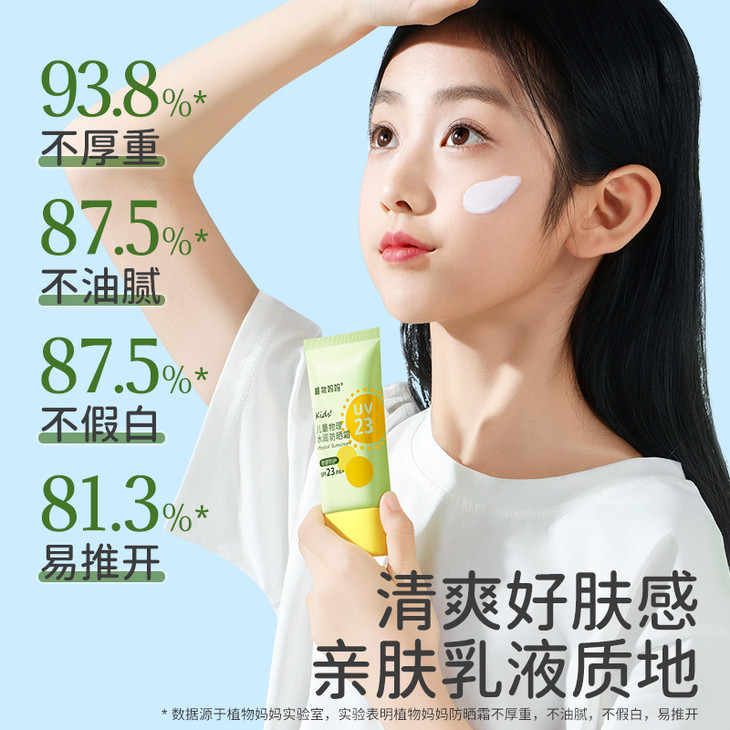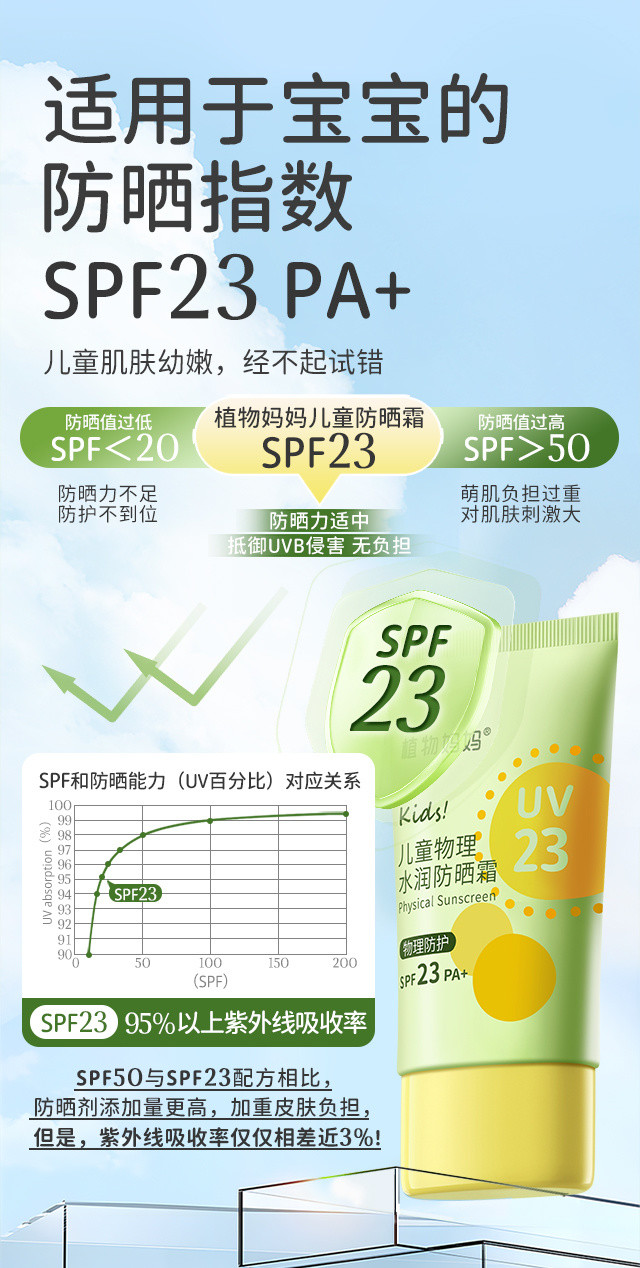 ✅更适用于宝宝的防晒指数SPF23PA+ 儿童肌肤幼嫩,经不起试错。 防晒值过低(SPF<20)防晒力不足防护不到位; 防晒值过高(SPF>50)负担过重,对宝宝肌肤刺激大。 植物妈妈儿童防晒霜SPF23,防晒力适中,抵御UVB侵害扥同时对宝宝的肌肤无负担
