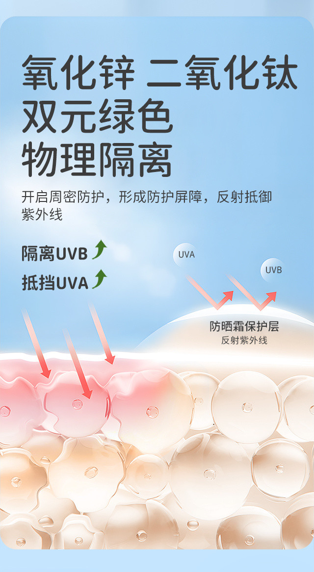 ✅纯物理防晒对宝宝高更加安全温和 物理防晒,能够有效放射紫外线,作为一款儿童防晒,做到100%纯物理防晒,温和不刺激,撑起物理防护伞。 氧化锌和二氧化钛,双元绿色,物理隔离,开启周密防护,形成防护屏障,反射抵御紫外线。