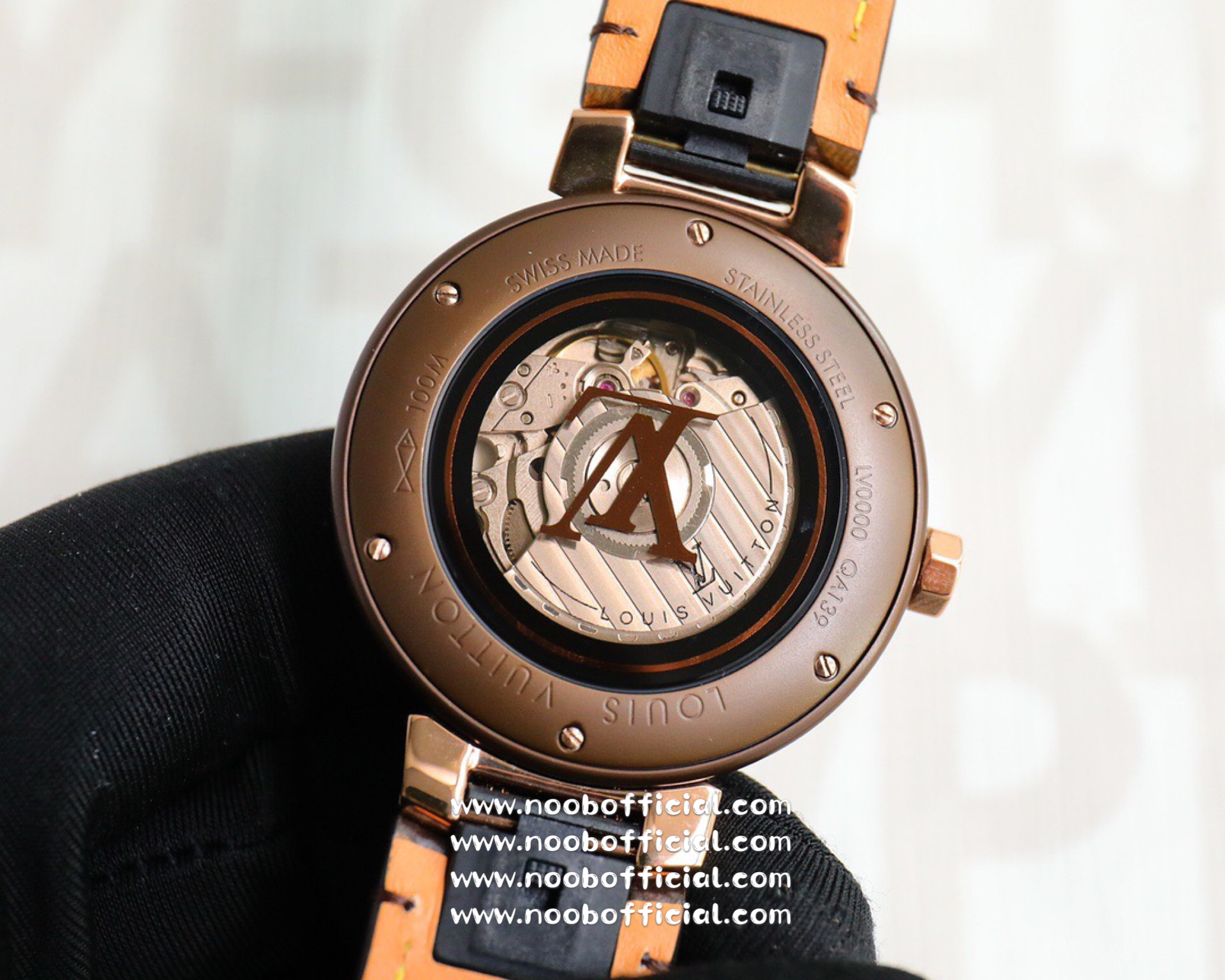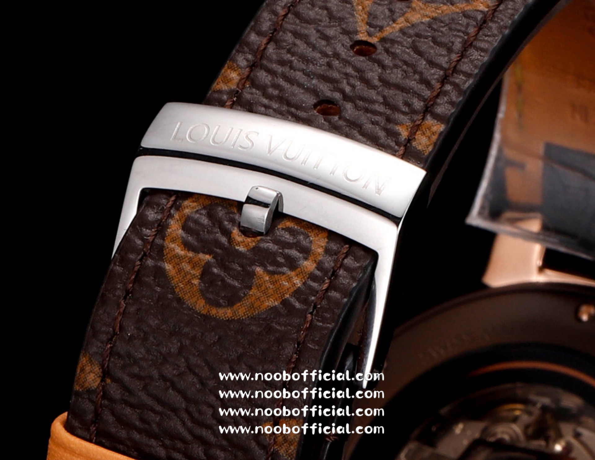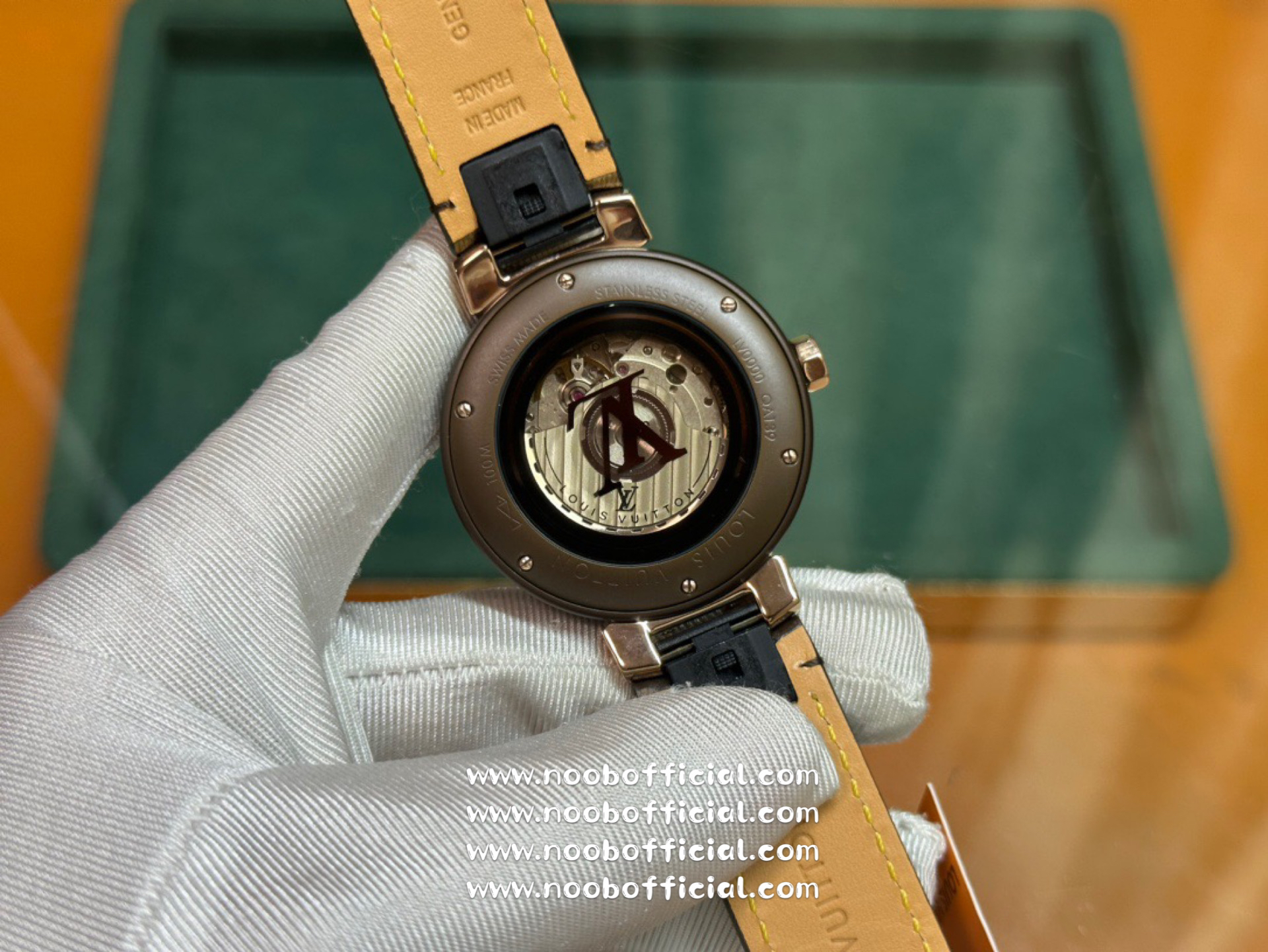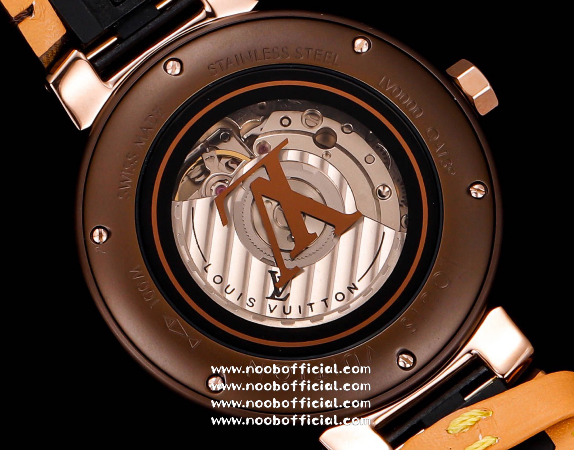 3.表壳:直径41.5毫米-肽壳 表圈刻有路易威登字母,表盘上带有AR涂层的蓝宝石水晶,透视底盖呈現完美机械动感-100米防水