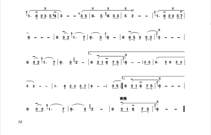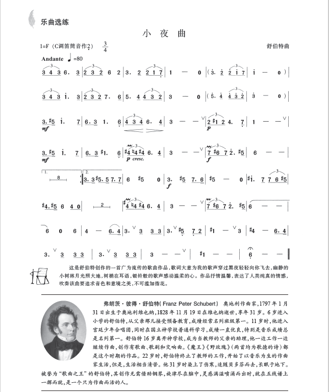 本教材精选了若干首人们所喜闻乐见的中外名歌、名曲,以全篇或选段的形式呈现,并根据竹笛演奏技法和表现特点,对其注上指法和演奏技法符号及简要的练习说明(其中部分由他人创编的曲目均在书中注明)。