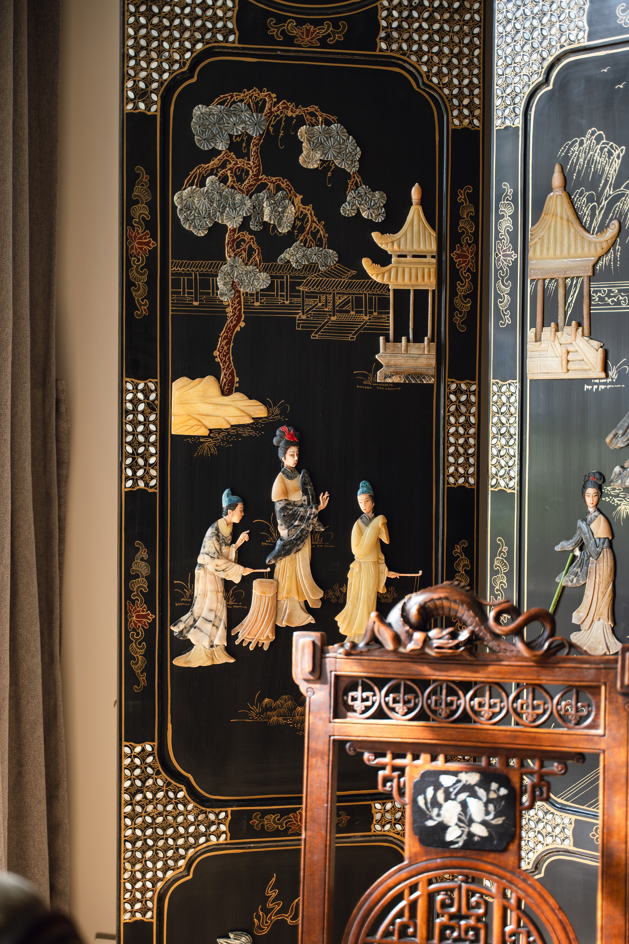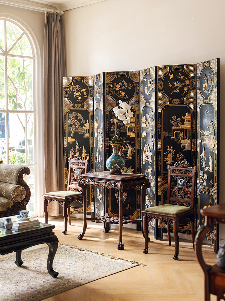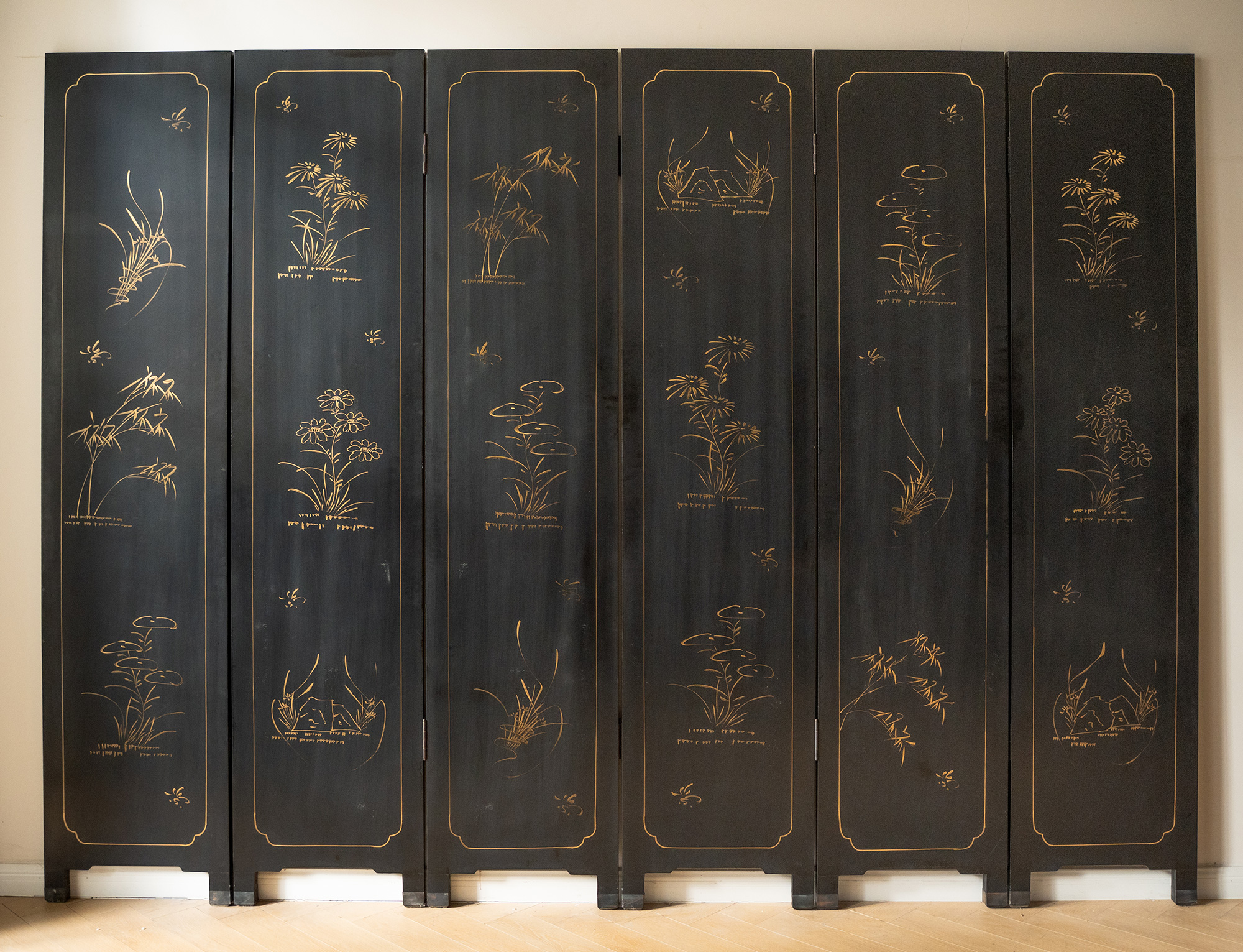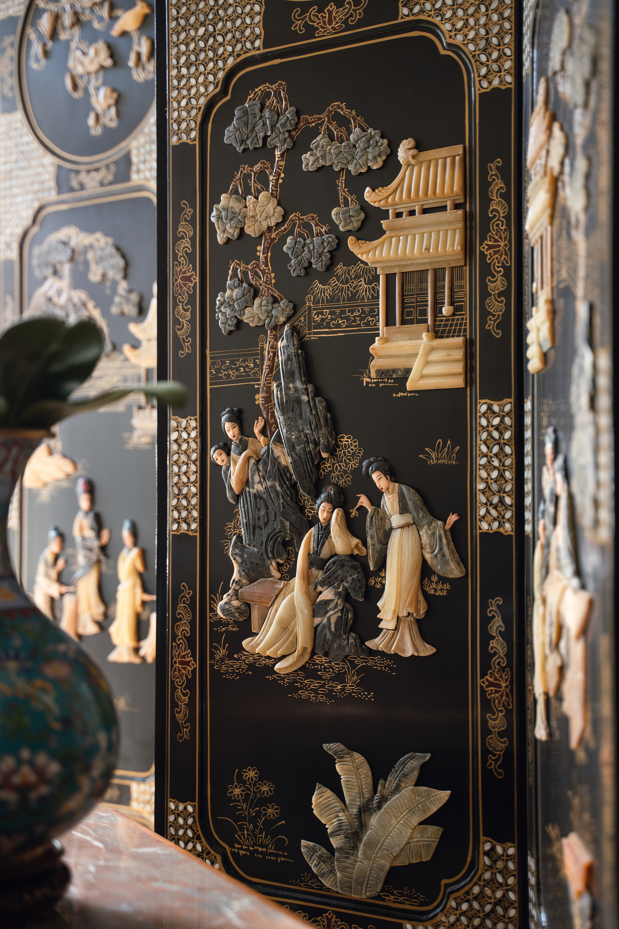 20世纪中国出品庭院仕女主题百宝嵌装饰螺钿木胎黑漆描金六曲屏风