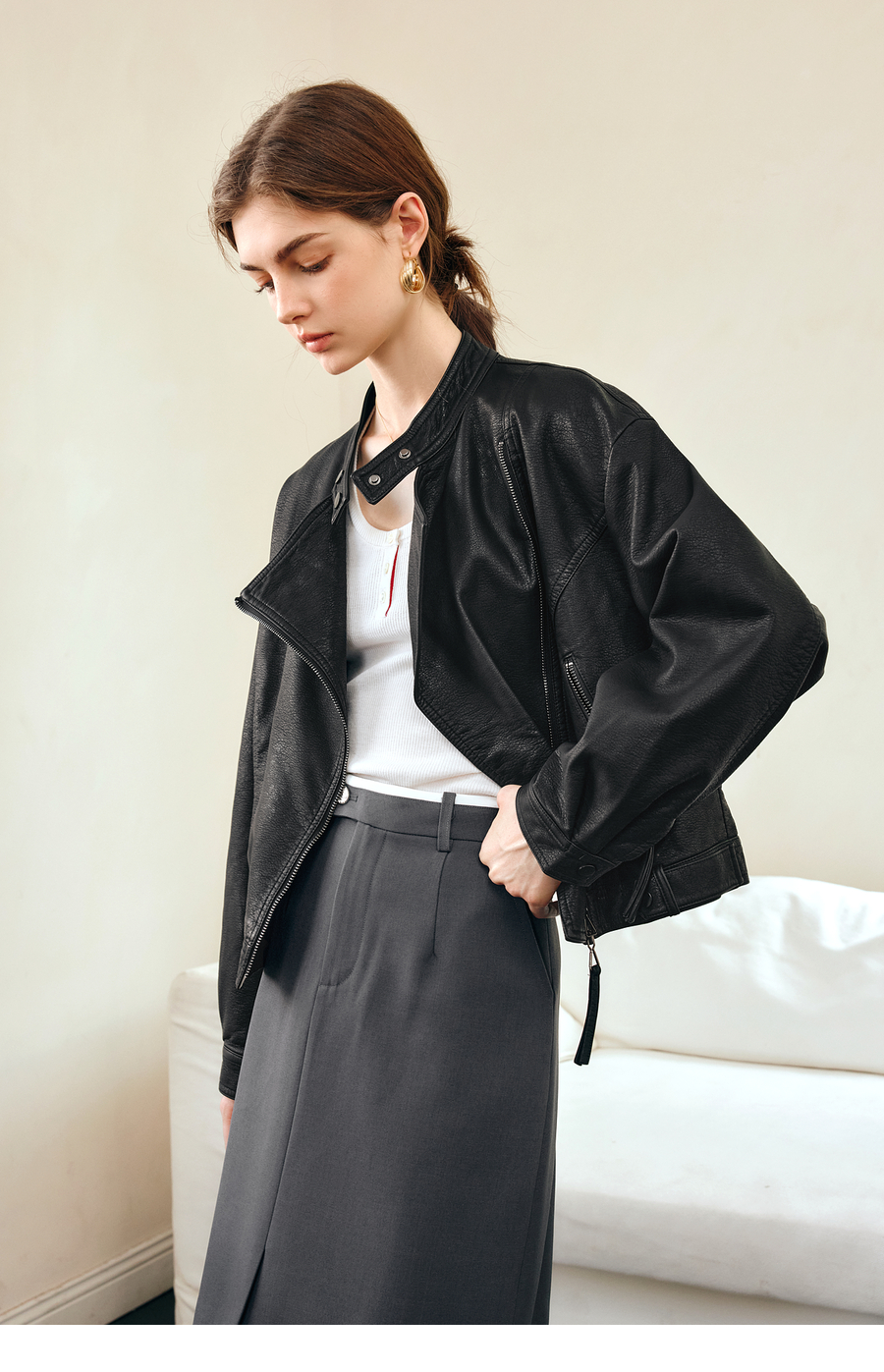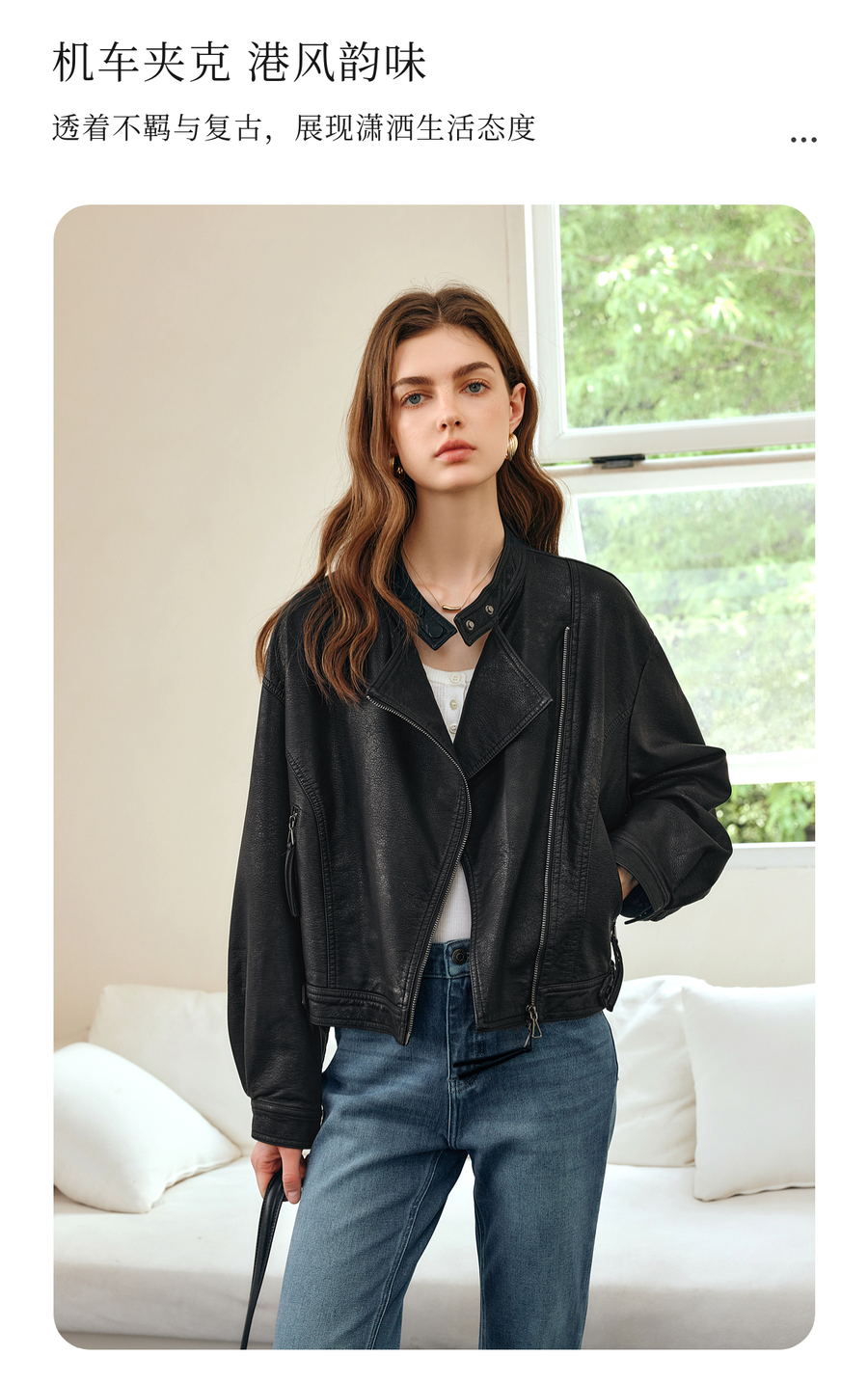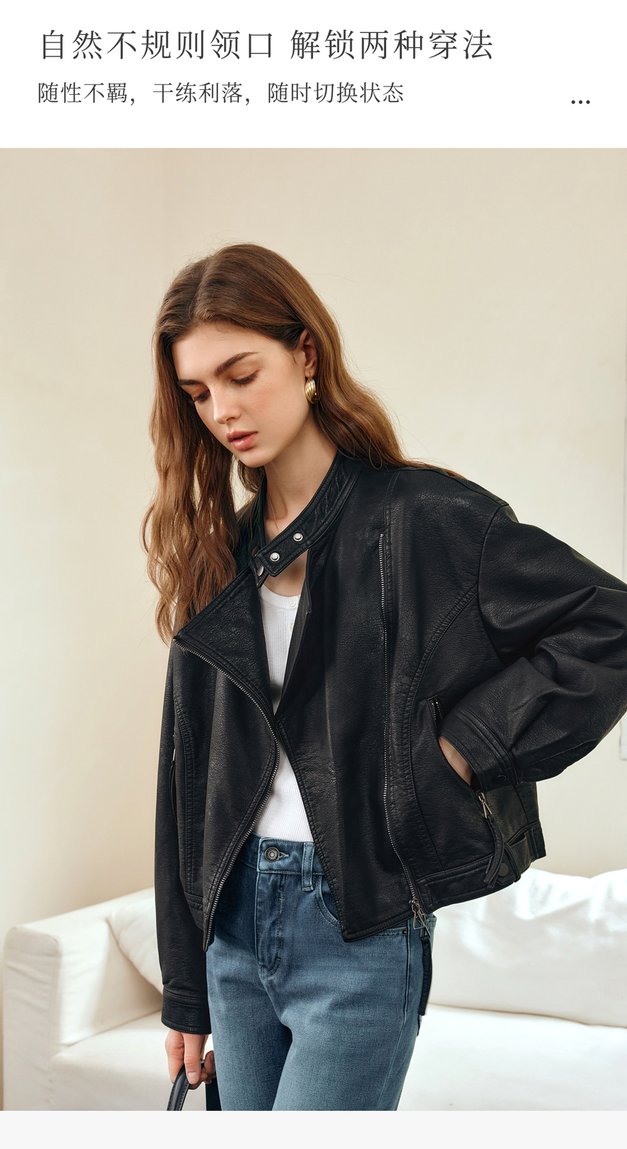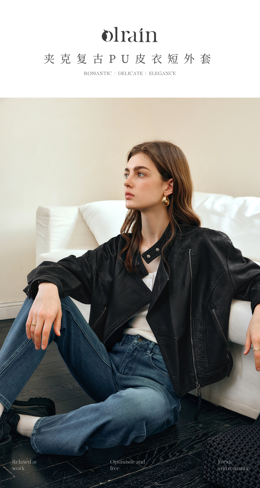 OLrain欧芮儿黑色短外套女秋季2025新款复古设计感不规则夹克皮衣