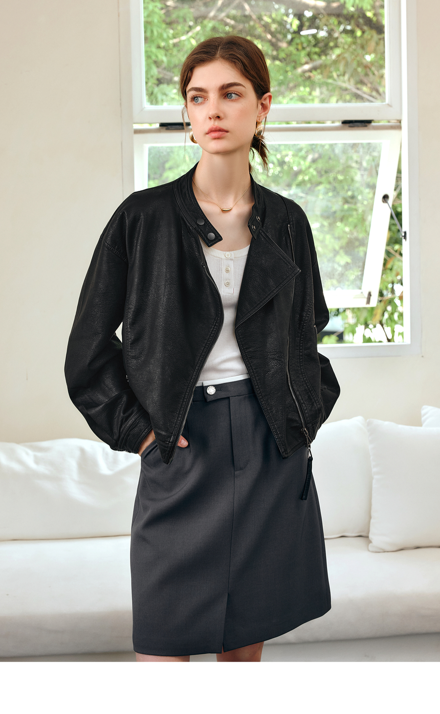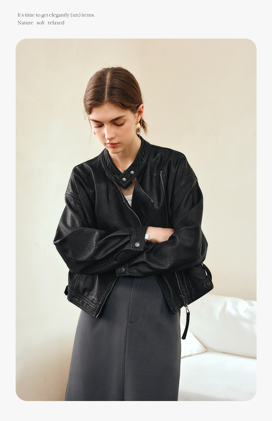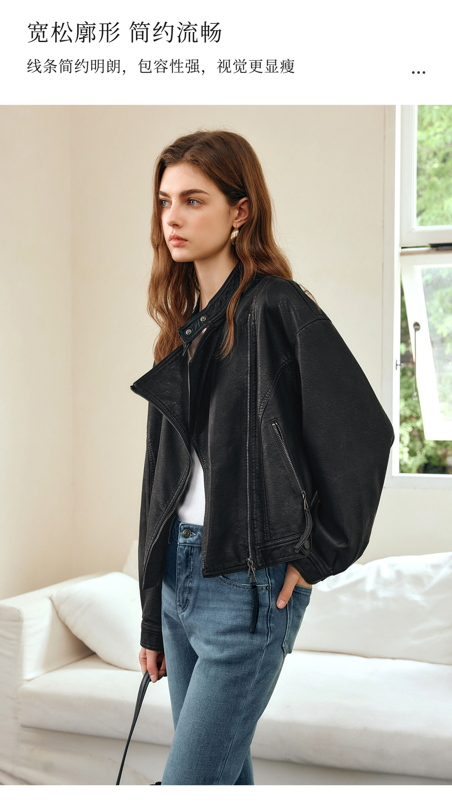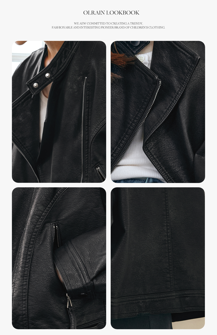 OLrain欧芮儿黑色短外套女秋季2025新款复古设计感不规则夹克皮衣