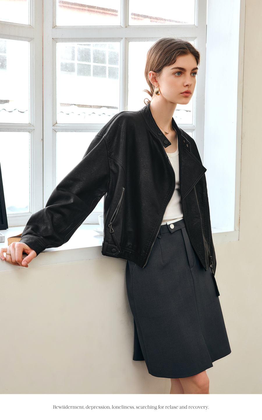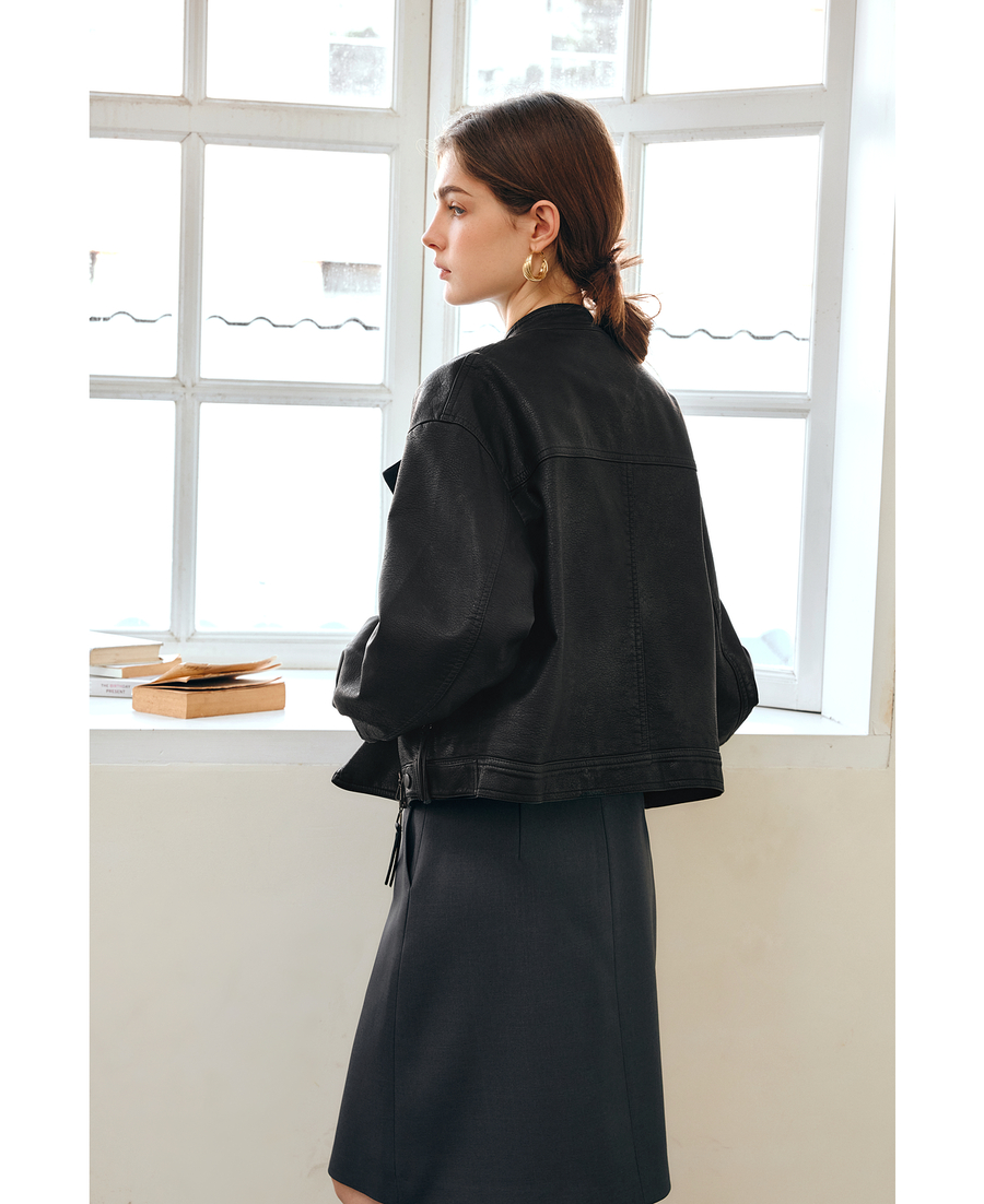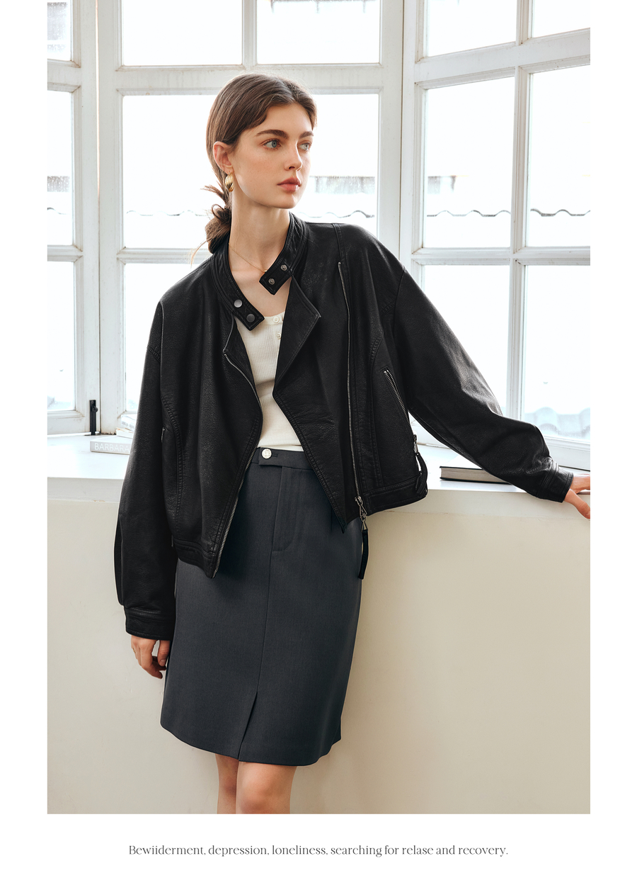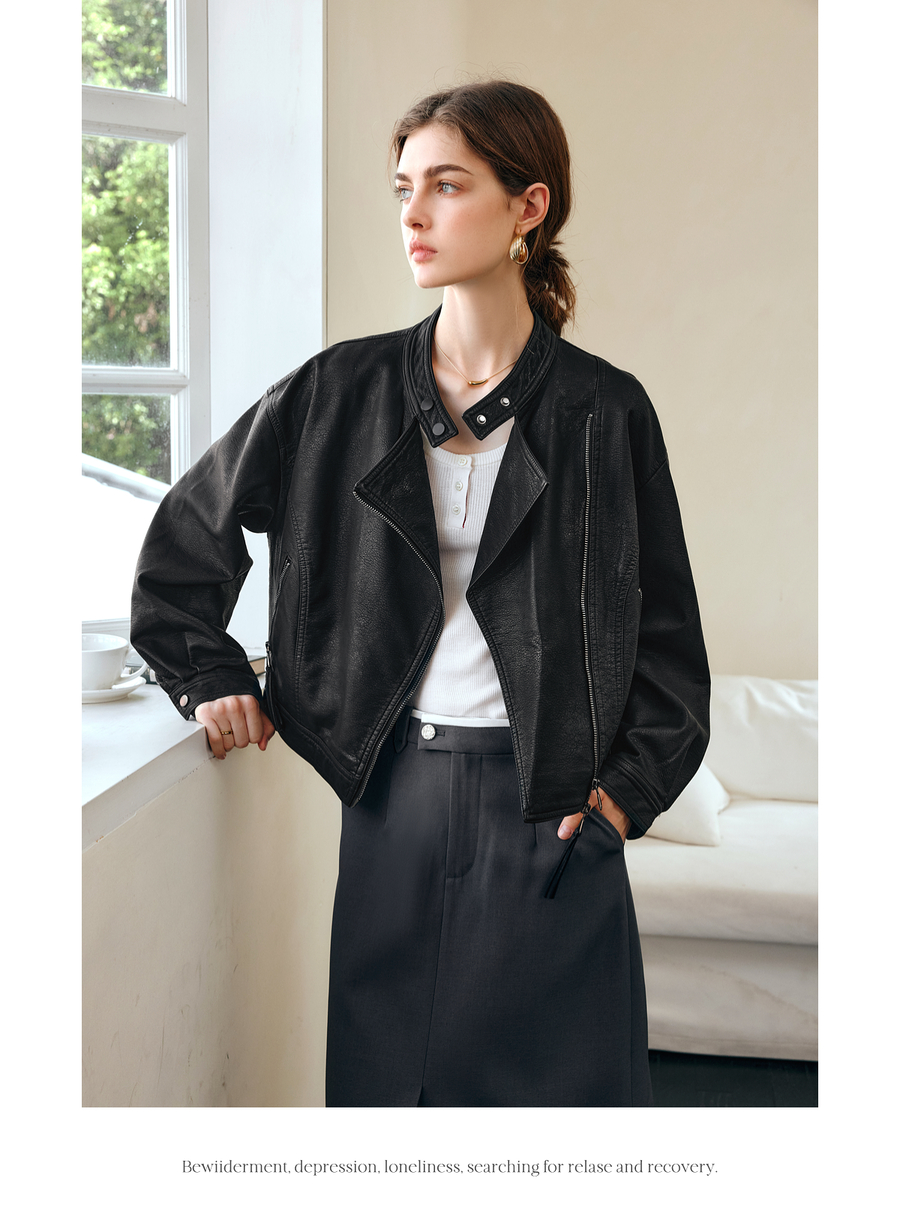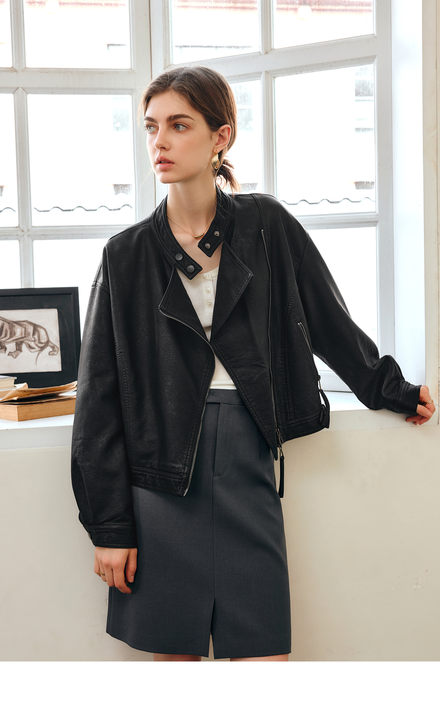 OLrain欧芮儿黑色短外套女秋季2025新款复古设计感不规则夹克皮衣