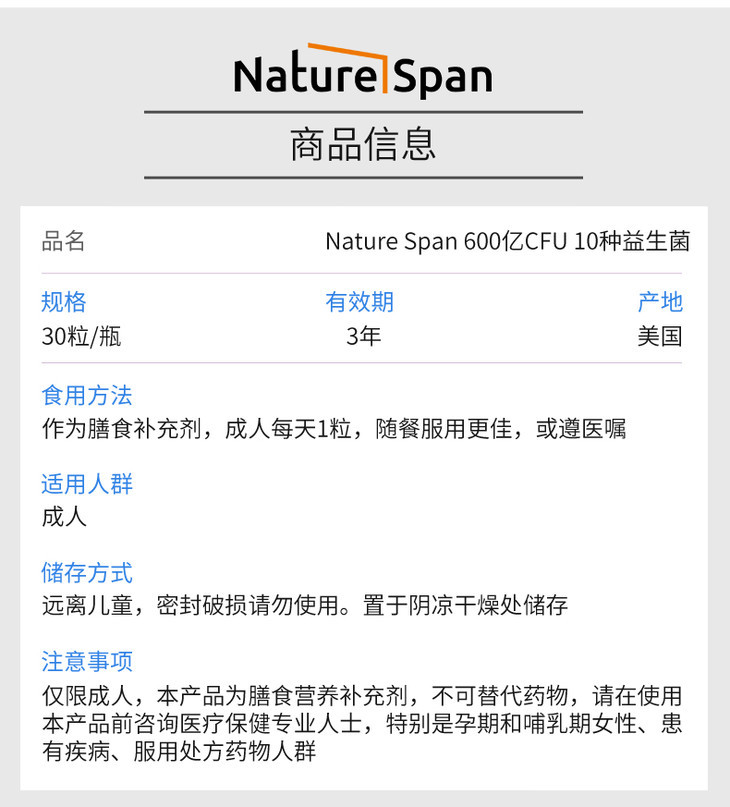 10种超级复合益生菌600亿活菌肠胃道胶囊30粒NatureSpan倍能适