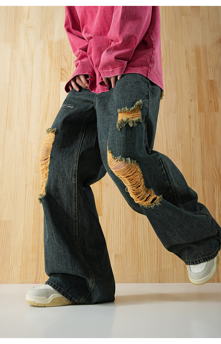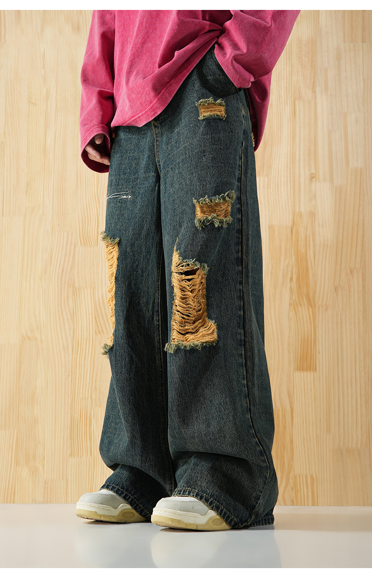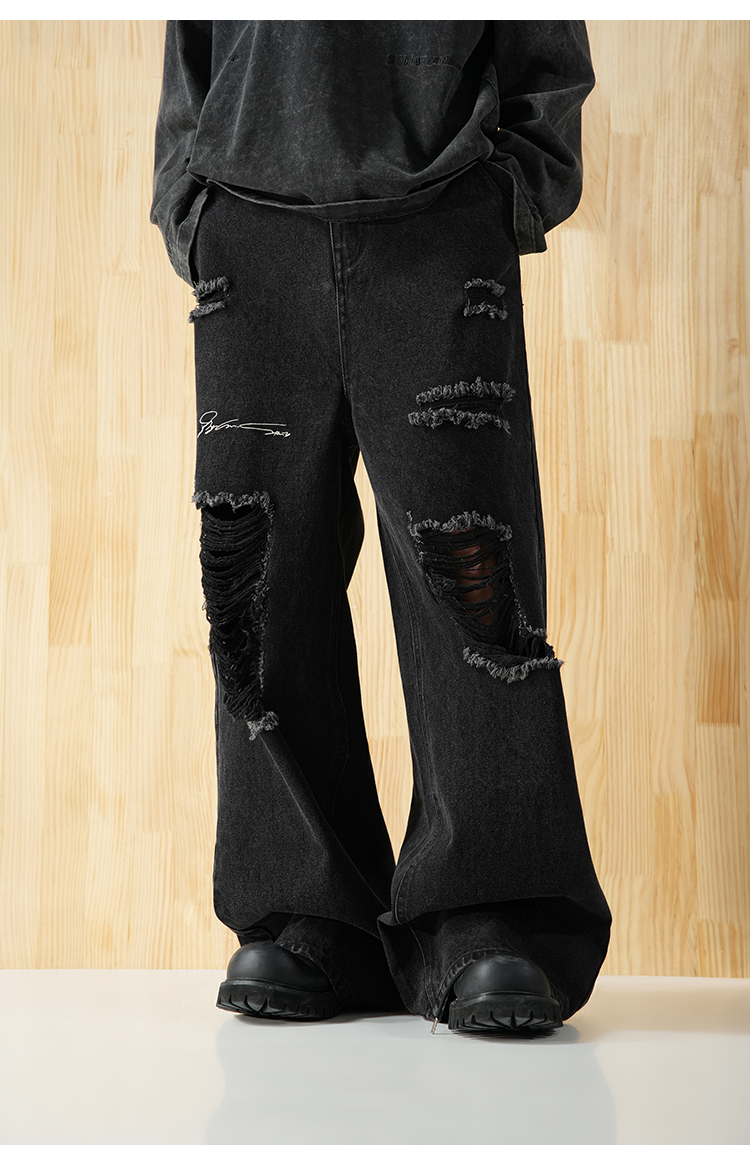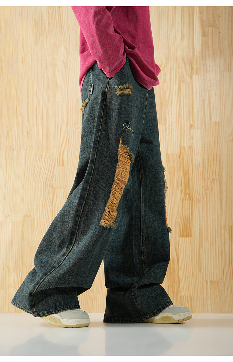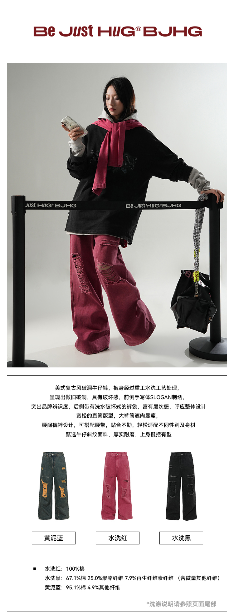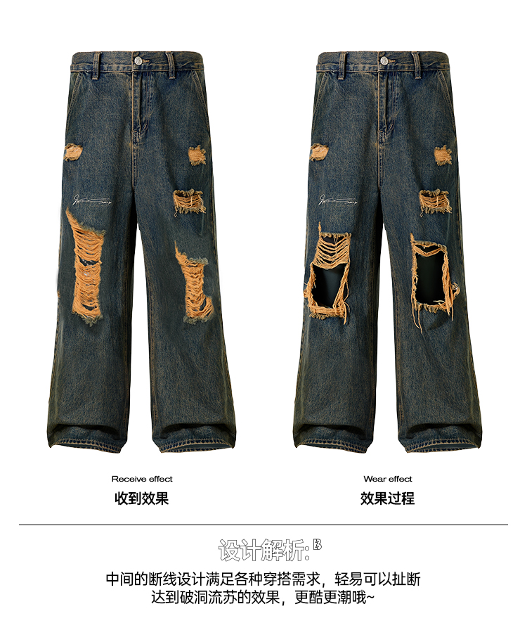 BJHG不计后果直筒牛仔裤美式复古水洗做旧破洞宽松阔腿裤