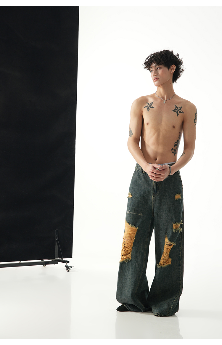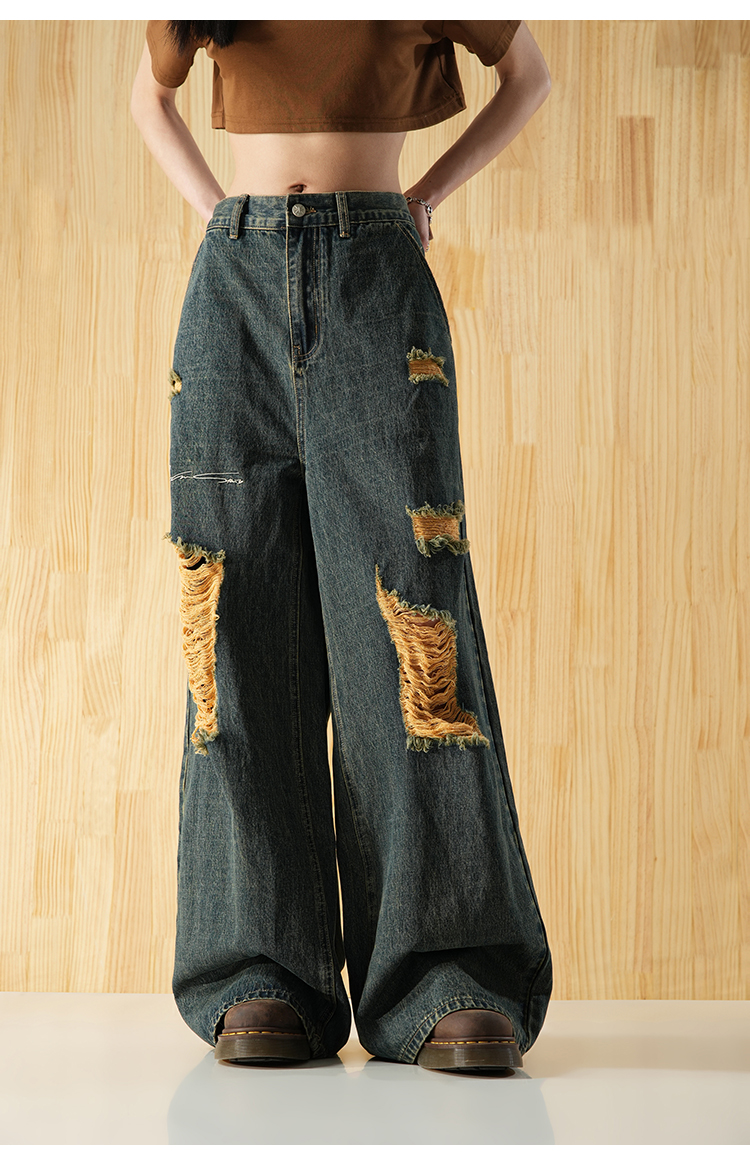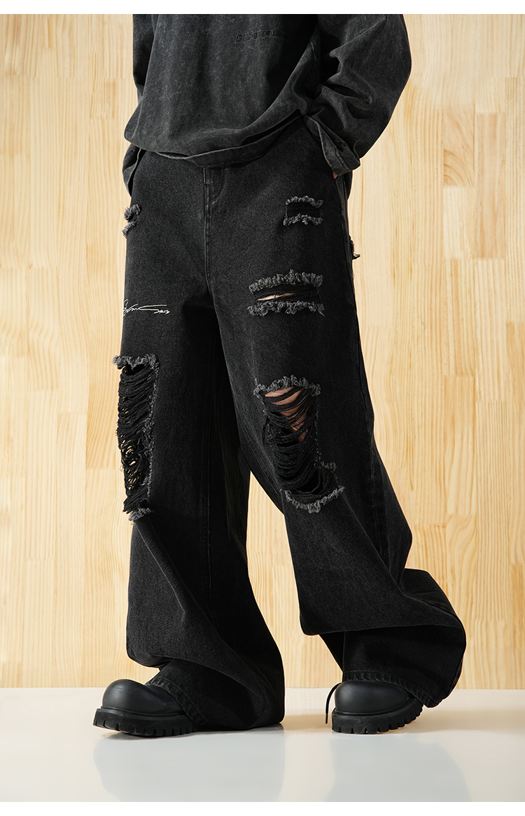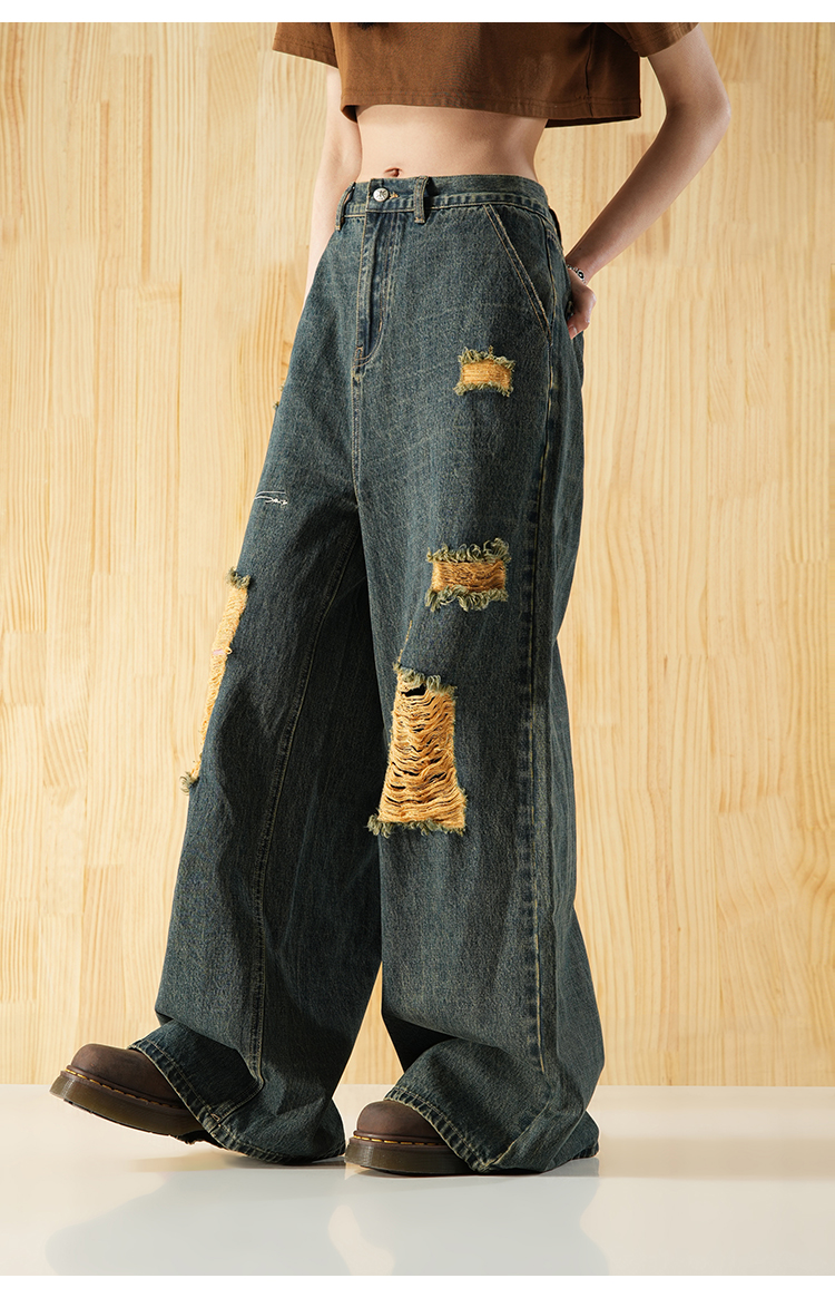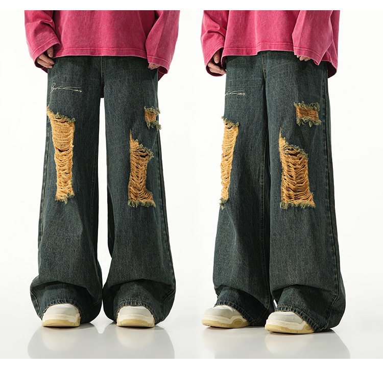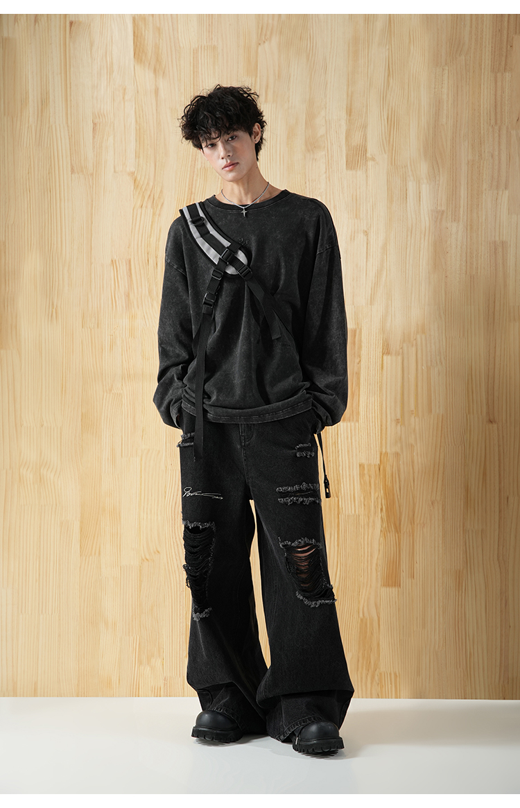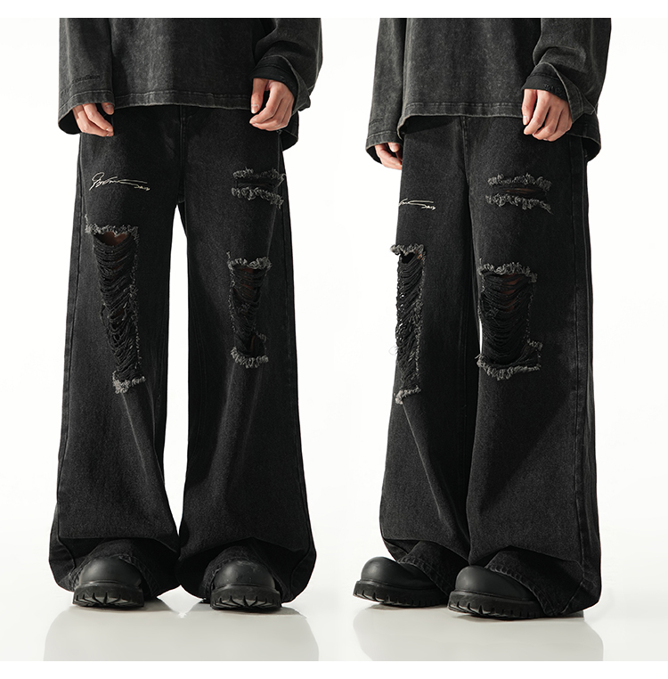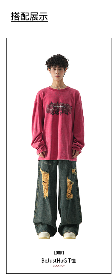 BJHG不计后果直筒牛仔裤美式复古水洗做旧破洞宽松阔腿裤