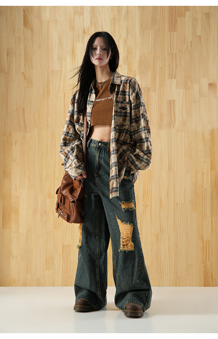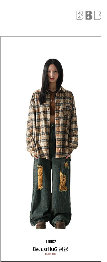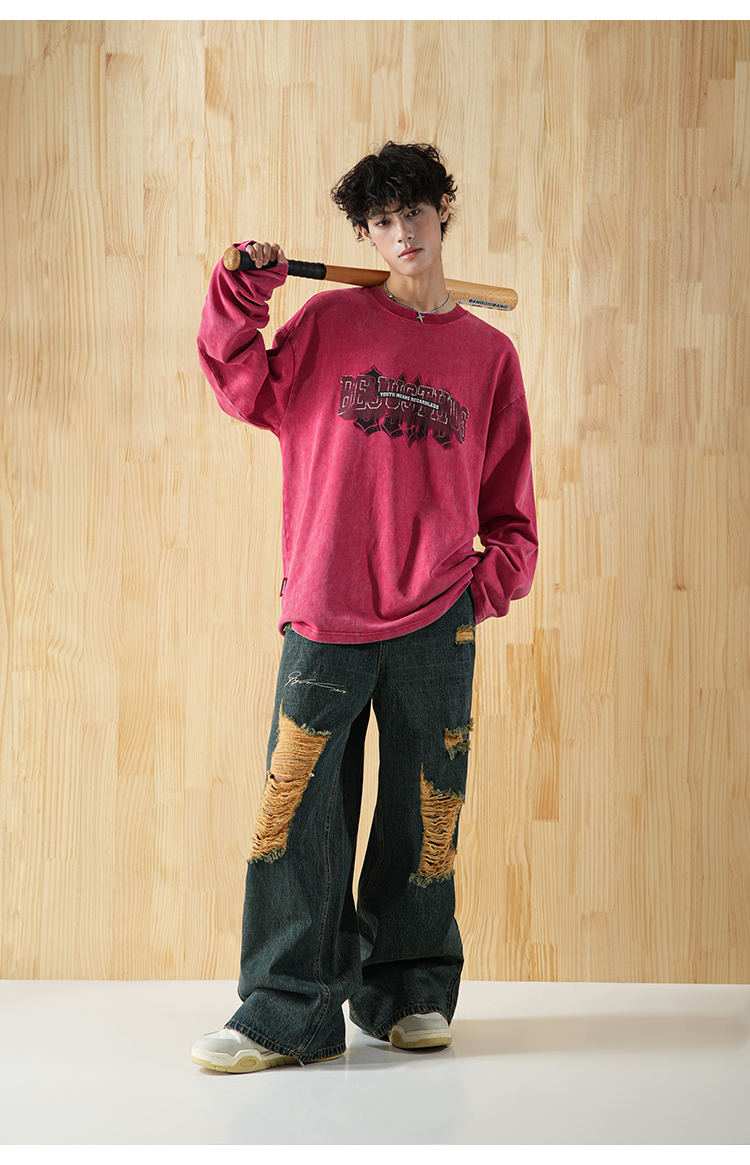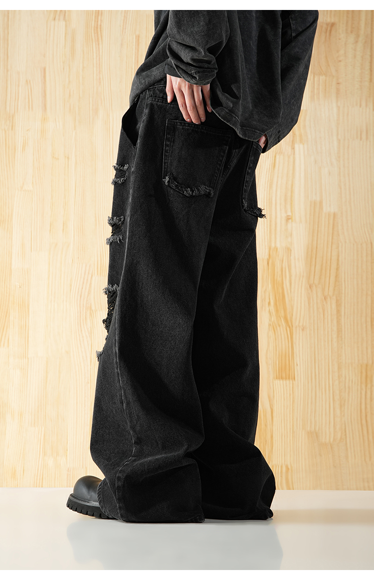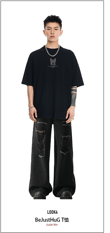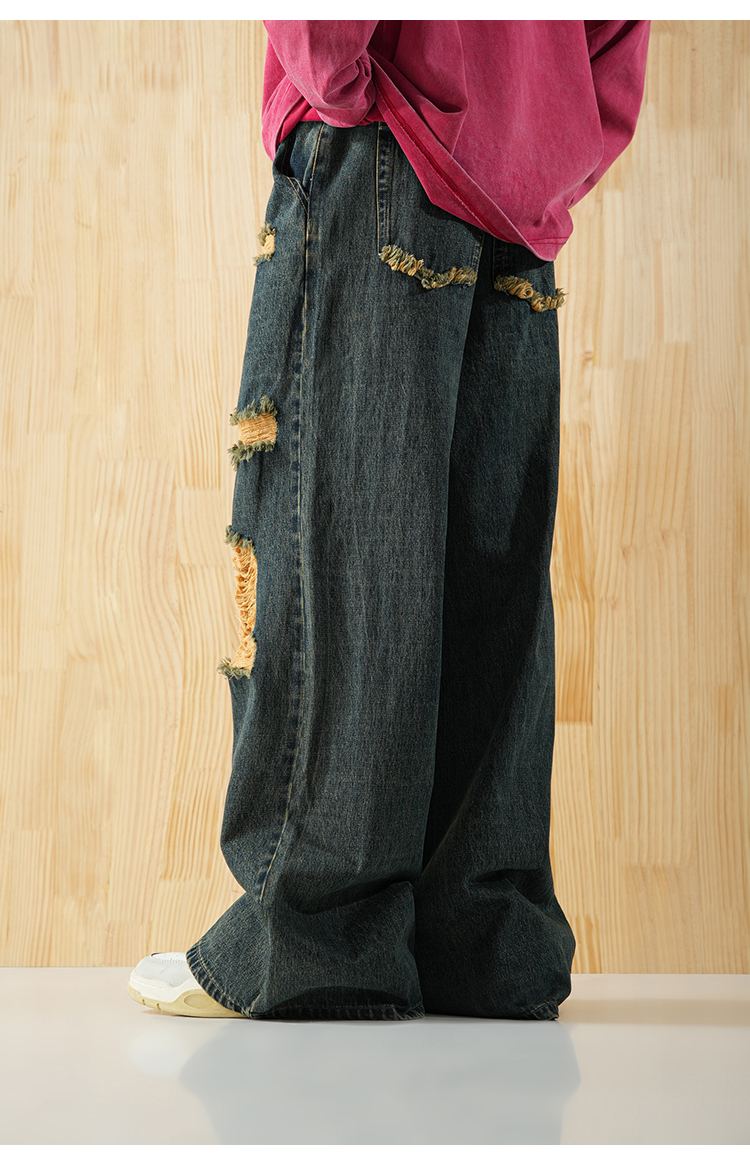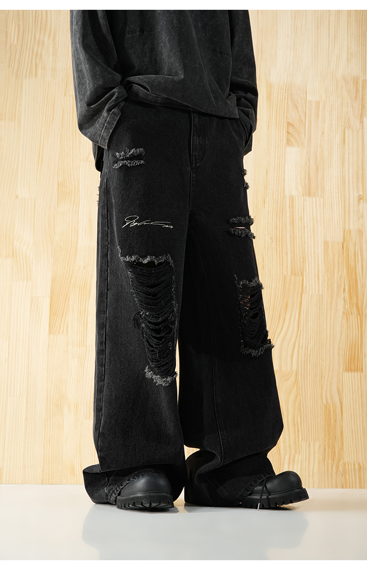 BJHG不计后果直筒牛仔裤美式复古水洗做旧破洞宽松阔腿裤