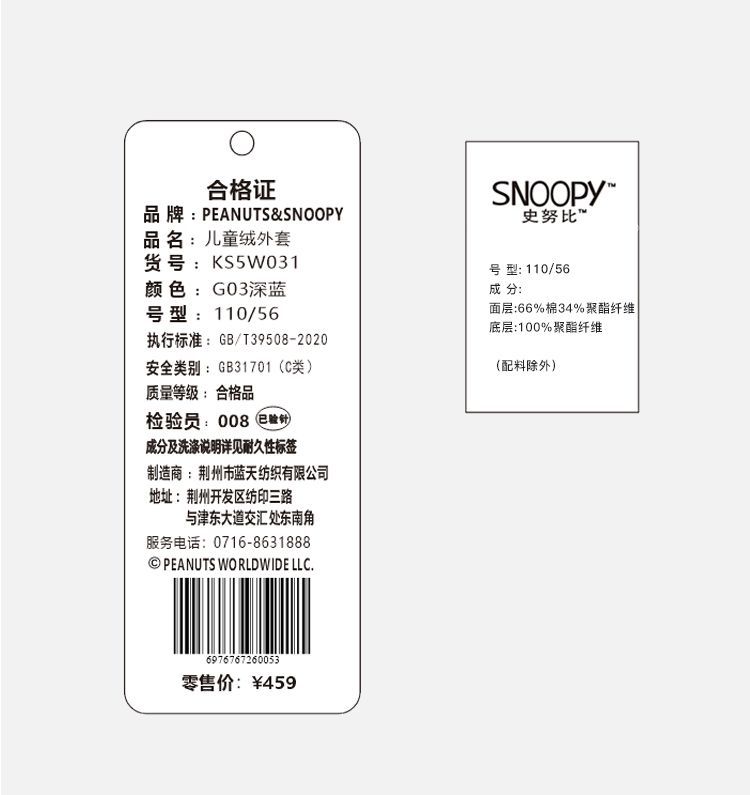 【90-130】【加绒】【史努比】男童冬款加绒连帽外套