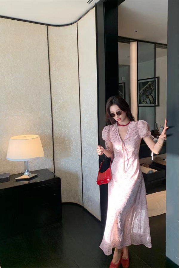 ANSUABEL 韩系粉色V领印花连衣裙 20504