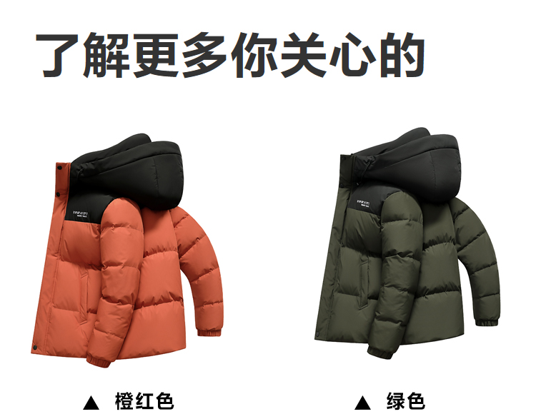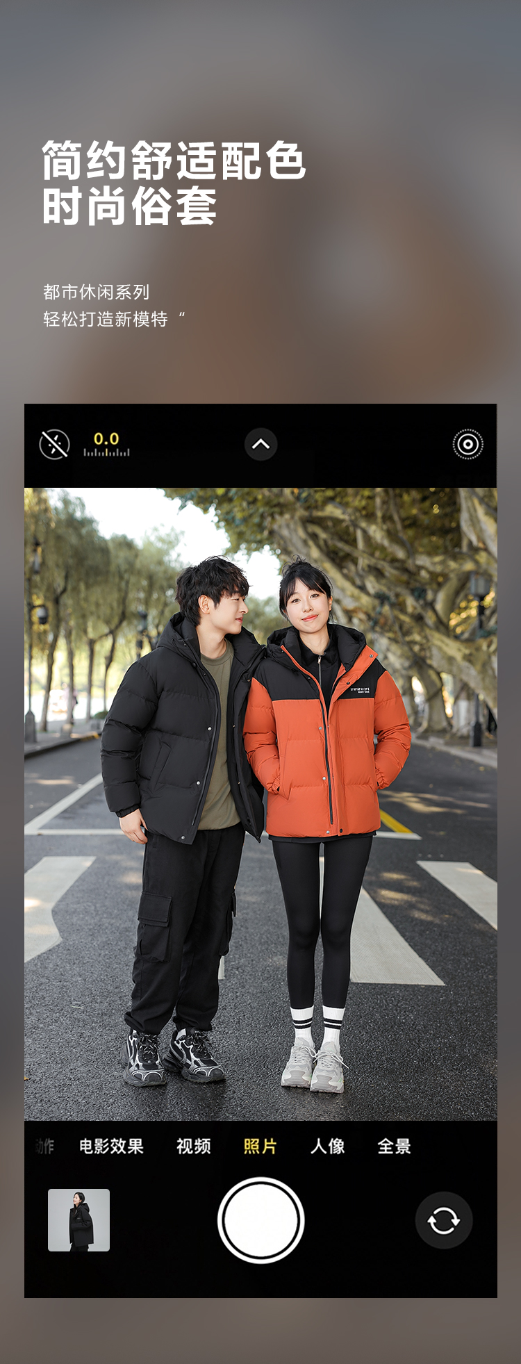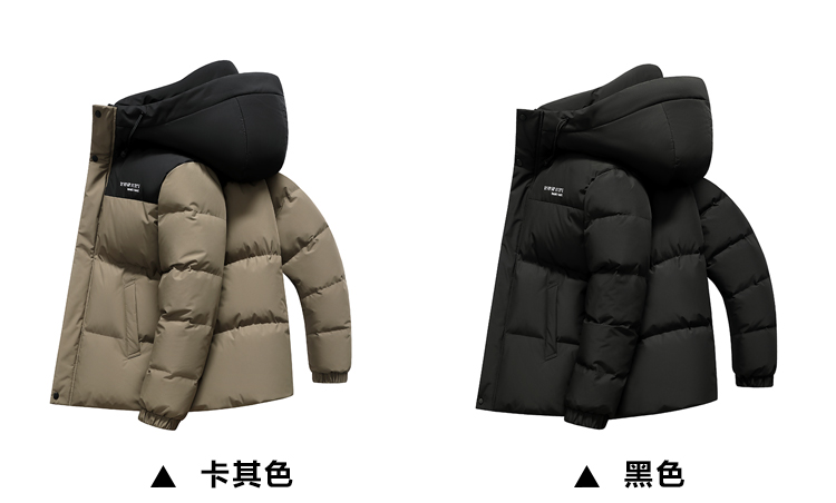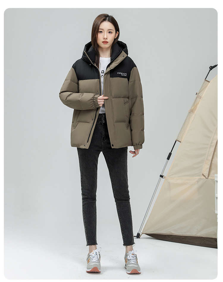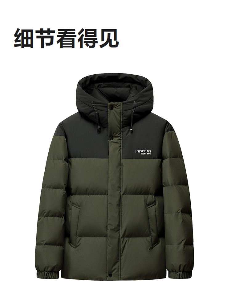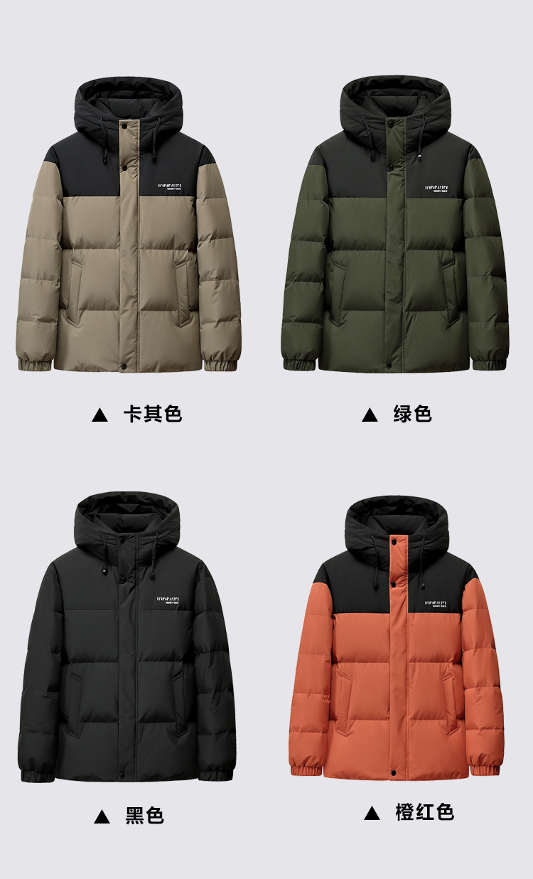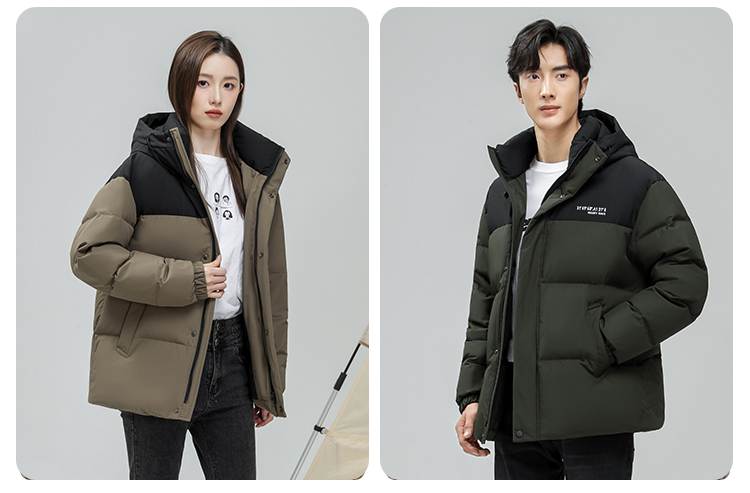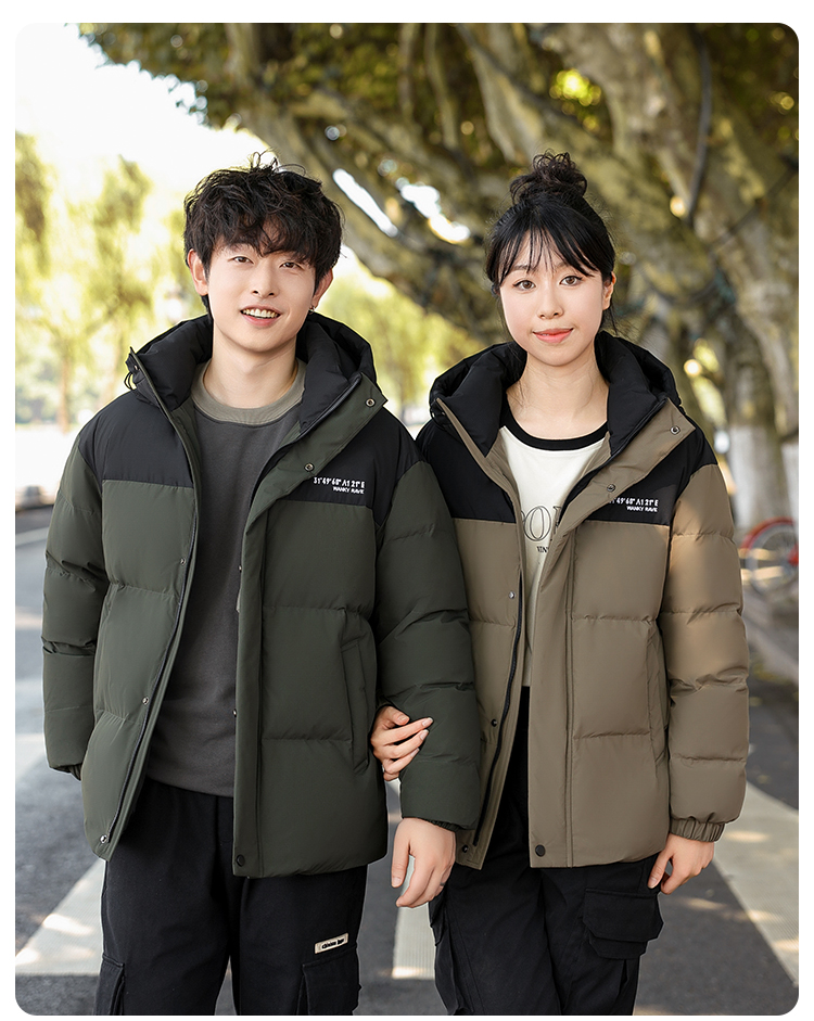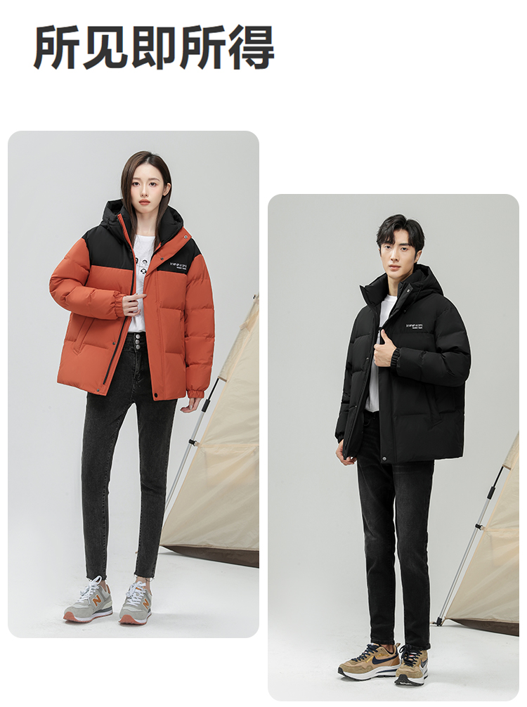 半身缘男女装 冬季男女同款情侣款连帽撞色拼接户外肌理感格纹羽绒服2556